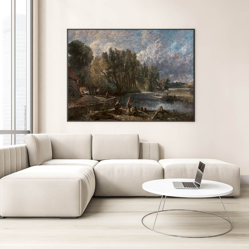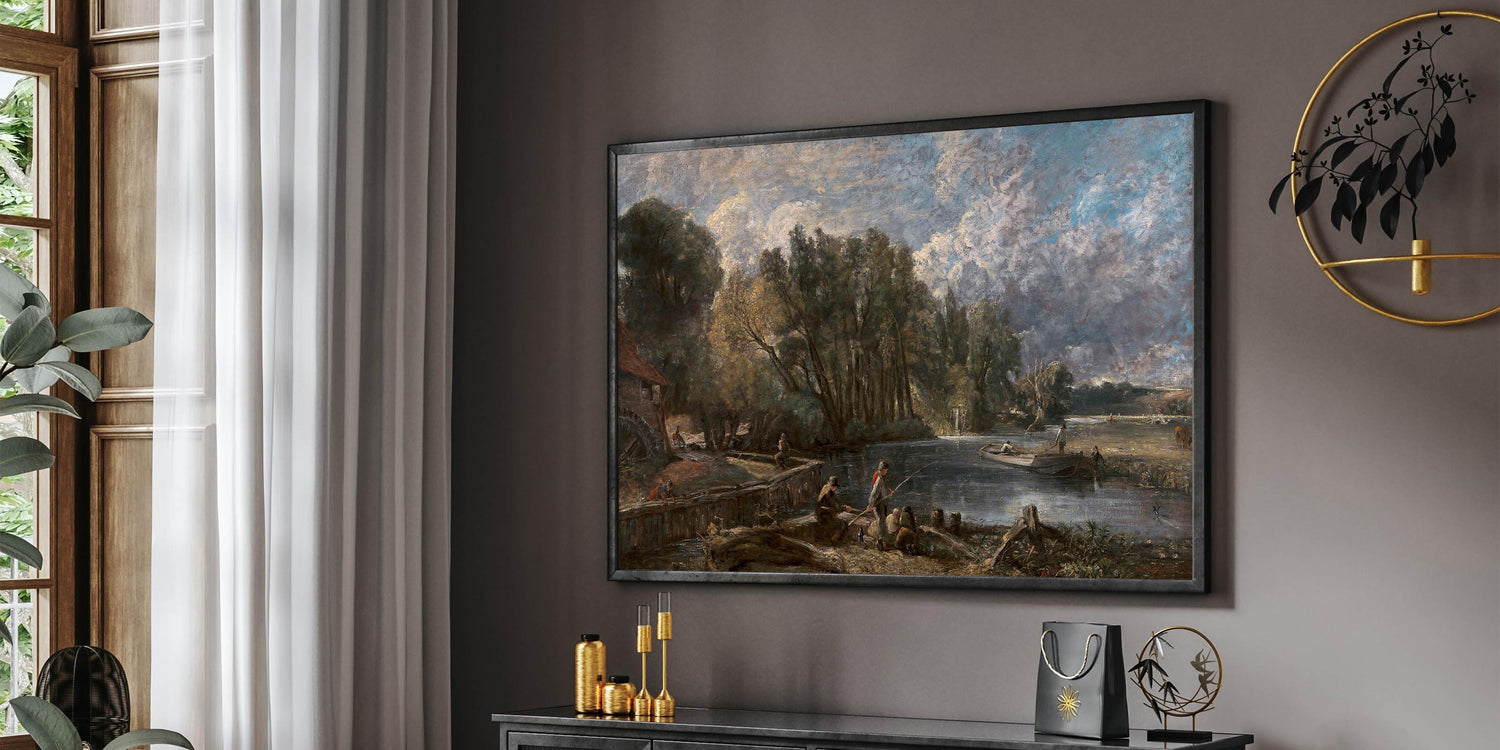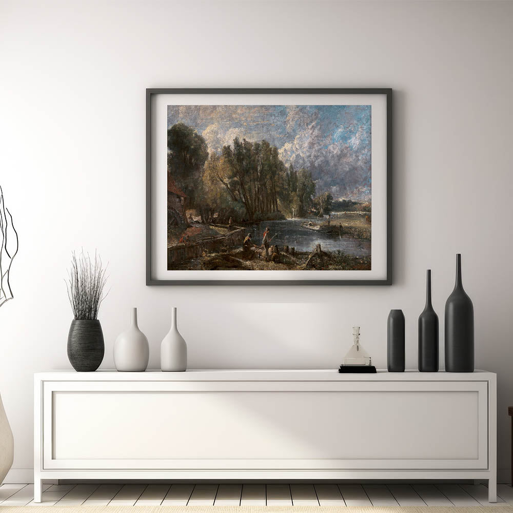 Immerse yourself in the charm of Romanticism with John Constable's breathtaking painting, "Stratford Mill." This masterpiece captures a serene river scene surrounded by lush greenery, a working mill, and figures engaged in daily life, evoking the Romantic era's appreciation for nature and human connection. The dramatic sky and intricate details bring this historic artwork to life, making it a stunning addition to any home or office.