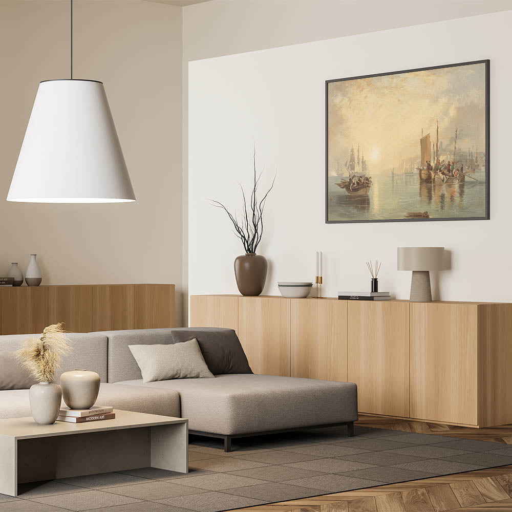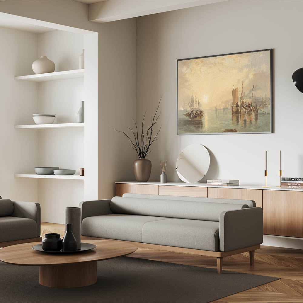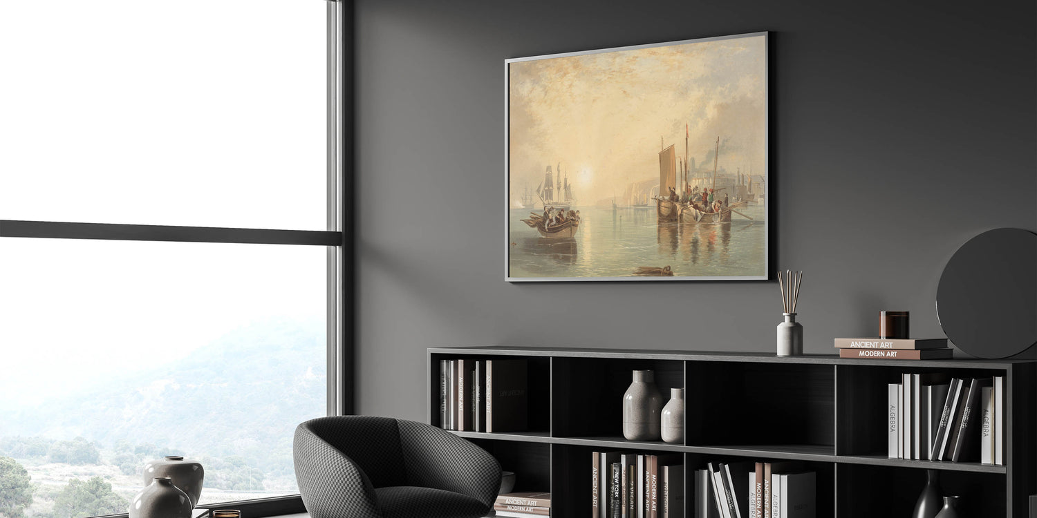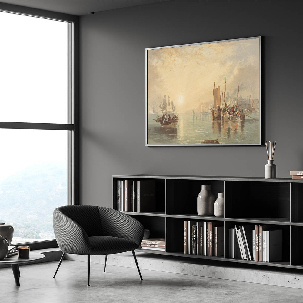 Capture the serene beauty of the Romantic era with Sunrise at Margate, a masterpiece that celebrates the harmony between nature and human life. This artwork depicts a tranquil coastal scene, where sunlight dances on calm waters, illuminating the boats and figures immersed in daily life. The soft, golden tones and meticulous details create a calming yet dynamic ambiance, reflecting the Romantic movement's emphasis on natural beauty and emotion.