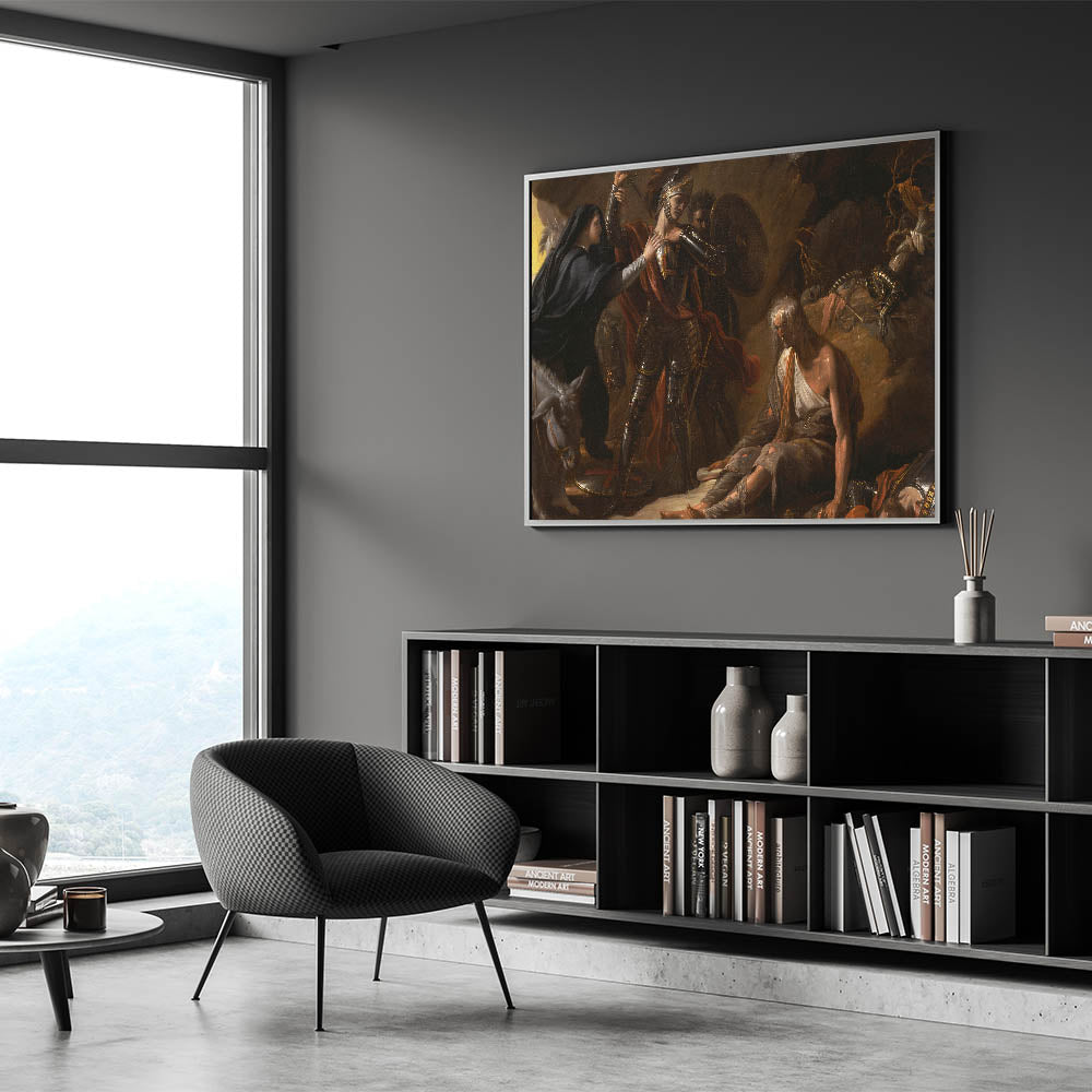Step into the drama and emotion of Romanticism with The Cave of Despair. This captivating painting showcases a powerful moment of conflict and salvation. A richly armored knight, guided by a compassionate nun, confronts despair personified by a weary and defeated figure. The dark, cavernous background and scattered remnants of battle add a sense of foreboding, while the knight's resolve and the nun’s guidance suggest hope amidst adversity. This artwork epitomizes the Romantic era’s fascination with human struggle, morality, and redemption.