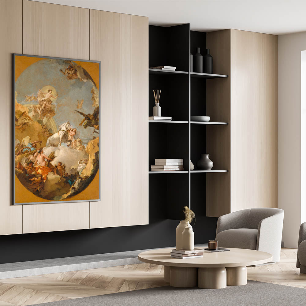 Adorn your space with the grandeur of Romanticism style wall art with this captivating depiction of The Chariot of Aurora by Giovanni Battista Tiepolo. This masterpiece embodies the opulence and drama of the classic art of the Romantic era, showcasing Aurora, the goddess of dawn, in her celestial chariot surrounded by cherubs, gods, and mythical creatures. The swirling composition, radiant colors, and divine imagery create a scene of transcendental beauty and movement.