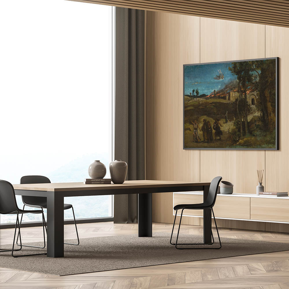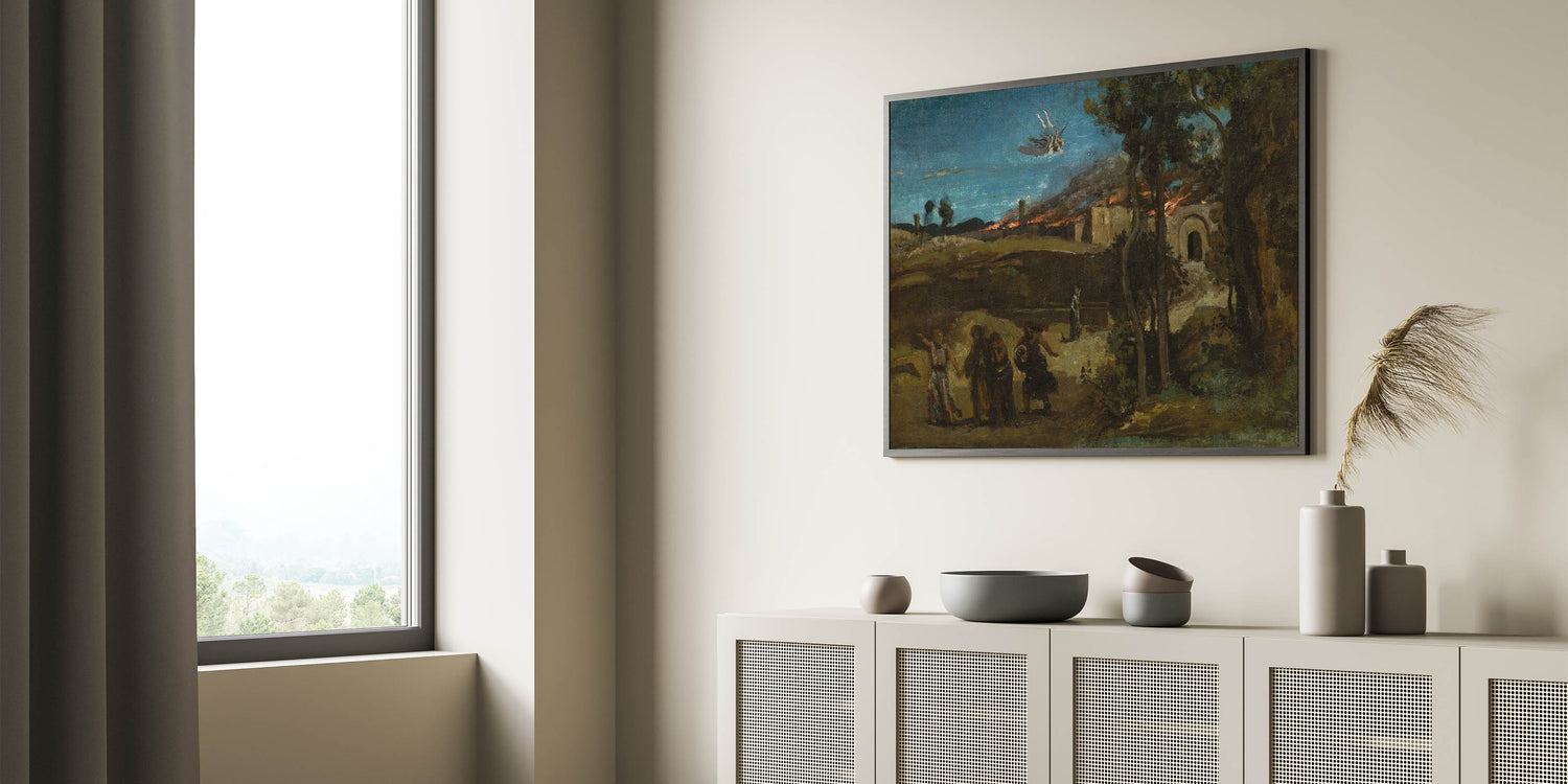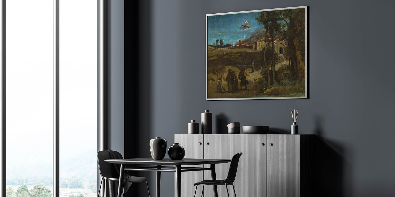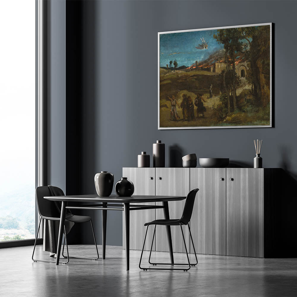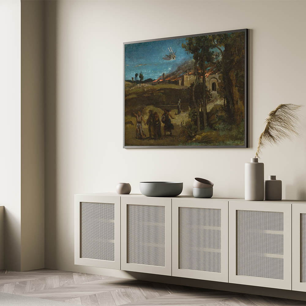 Immerse yourself in the dramatic intensity of the Romantic era with Camille Corot's Study for The Destruction of Sodom. This powerful painting captures the emotional and sublime essence of Romanticism, depicting the momentous destruction of Sodom with fiery skies, fleeing figures, and an angelic presence. The dark tones and vivid details evoke awe and reverence for the grandeur of history and nature.