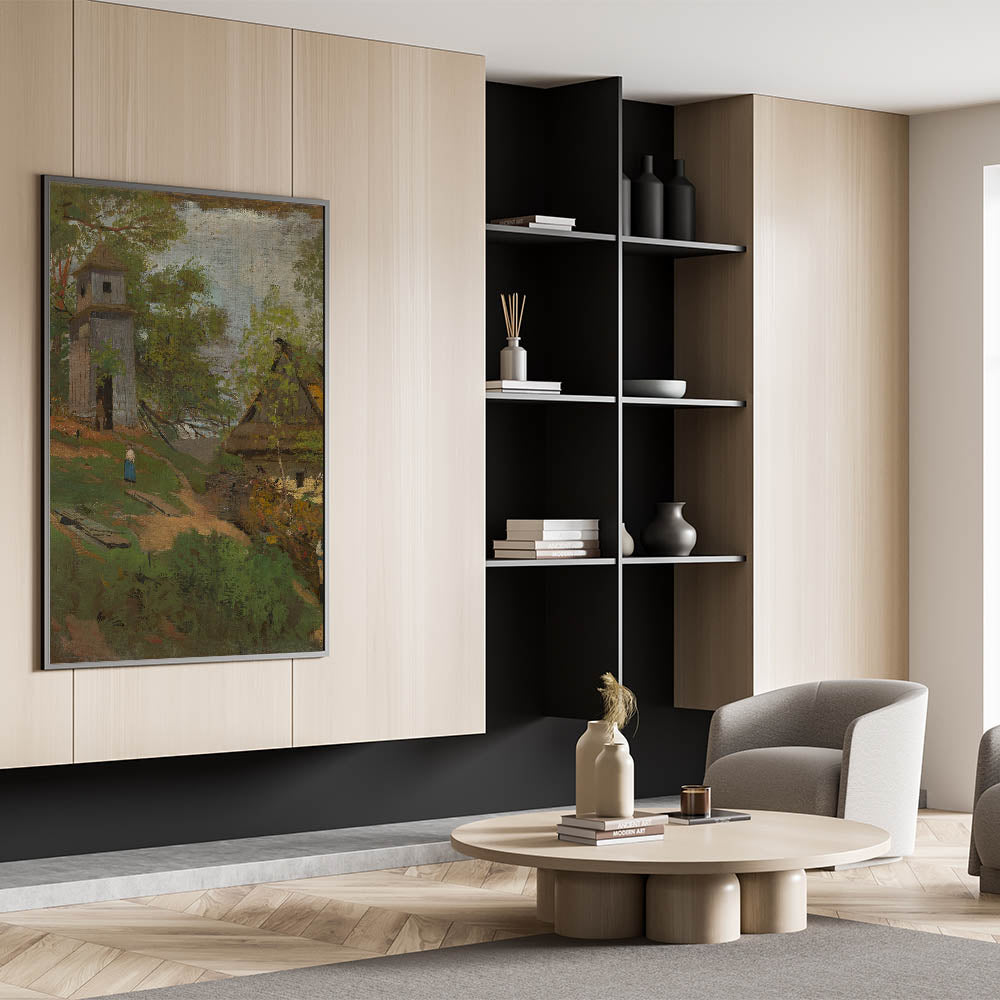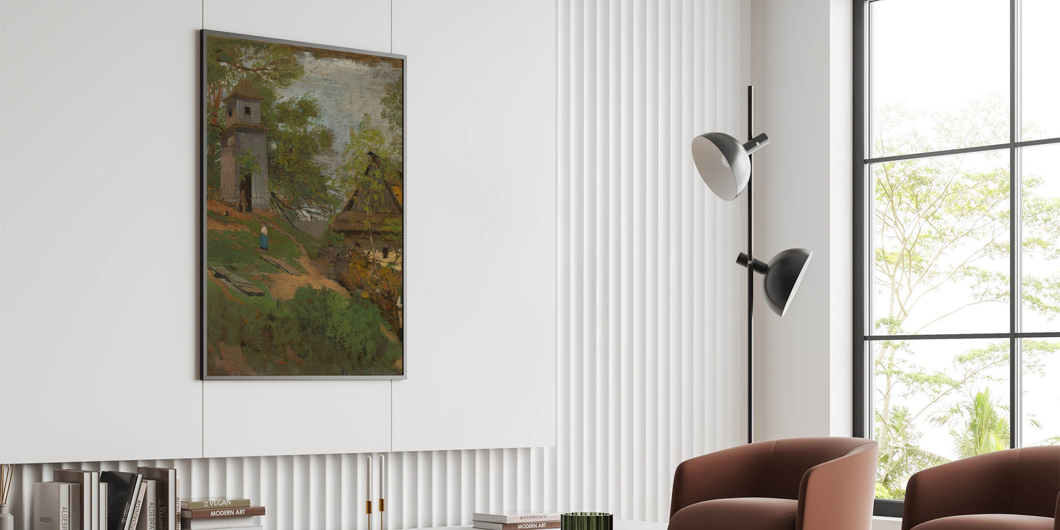 Transform your living space with this evocative Romanticism style wall art showcasing a charming depiction of a wooden belfry and rustic countryside by László Mednyánszky. This piece reflects the serene beauty and emotional depth of the classic art of the Romantic era, emphasizing humanity's connection to nature and tradition.