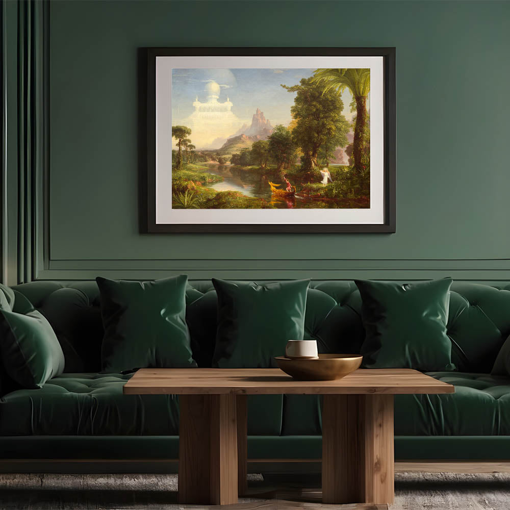 Step into a world of timeless beauty with The Ages of Life: Youth by Thomas Cole. This breathtaking masterpiece encapsulates the innocence and optimism of youth, symbolized through an idyllic landscape. Featuring lush greenery, serene waters, and a majestic temple in the distance, this artwork reflects Cole's mastery of the Hudson River School style and his deep connection to nature.