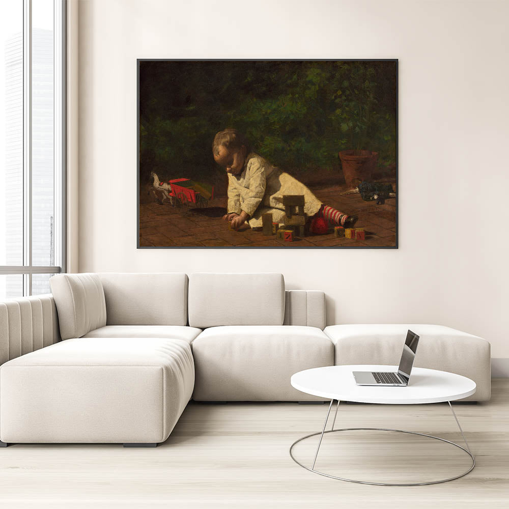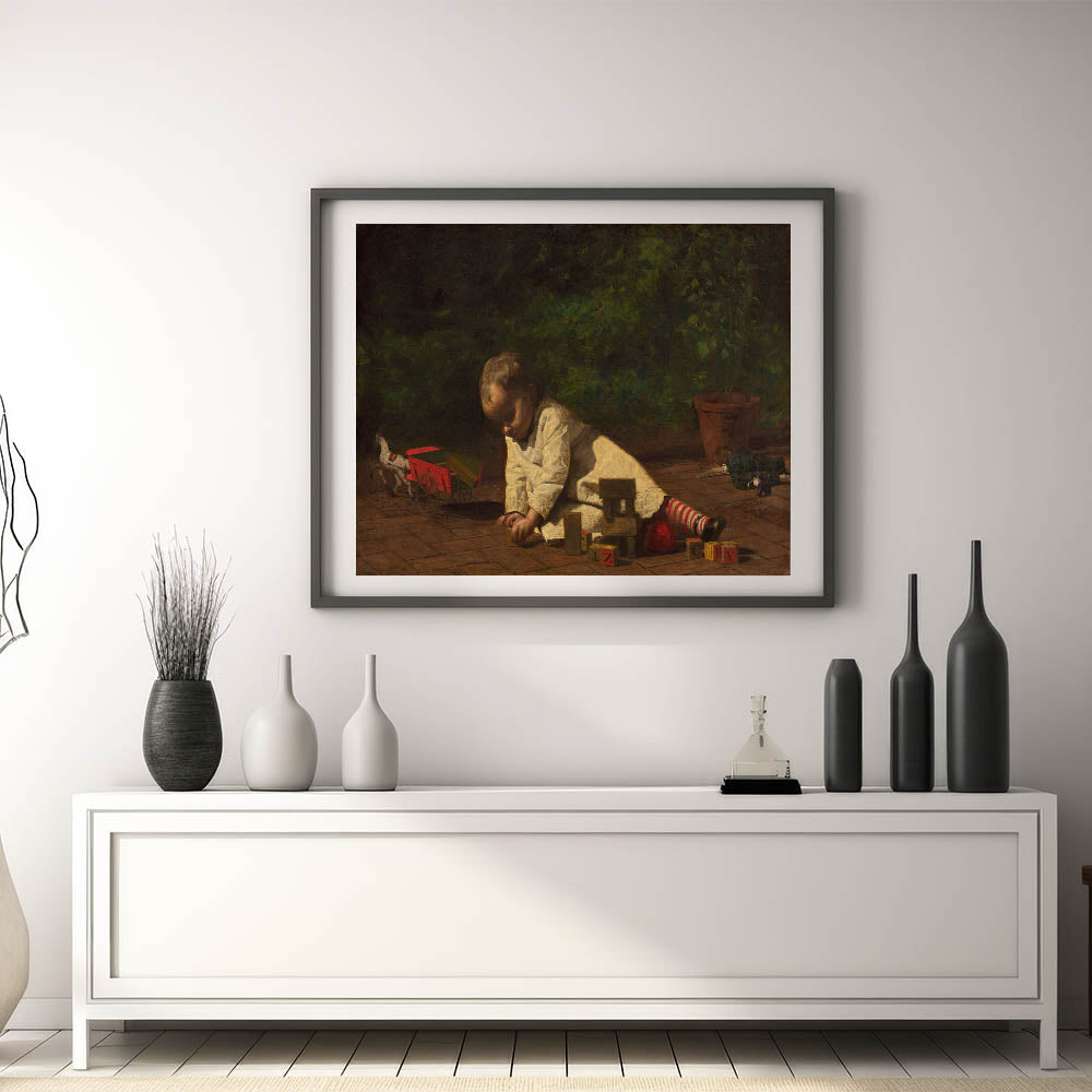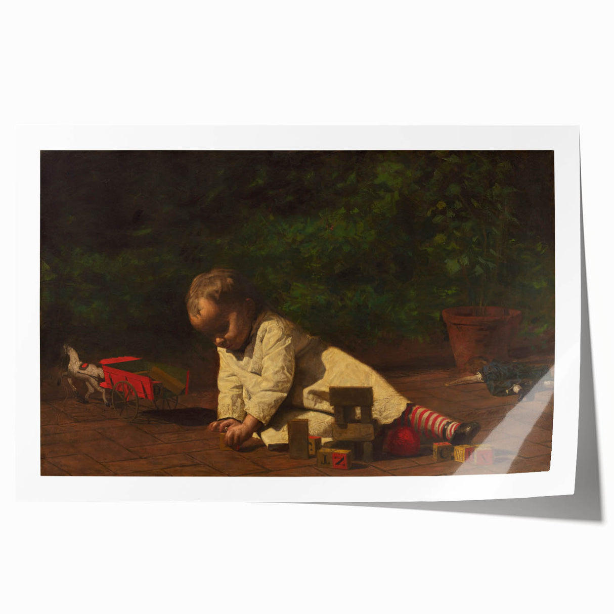 Experience the intimate charm of "Child at Play," a captivating Realism Art Print by the acclaimed Thomas Eakins. This piece captures a tranquil moment of a child deeply engaged with traditional wooden toys, rendered in Eakins' renowned detailed style. Perfect for adding a nostalgic and artistic touch to any room.