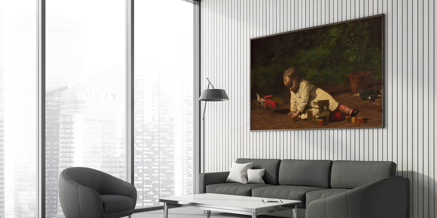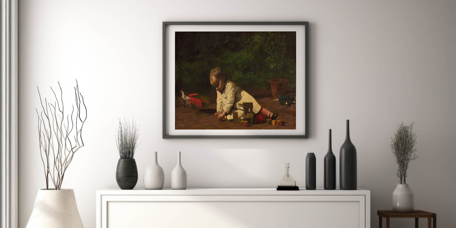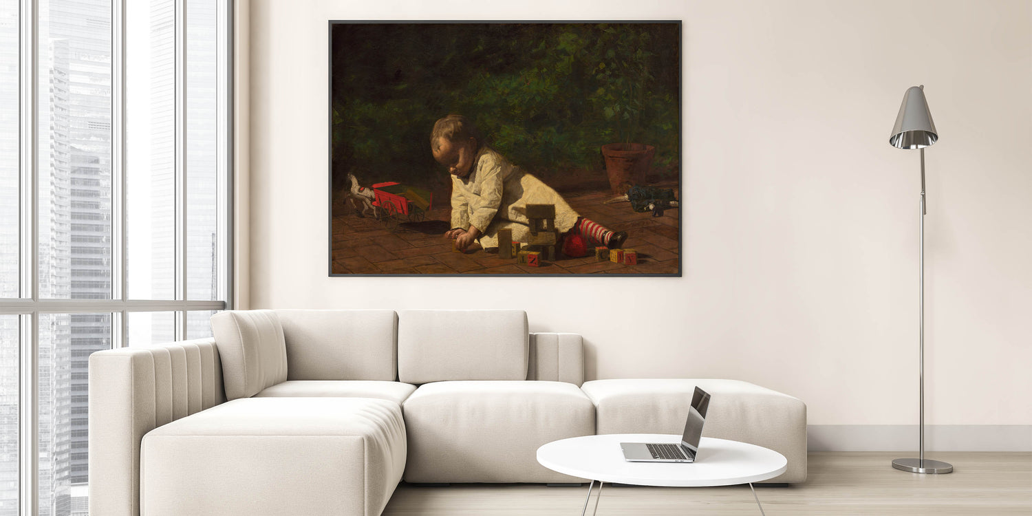 Experience the intimate charm of "Child at Play," a captivating Realism Art Print by the acclaimed Thomas Eakins. This piece captures a tranquil moment of a child deeply engaged with traditional wooden toys, rendered in Eakins' renowned detailed style. Perfect for adding a nostalgic and artistic touch to any room.