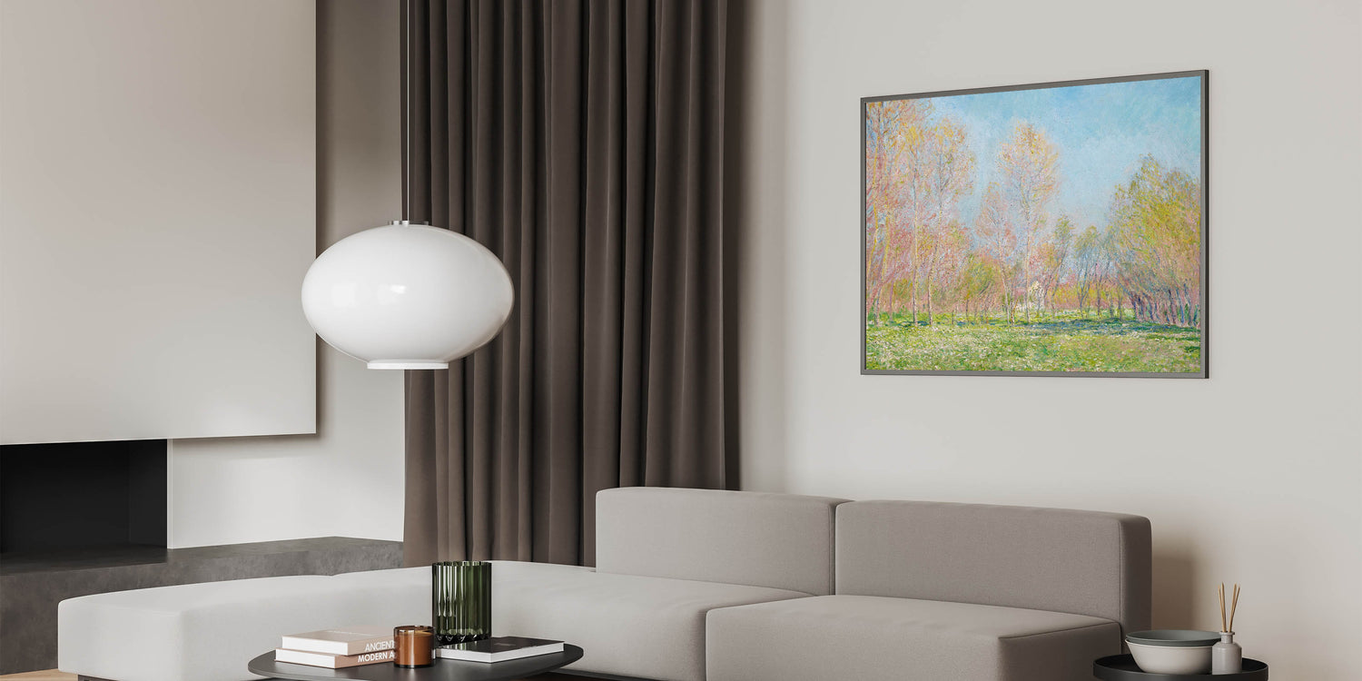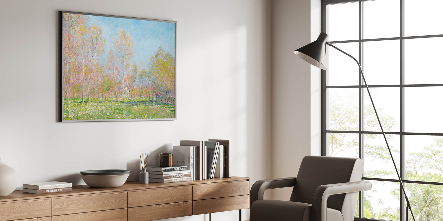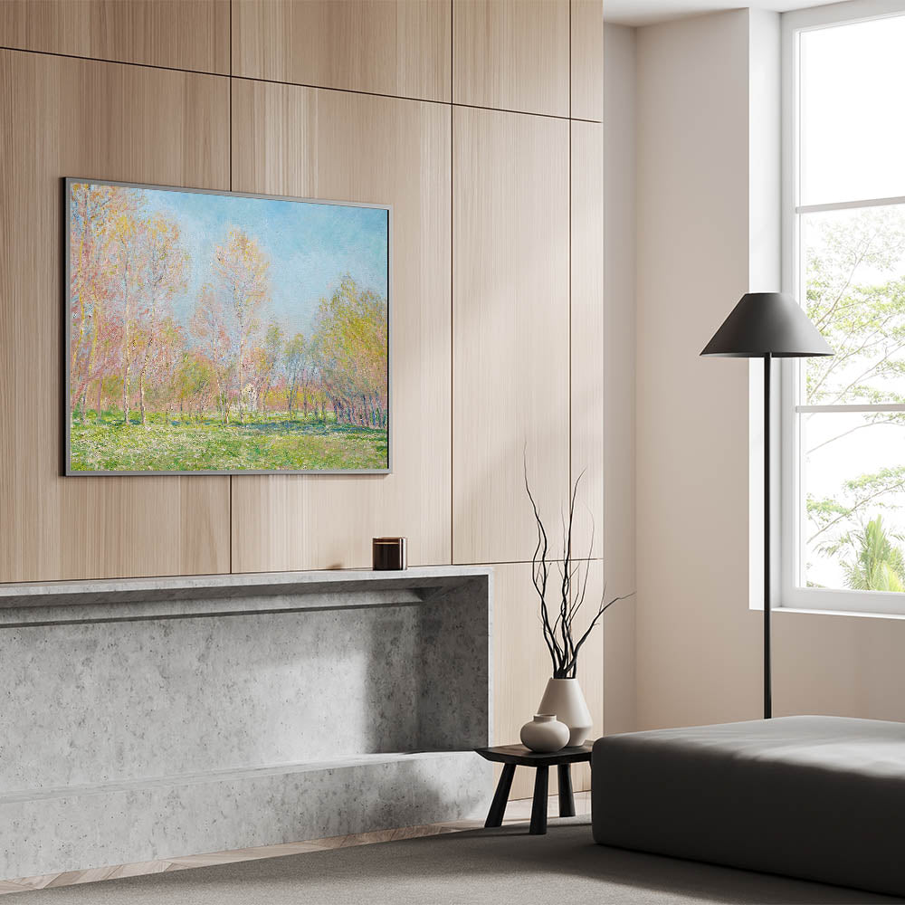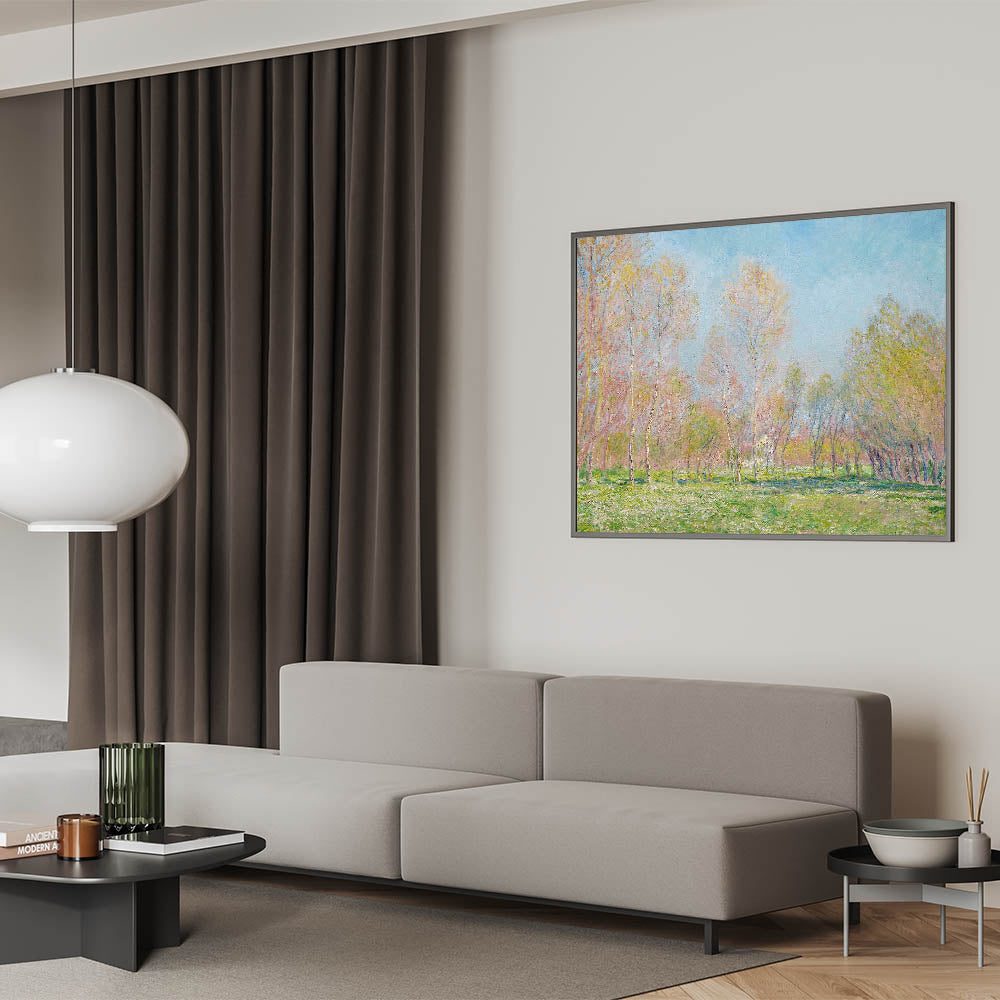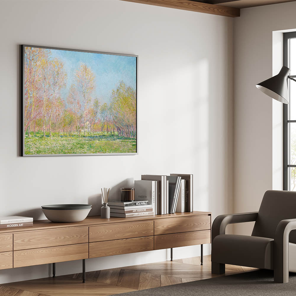 Celebrate the beauty of spring with this Impressionist wall art inspired by Claude Monet's Spring in Giverny. This painting captures a serene meadow scene under a soft blue sky, with blossoming trees in delicate shades of pink, green, and yellow. Monet’s light, expressive brushstrokes bring a sense of renewal and tranquility to the landscape, making it an ideal piece for any nature lover.