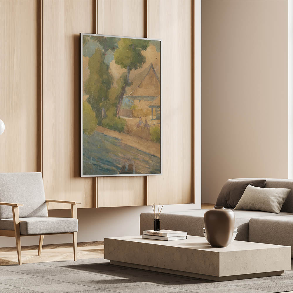 By the Water by Lajos Csordák presents a serene, rustic scene of a quaint riverside cottage surrounded by lush green trees. The muted, earthy tones combined with soft blues capture the simplicity and tranquility of rural life. Csordák’s use of impressionistic brushstrokes brings texture to the foliage and water, creating a dreamlike atmosphere that draws the viewer into this idyllic countryside.