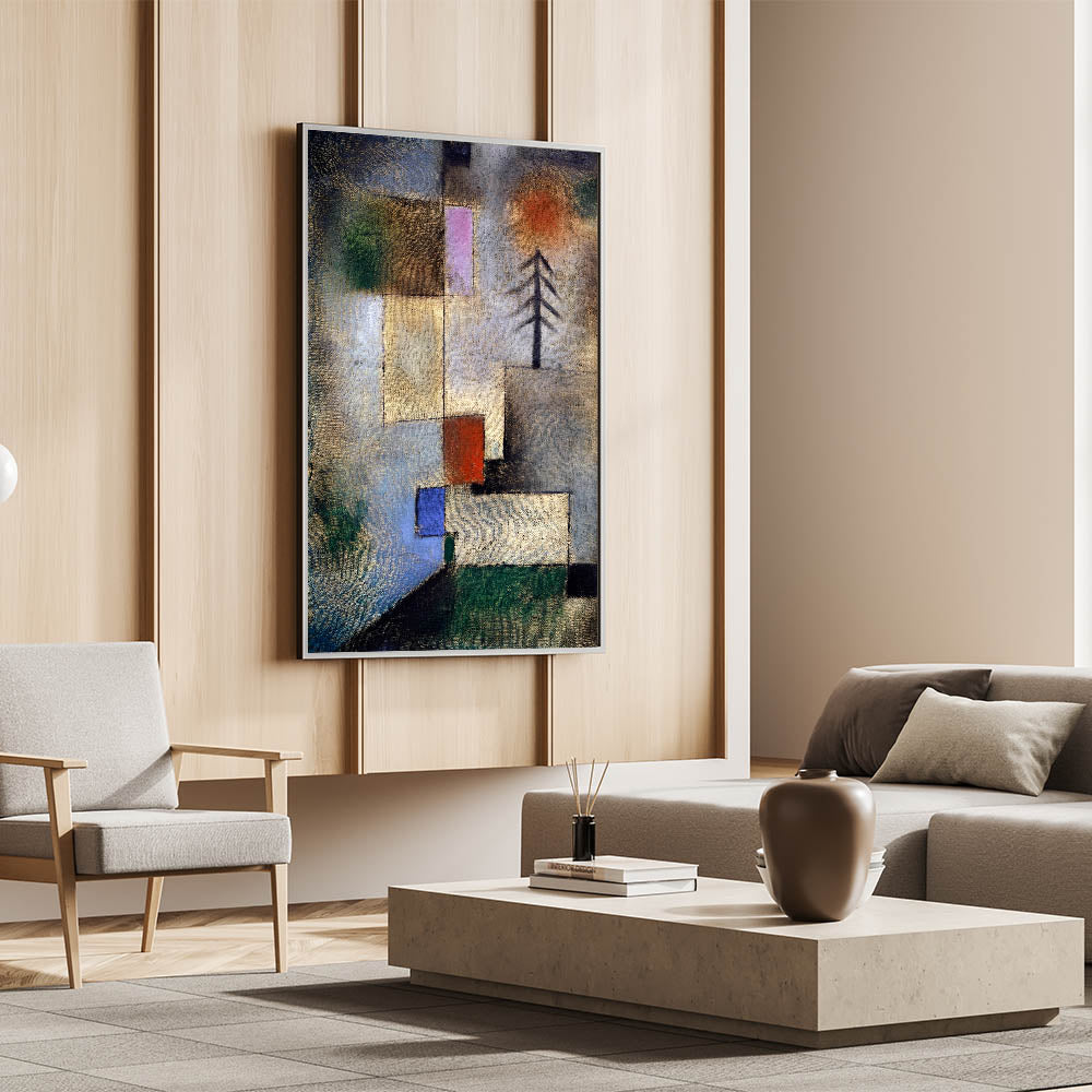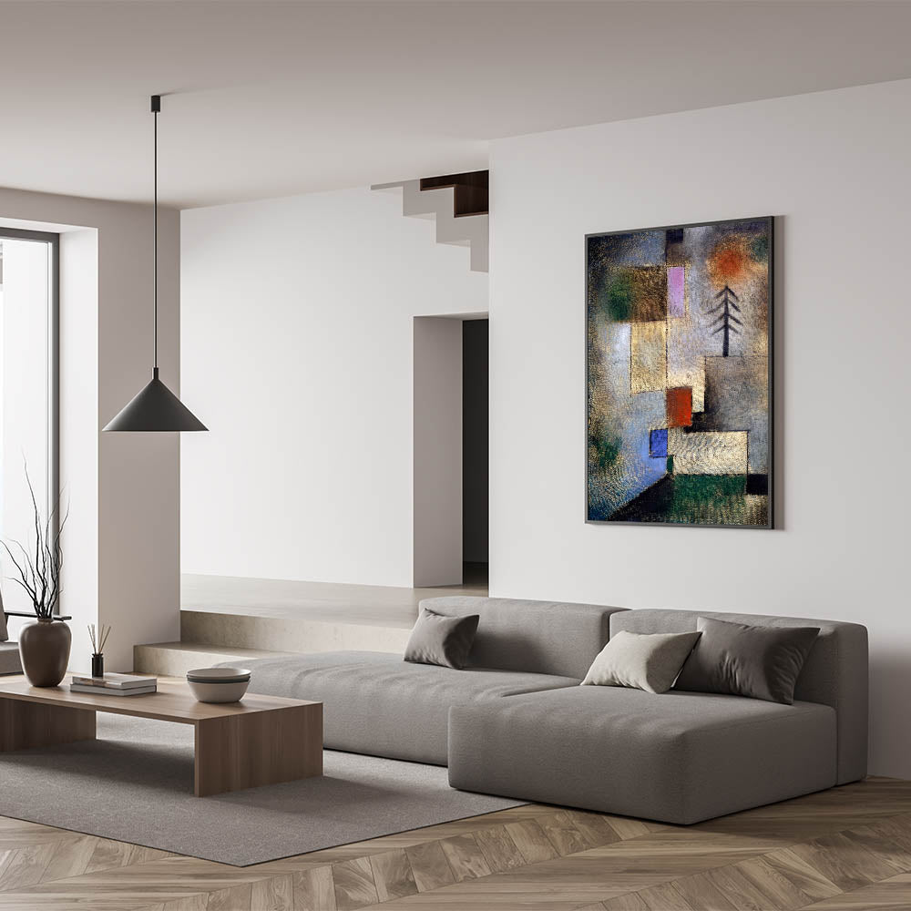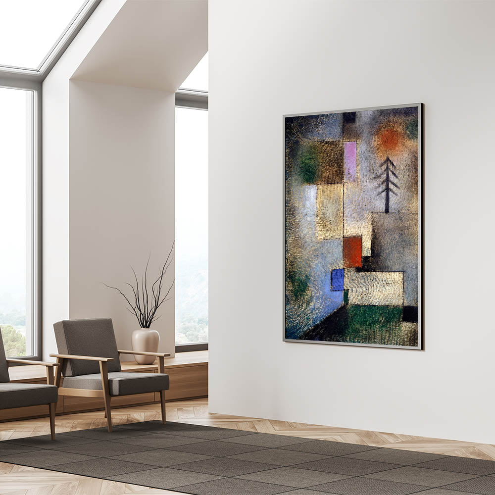 Enhance your space with this Modern Wall Art piece, an abstract composition featuring geometric shapes and a delicate fir tree silhouette. Inspired by Paul Klee's unique blend of color and form, this artwork offers a calming palette of earthy tones, soft blues, and warm accents, making it ideal for Minimalist Modern Decor. The balance of shapes and subtle colors adds a tranquil touch to any room, making it a versatile piece for modern interiors.