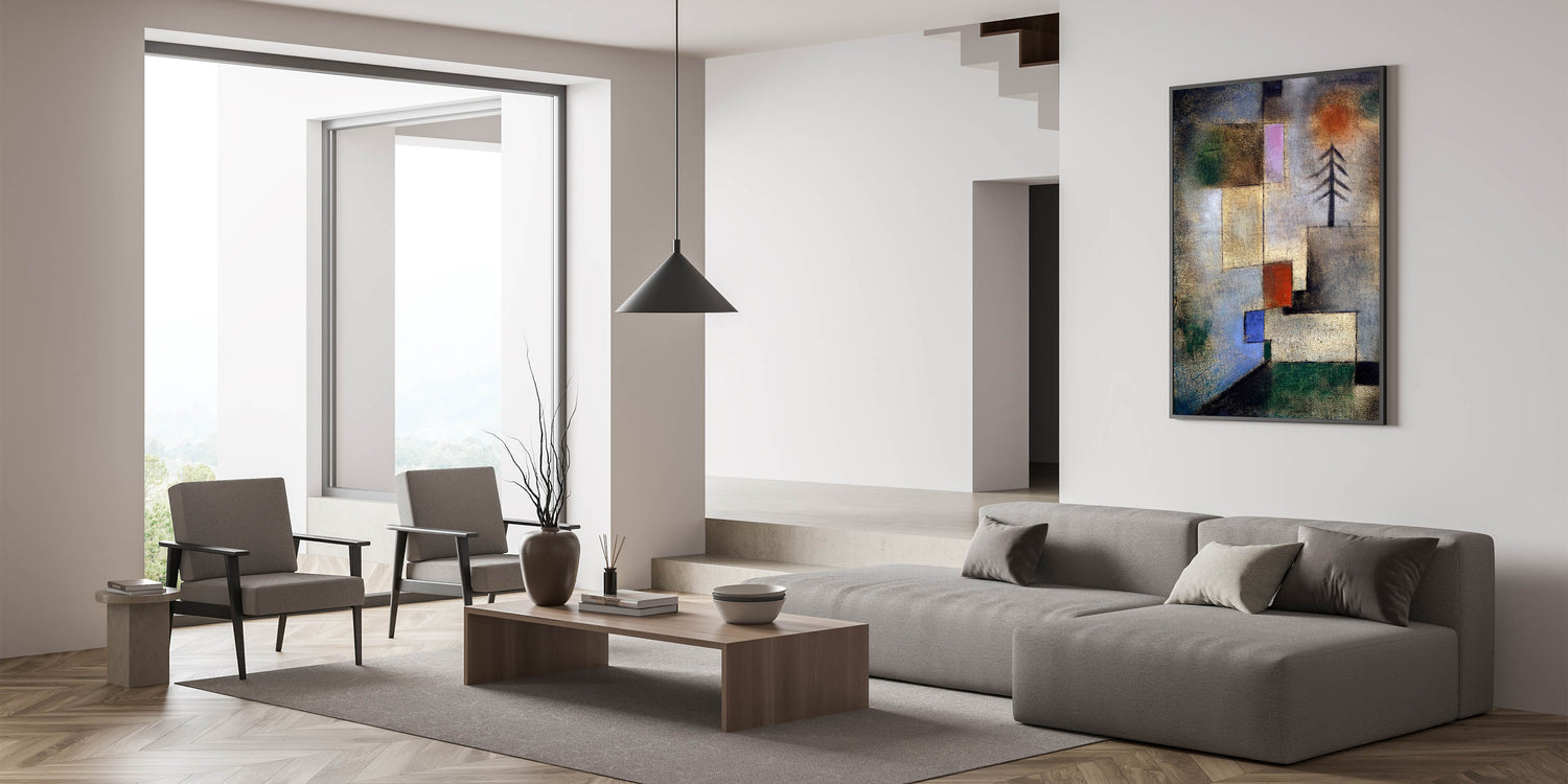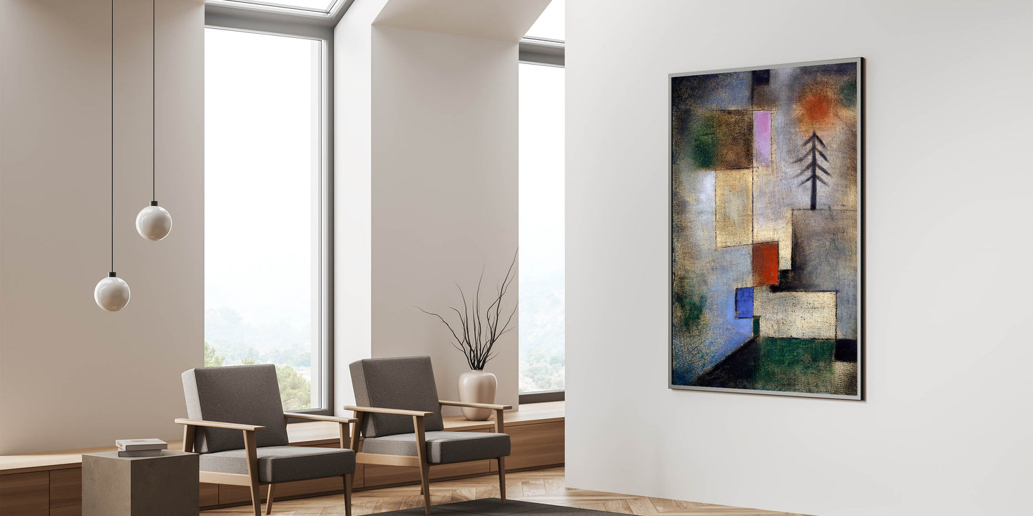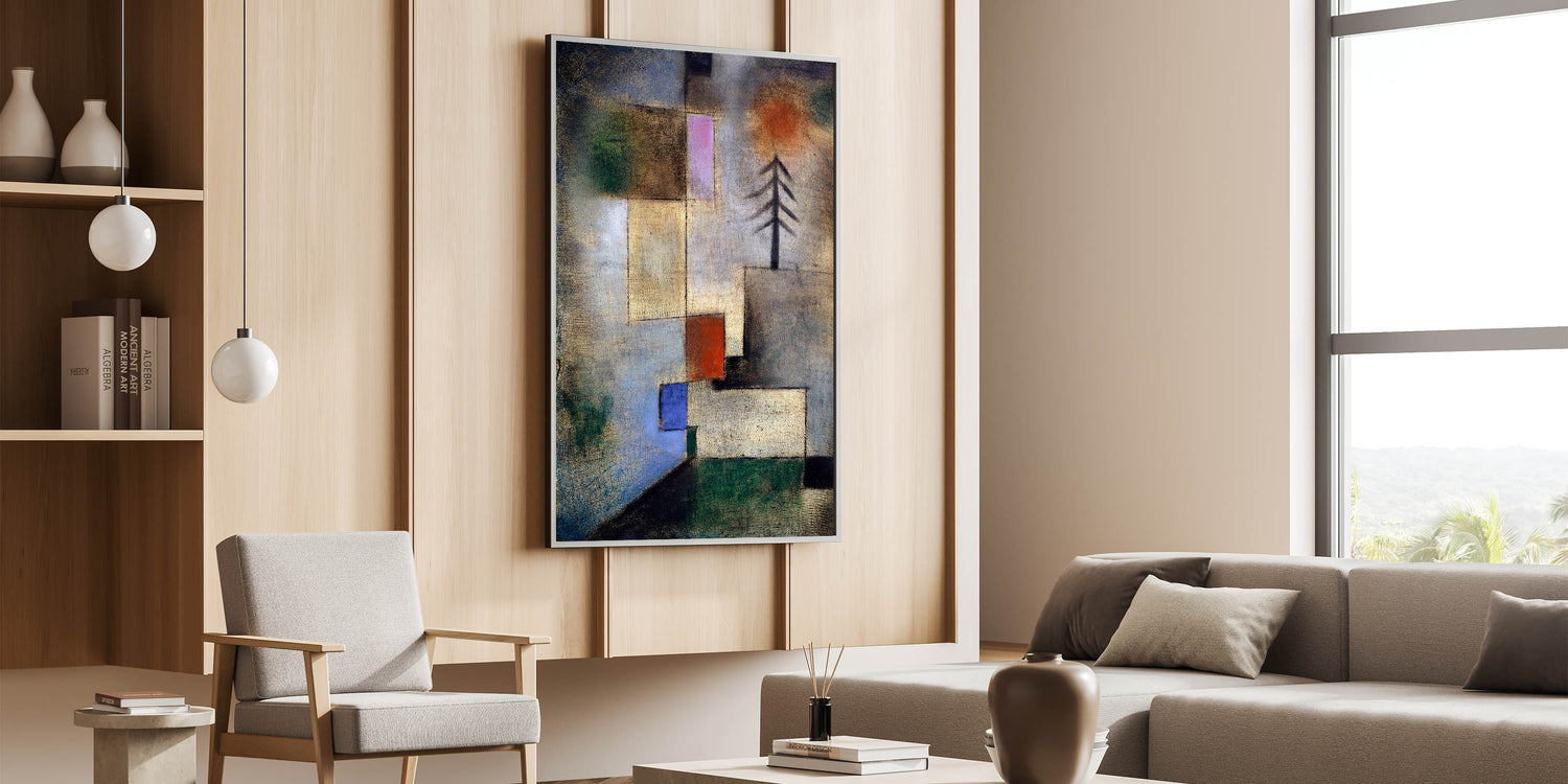 Enhance your space with this Modern Wall Art piece, an abstract composition featuring geometric shapes and a delicate fir tree silhouette. Inspired by Paul Klee's unique blend of color and form, this artwork offers a calming palette of earthy tones, soft blues, and warm accents, making it ideal for Minimalist Modern Decor. The balance of shapes and subtle colors adds a tranquil touch to any room, making it a versatile piece for modern interiors.