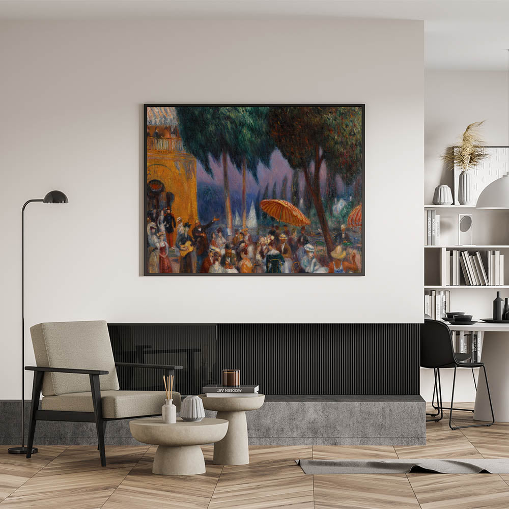 - Vibrant Social Scene: A detailed portrayal of a bustling outdoor gathering with musicians, parasols, and warm colors.