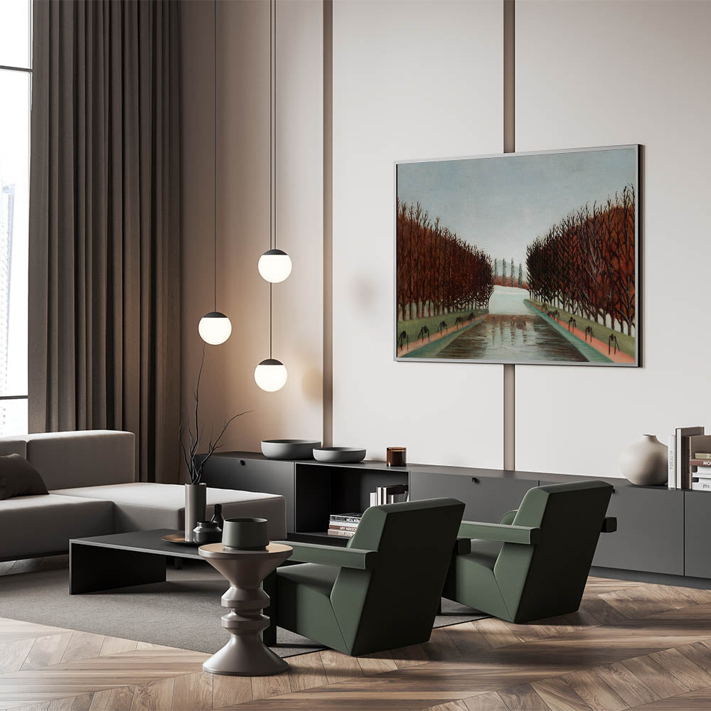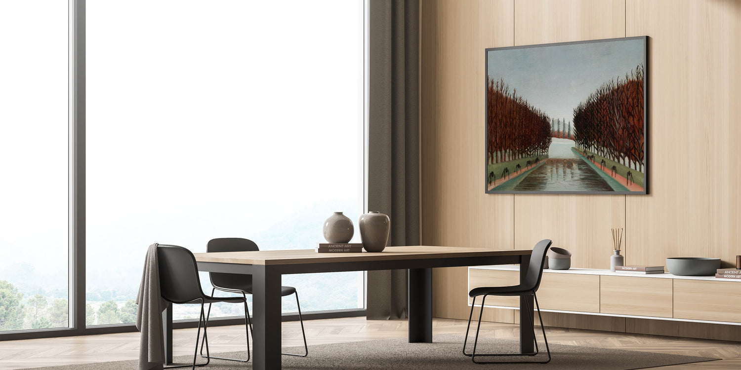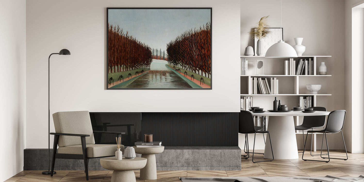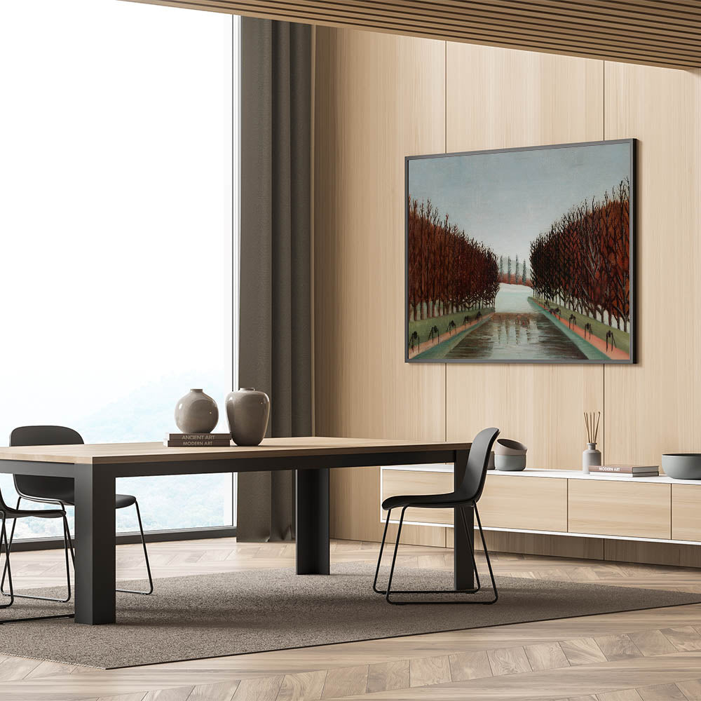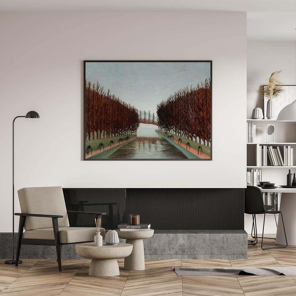 Bring a touch of peaceful beauty to your space with this Modern Wall Art, inspired by Henri Rousseau's "Le Canal." This artwork captures a quiet, symmetrical landscape with barren trees lining a reflective canal, evoking a calm and introspective mood. With its earthy tones and timeless composition, this piece is perfect for adding a serene and sophisticated touch to contemporary decor.