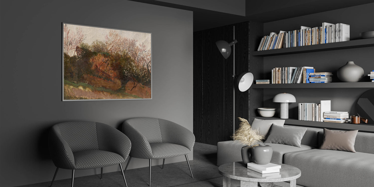Embrace the tranquility of spring with this serene piece of modern wall art, showcasing a delicate natural landscape. This artwork captures the beauty of blooming trees and lush greenery with soft, earthy tones of brown, green, and pastel pink. Its impressionistic style and subtle texture bring a peaceful charm to any space, making it a timeless addition to contemporary interiors.