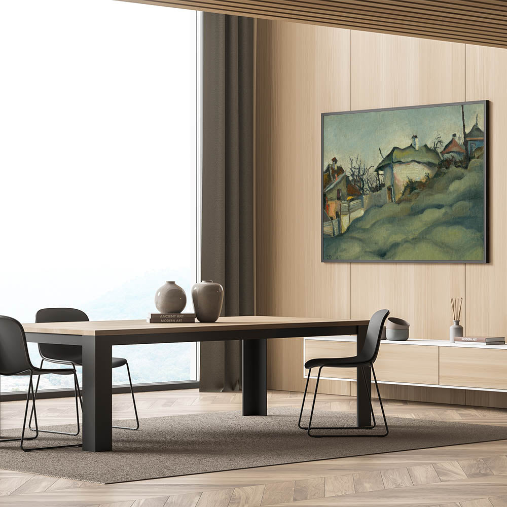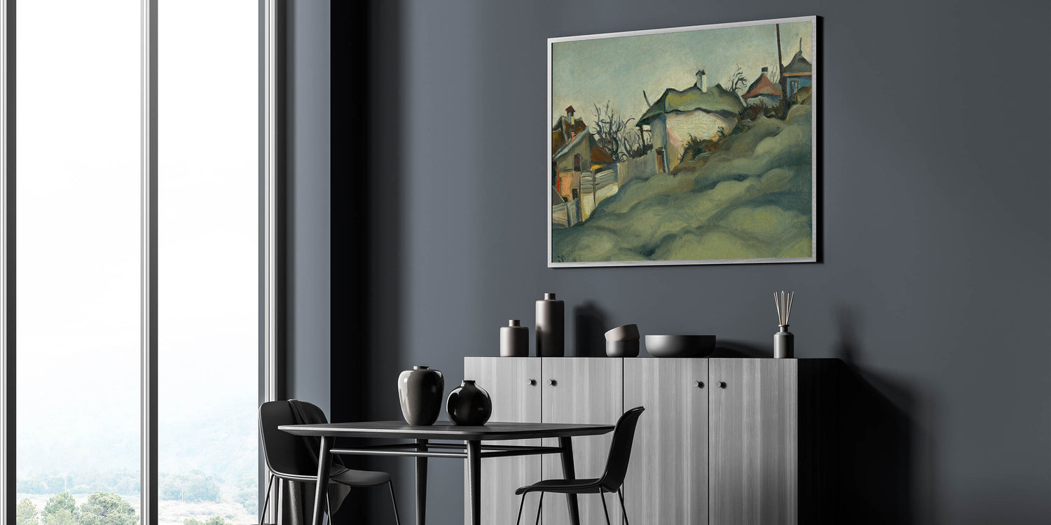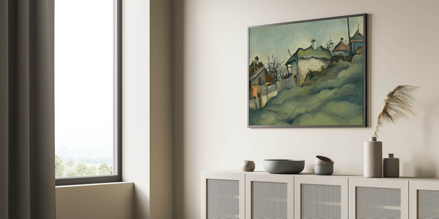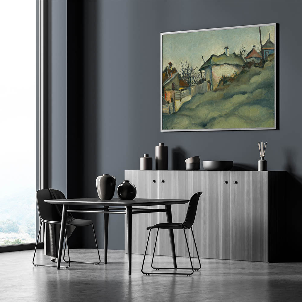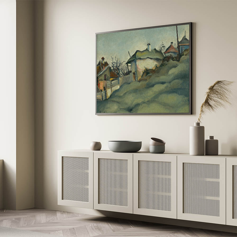 Discover the understated charm of this Modern Wall Art piece, "Periphery of Košice" by Konštantín Bauer. This artwork captures a serene suburban scene with rustic houses and barren trees, painted in a minimalist yet expressive style. The muted tones and soft, undulating textures bring a quiet sophistication to this piece, making it ideal for Trendy Home Decor.