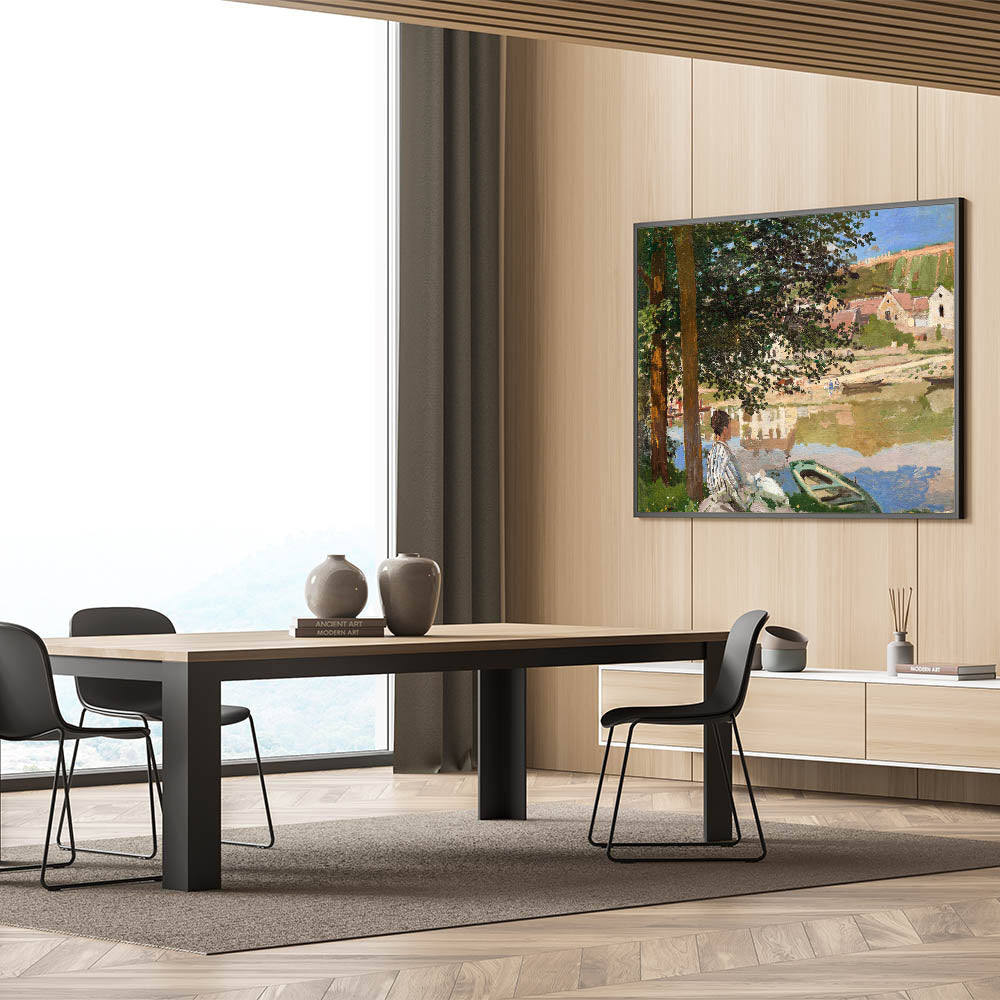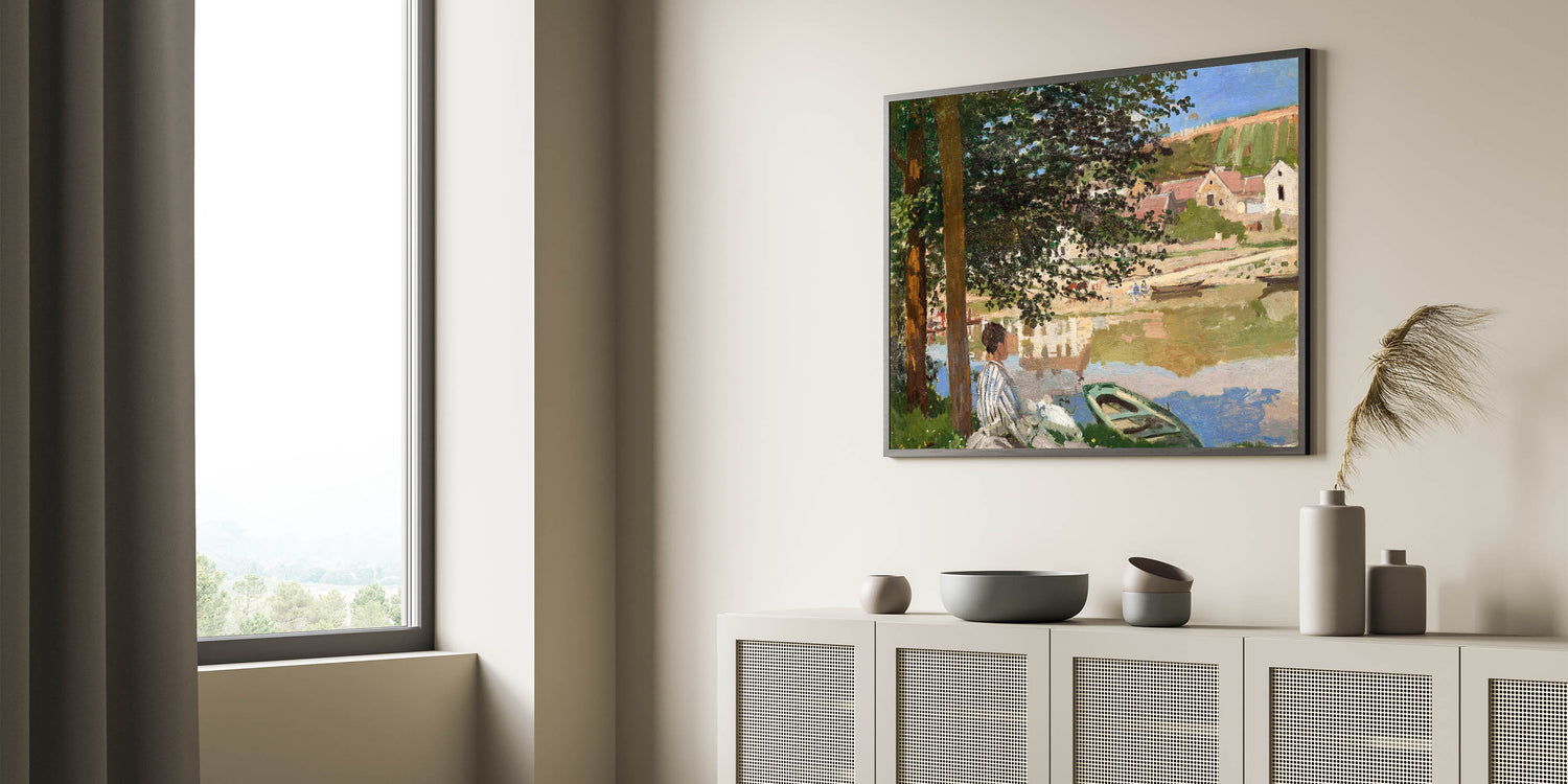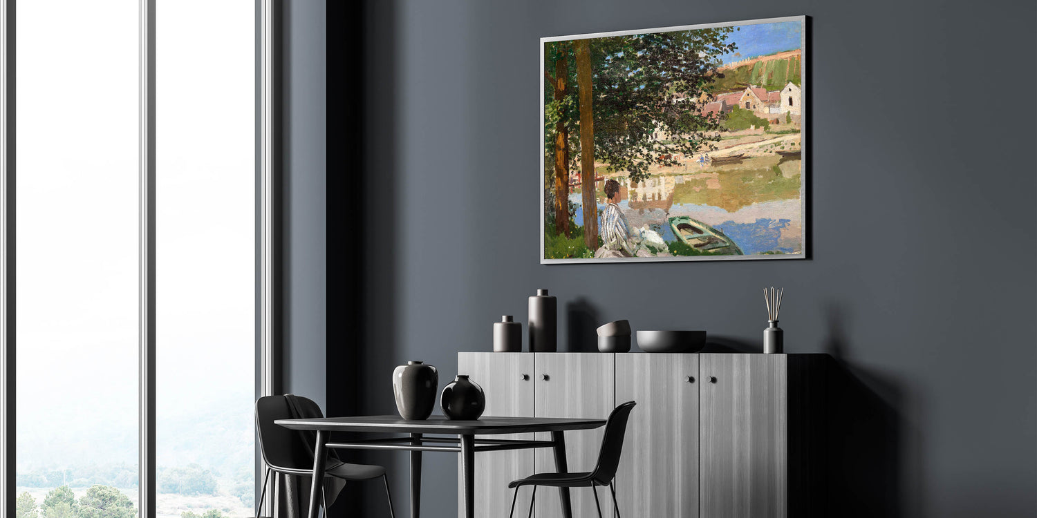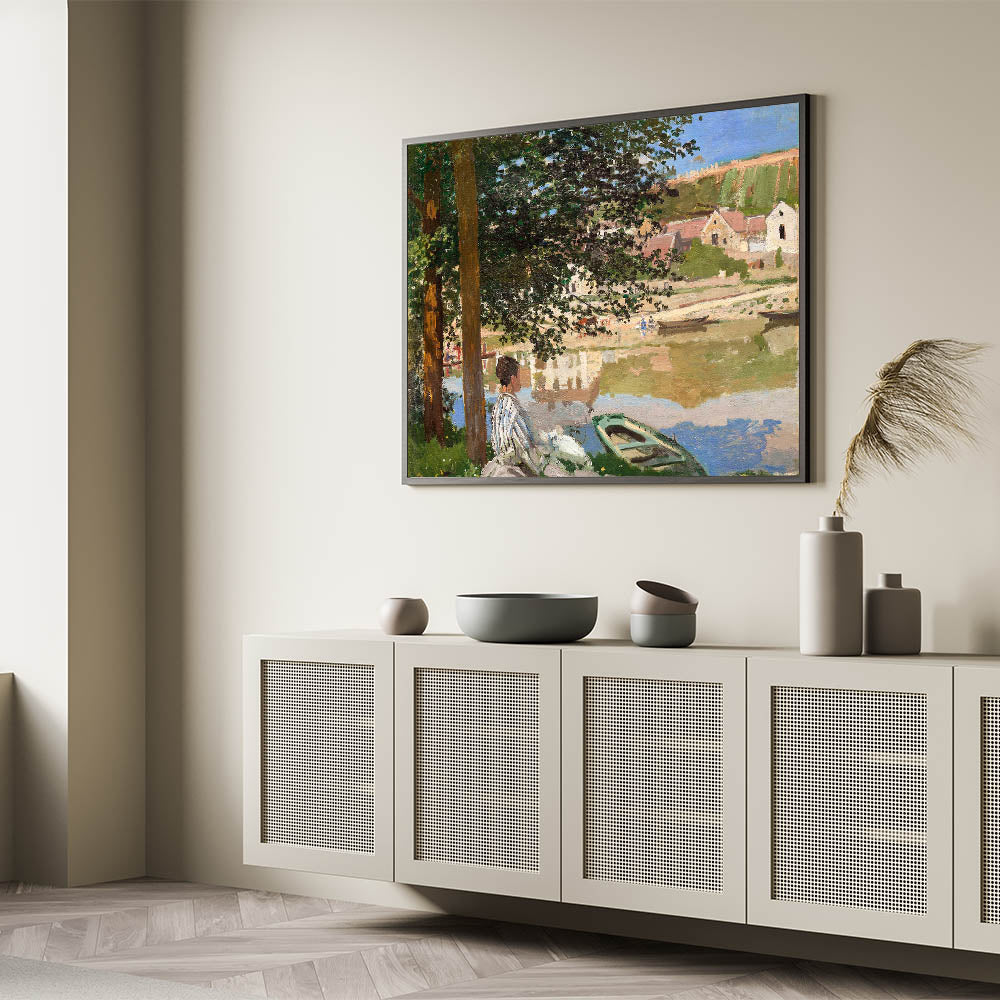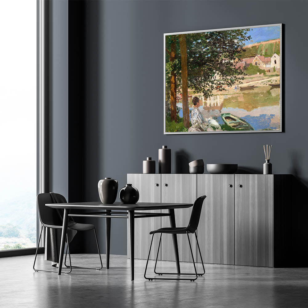 Transport yourself to the peaceful banks of the Seine with Claude Monet’s "On the Bank of the Seine, Bennecourt" (1868). This enchanting Impressionist painting captures a quiet moment of reflection, featuring a seated figure under the shade of trees, with a picturesque village and calm river in the background. Monet’s mastery of light and color brings this idyllic French countryside scene to life.