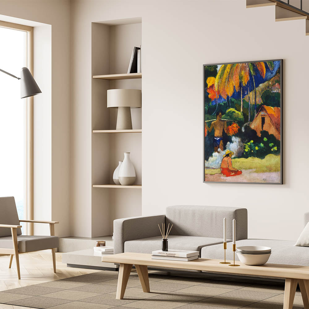 Add a splash of tropical beauty and serene warmth to your space with this vibrant wall art inspired by Paul Gauguin's Tahitian landscapes. This piece beautifully captures lush foliage, a rustic hut, and a figure relaxing under the expansive palm trees, transporting you to a world of calm and exotic beauty. Its rich, earthy tones and tropical greens bring a tranquil yet dynamic presence to any room.