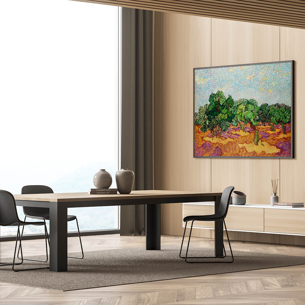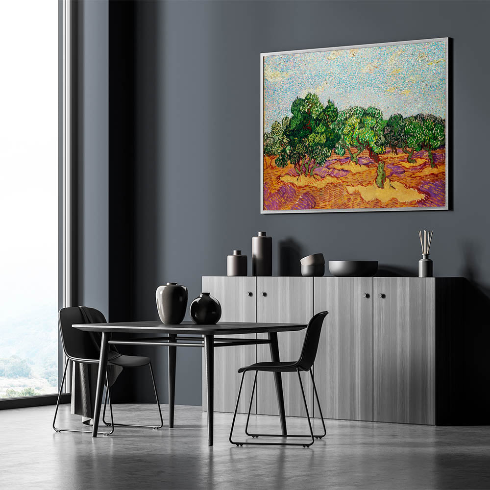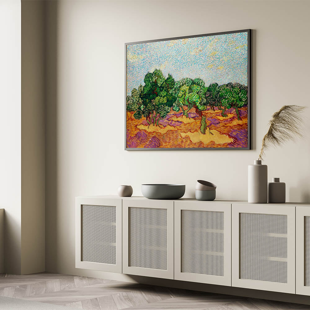 Infuse your space with the rich textures and bold colors of Vincent Van Gogh’s "Olive Trees" (1889). This Impressionist masterpiece portrays a lush grove bathed in the warm sunlight of Provence, featuring Van Gogh’s iconic swirling brushstrokes and vivid color contrasts. The expressive greens, purples, and yellows create a dynamic composition that radiates energy and tranquility.