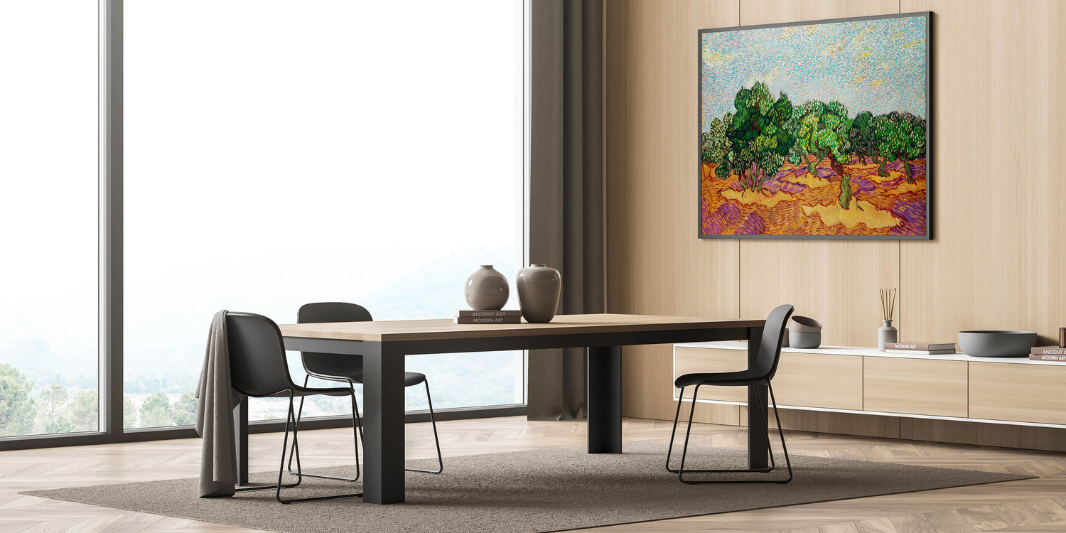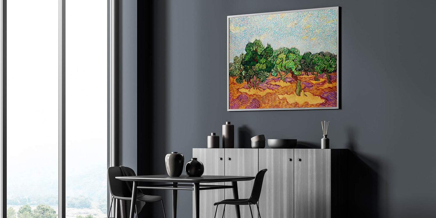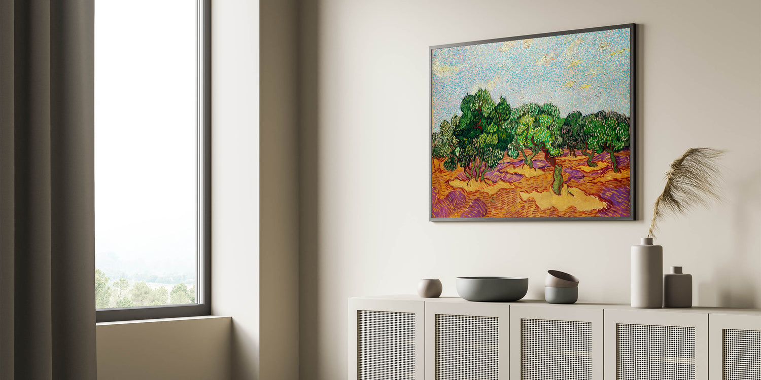 Infuse your space with the rich textures and bold colors of Vincent Van Gogh’s "Olive Trees" (1889). This Impressionist masterpiece portrays a lush grove bathed in the warm sunlight of Provence, featuring Van Gogh’s iconic swirling brushstrokes and vivid color contrasts. The expressive greens, purples, and yellows create a dynamic composition that radiates energy and tranquility.