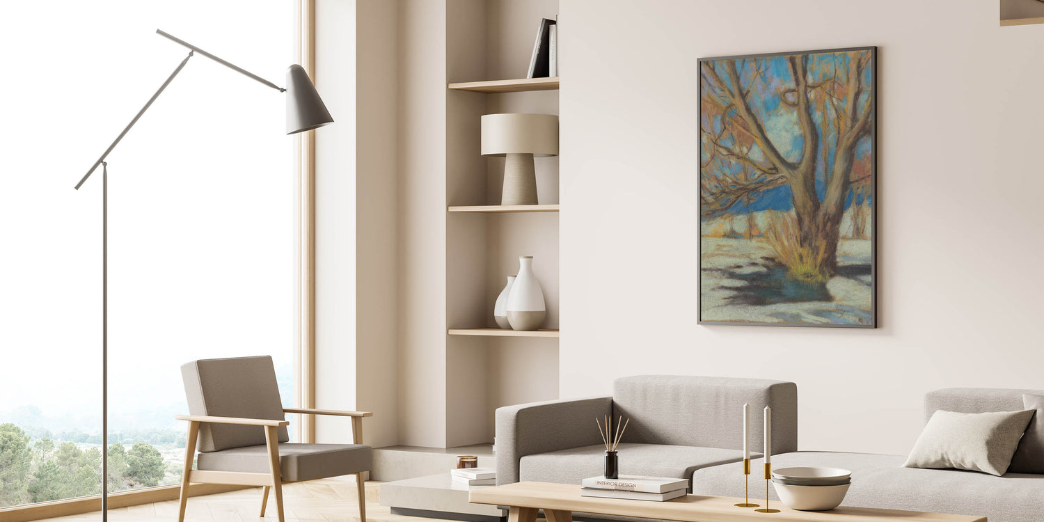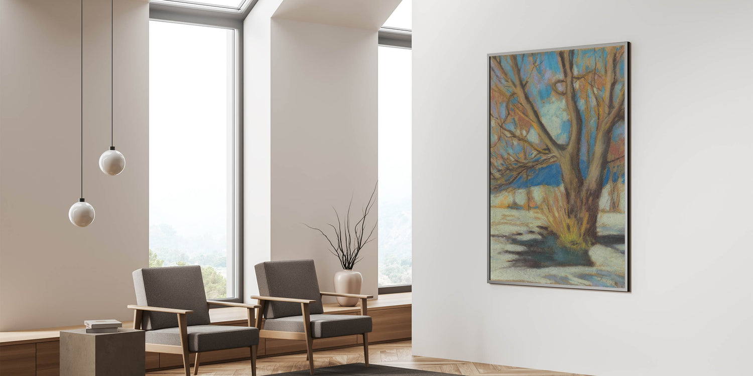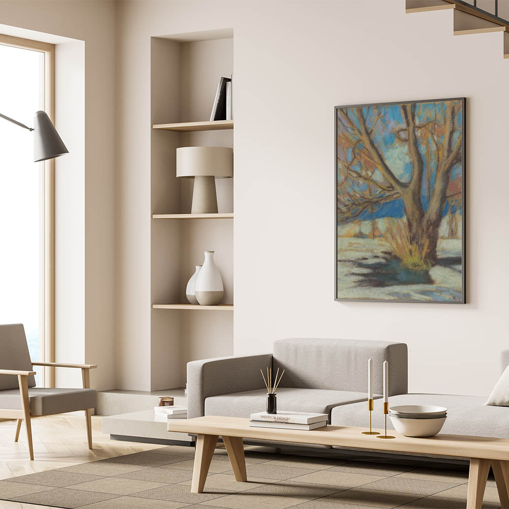 Add a touch of seasonal charm and artistic depth to your space with this stunning piece that embodies the quiet beauty of winter.