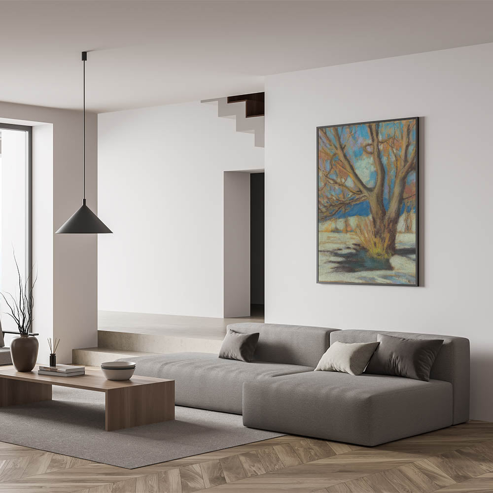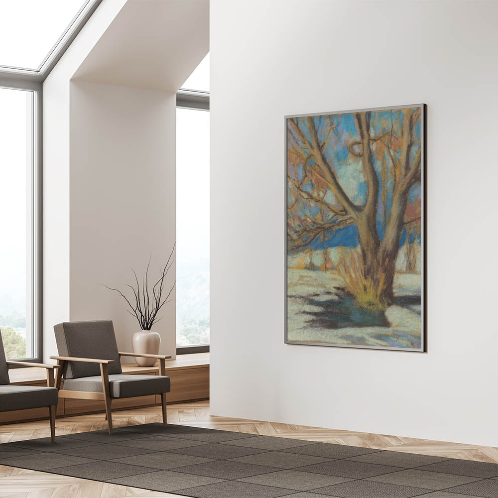 Celebrate the serene beauty of winter with Winter's Essence: Study of a Bare Tree by Zolo Palugyay. This evocative artwork captures the stark elegance of a lone tree standing against a vivid blue sky and subtle snowy landscape. Crafted with masterful strokes, it perfectly blends vibrant hues and muted tones, creating a captivating balance of warmth and chill. Ideal for nature lovers and art enthusiasts, this piece serves as a striking focal point for modern and traditional interiors alike.