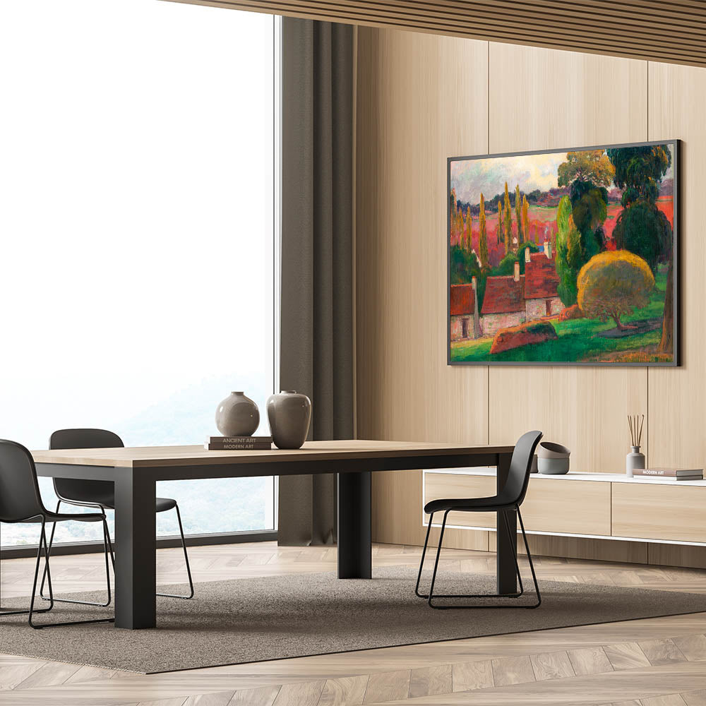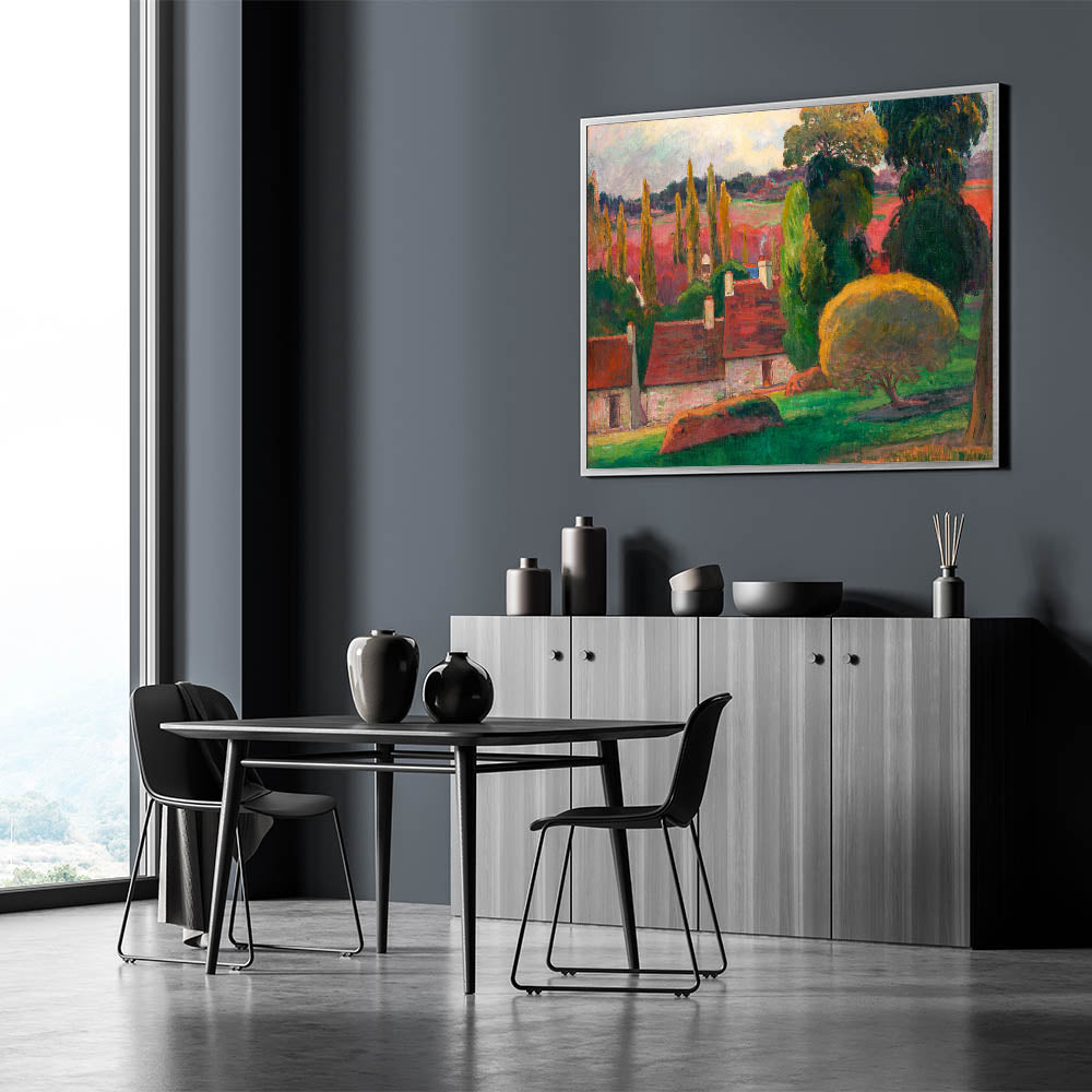 Brighten your space with "A Farm in Brittany" by Paul Gauguin, a colorful landscape that showcases the rural beauty of the French countryside. This artwork is filled with vivid colors and expressive brushstrokes, bringing a dynamic sense of life and movement to any decor. Gauguin’s bold approach captures the charm of farmhouses and lush trees in rich tones, making this piece a captivating addition to any room.