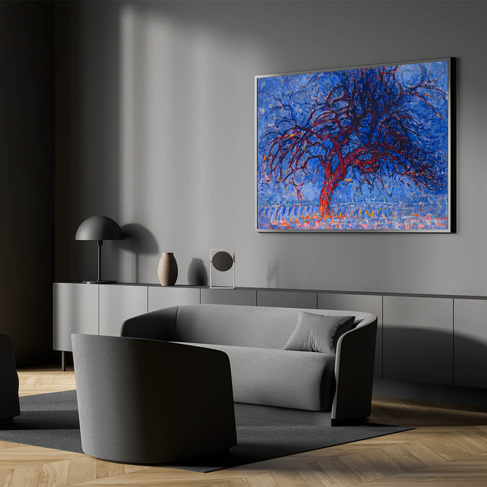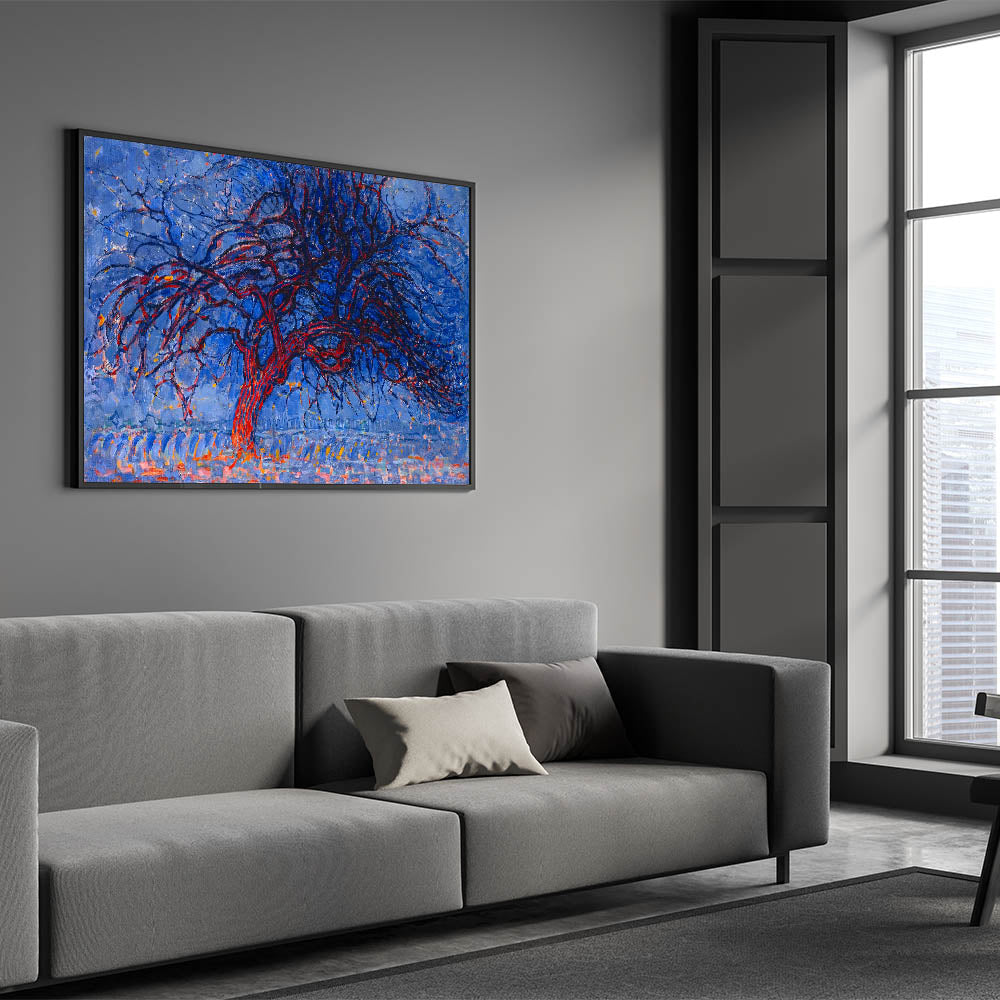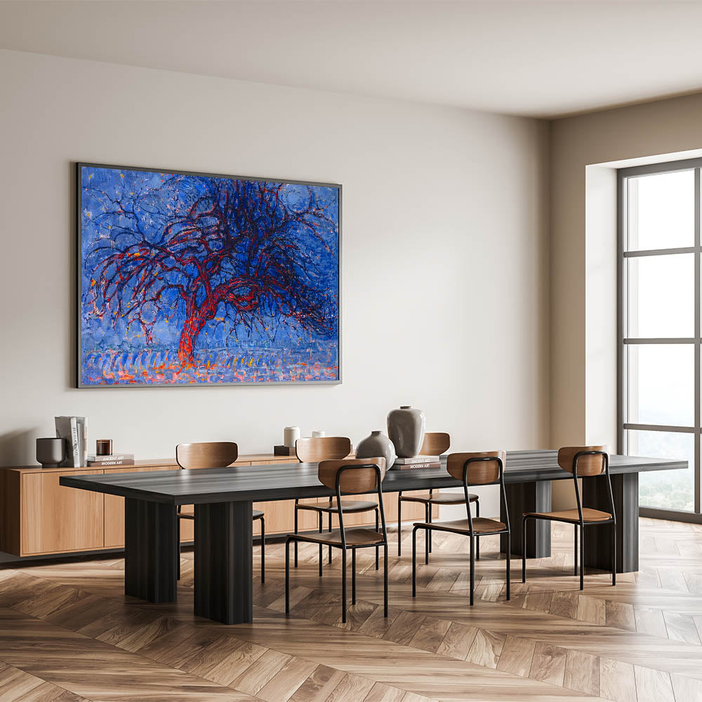 Transform your space with the bold energy of this red tree wall art, set against a vibrant blue background. This striking piece captures the power of nature in a modern, abstract style, making it perfect for those who want to make a statement with their decor.