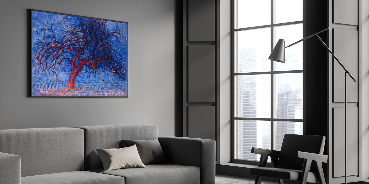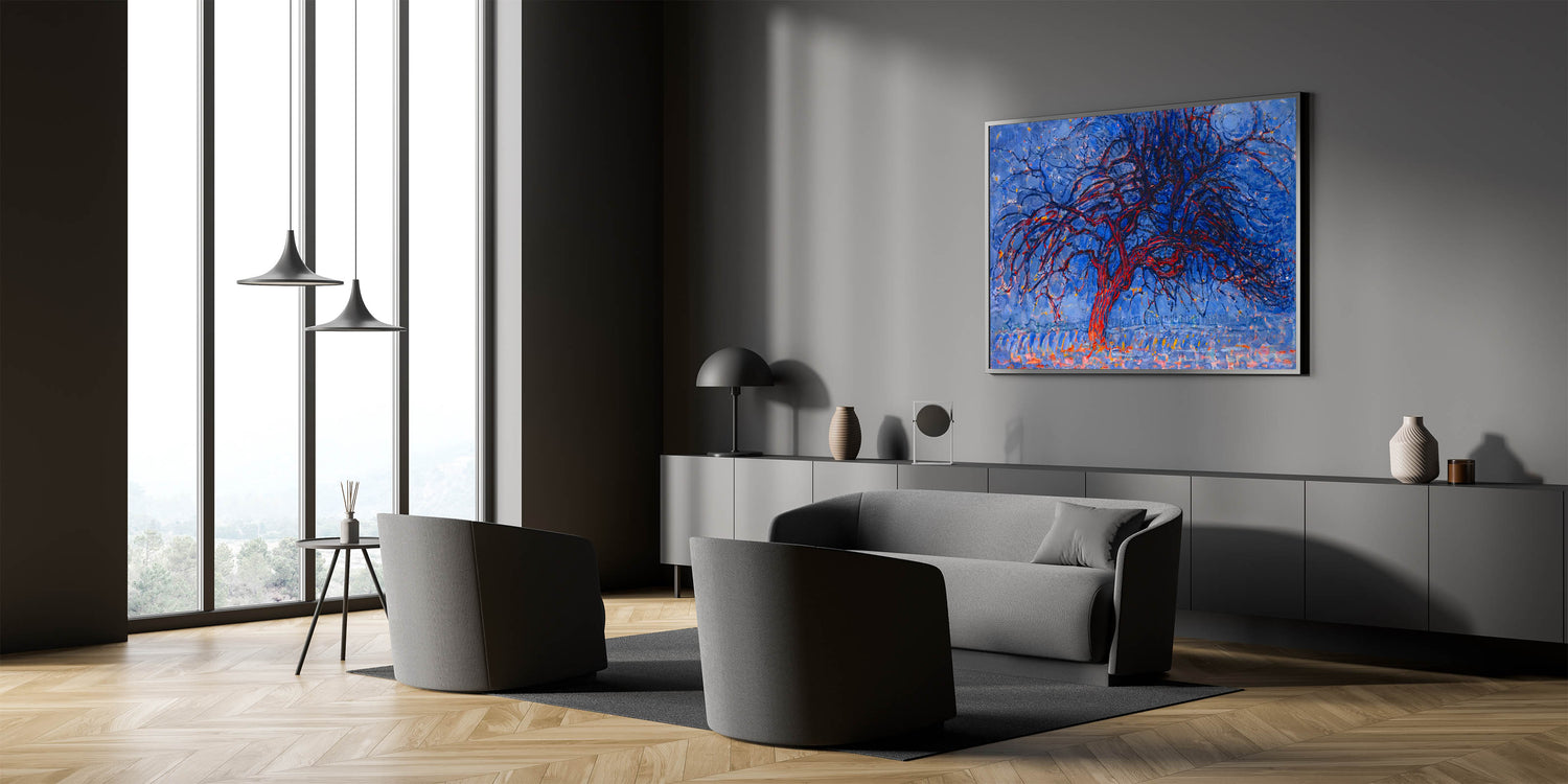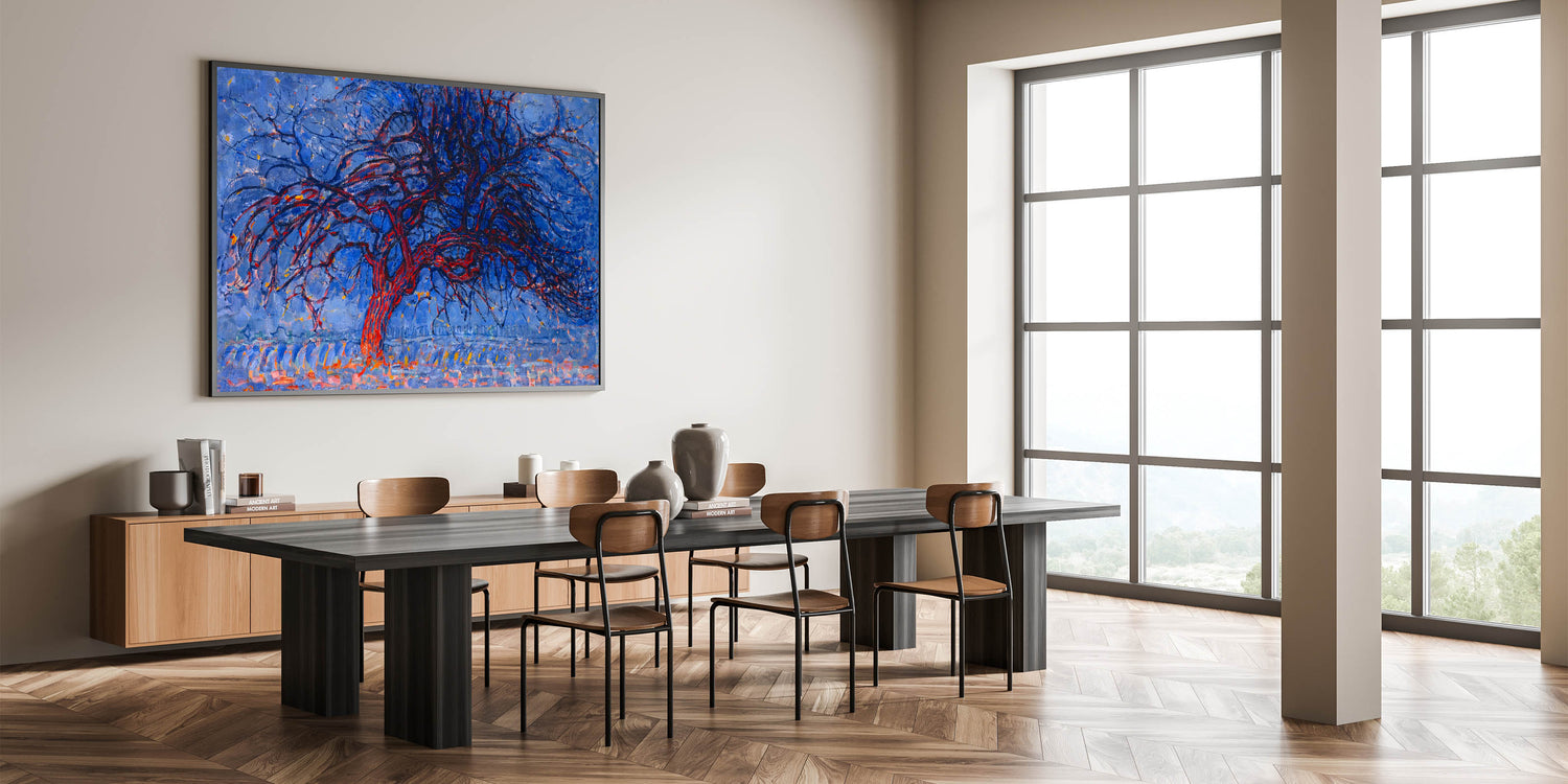 Transform your space with the bold energy of this red tree wall art, set against a vibrant blue background. This striking piece captures the power of nature in a modern, abstract style, making it perfect for those who want to make a statement with their decor.