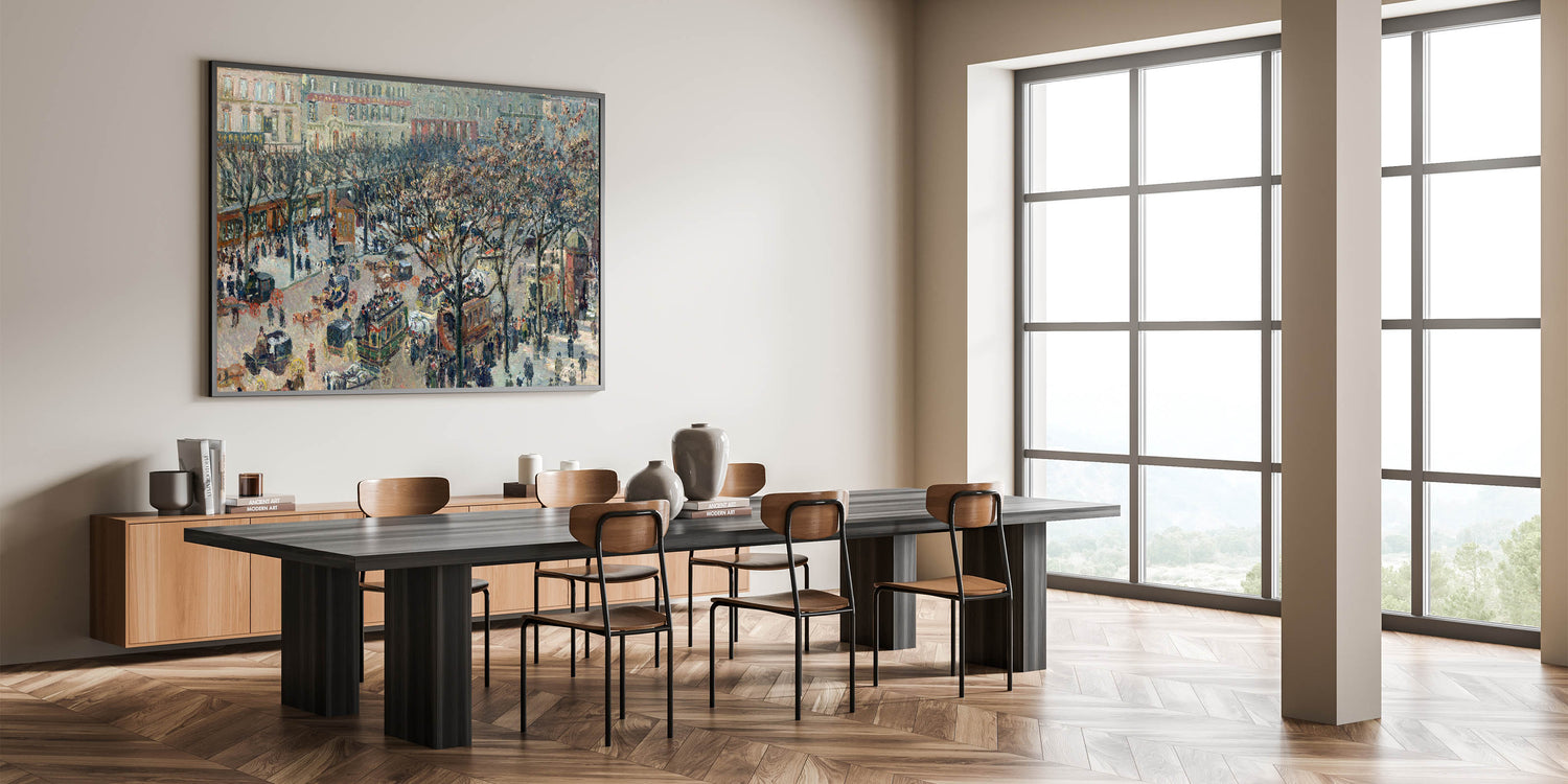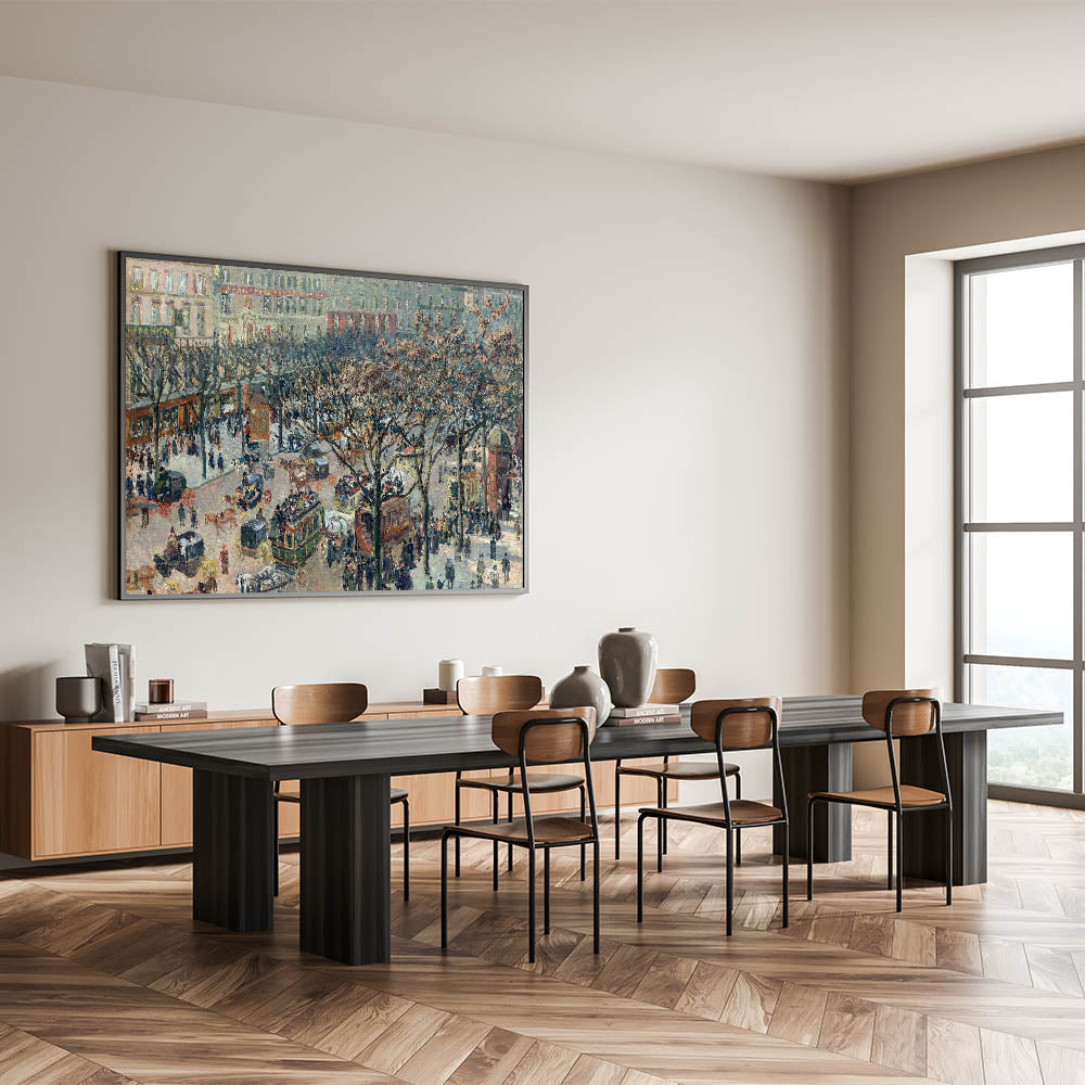 Bring the vibrant energy of Paris to your home with this Impressionist wall art inspired by Camille Pissarro's Boulevard des Italiens, Morning Sunlight. This captivating artwork depicts a bustling Parisian street scene, filled with carriages, pedestrians, and sunlight filtering through trees. Pissarro’s masterful brushwork and attention to light and detail capture the lively atmosphere of the city in a way that only Impressionism can.