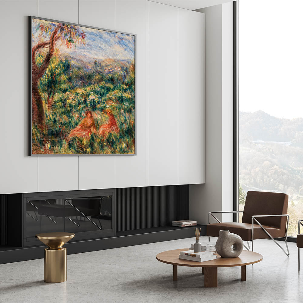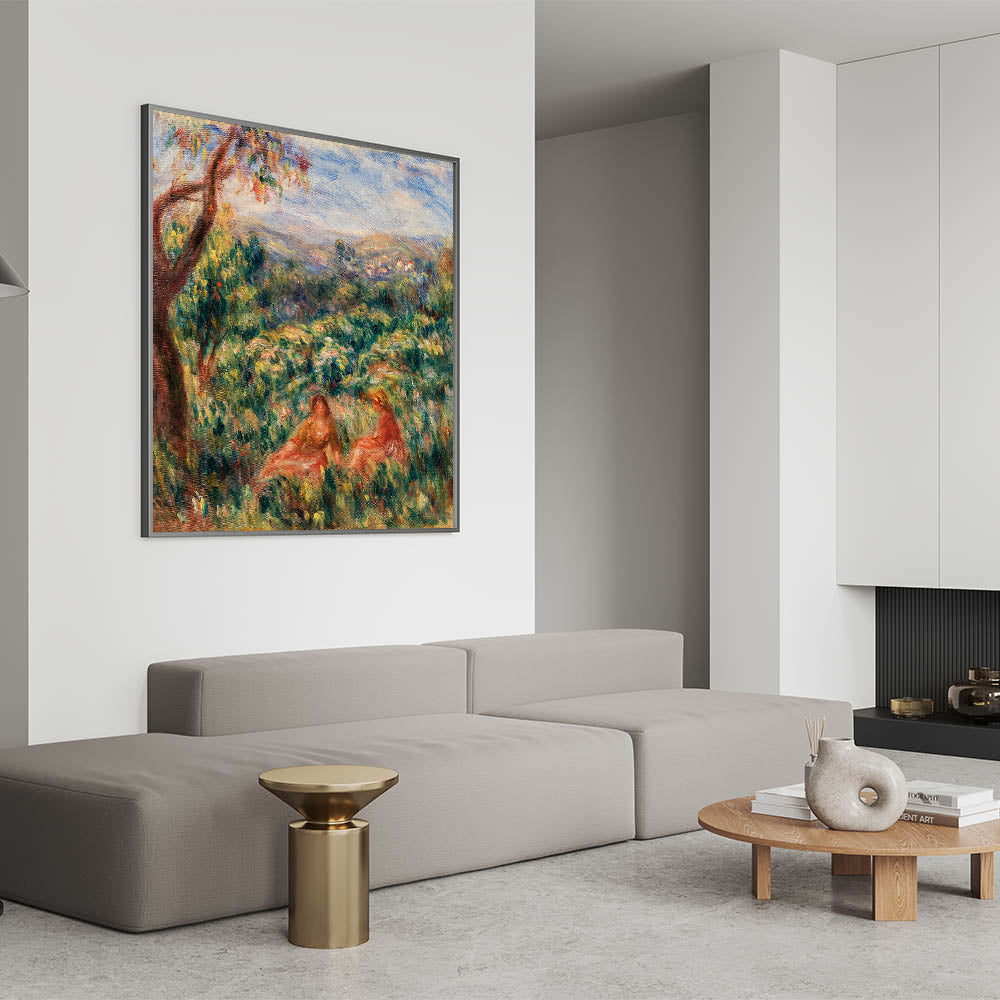 Immerse yourself in the peaceful charm of the countryside with "Paysage" by Pierre-Auguste Renoir. This stunning Impressionist painting depicts two figures relaxing under a tree amidst lush greenery, with rolling hills and a distant village adding depth to the scene. Renoir’s vibrant brushwork and rich color palette bring the landscape to life, inviting you to experience the tranquility of nature.