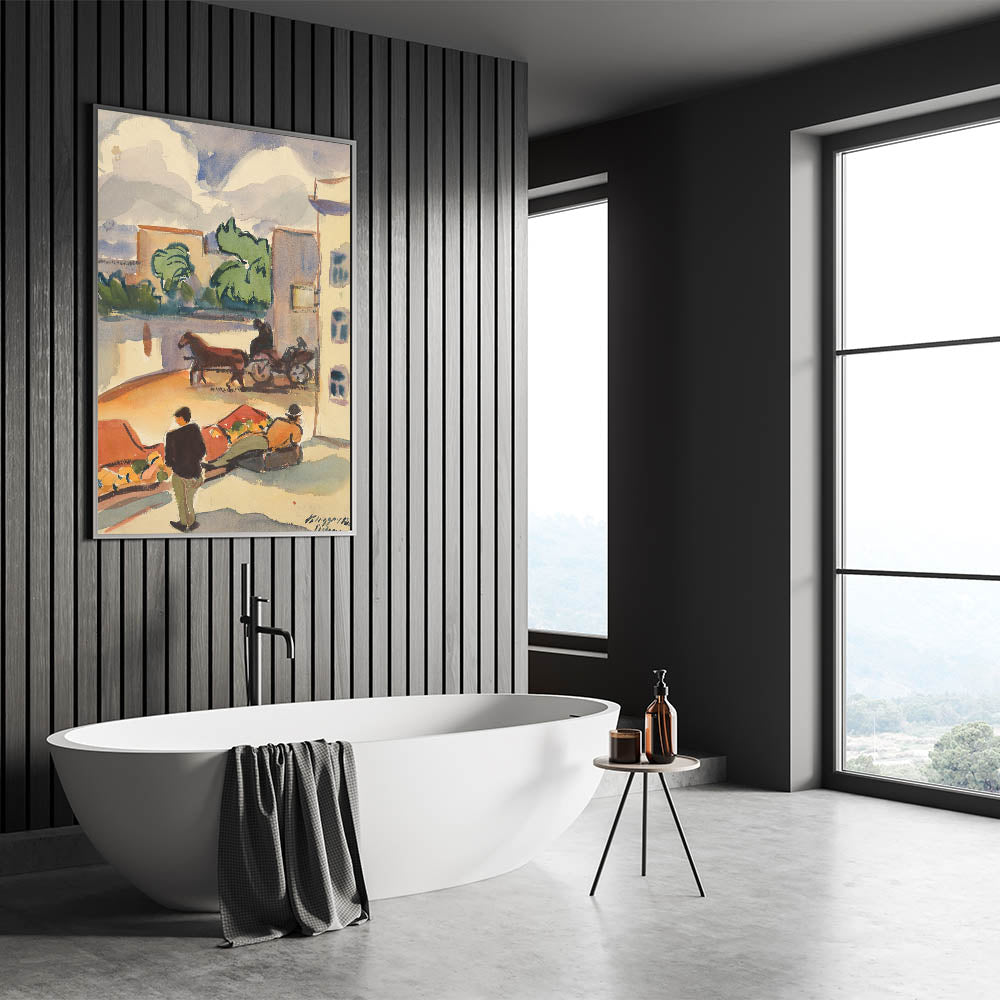 Add a touch of whimsy and warmth to your decor with this provincial street scene. Its bright colors and lively setting create an inviting ambiance, perfect for modern and eclectic spaces.