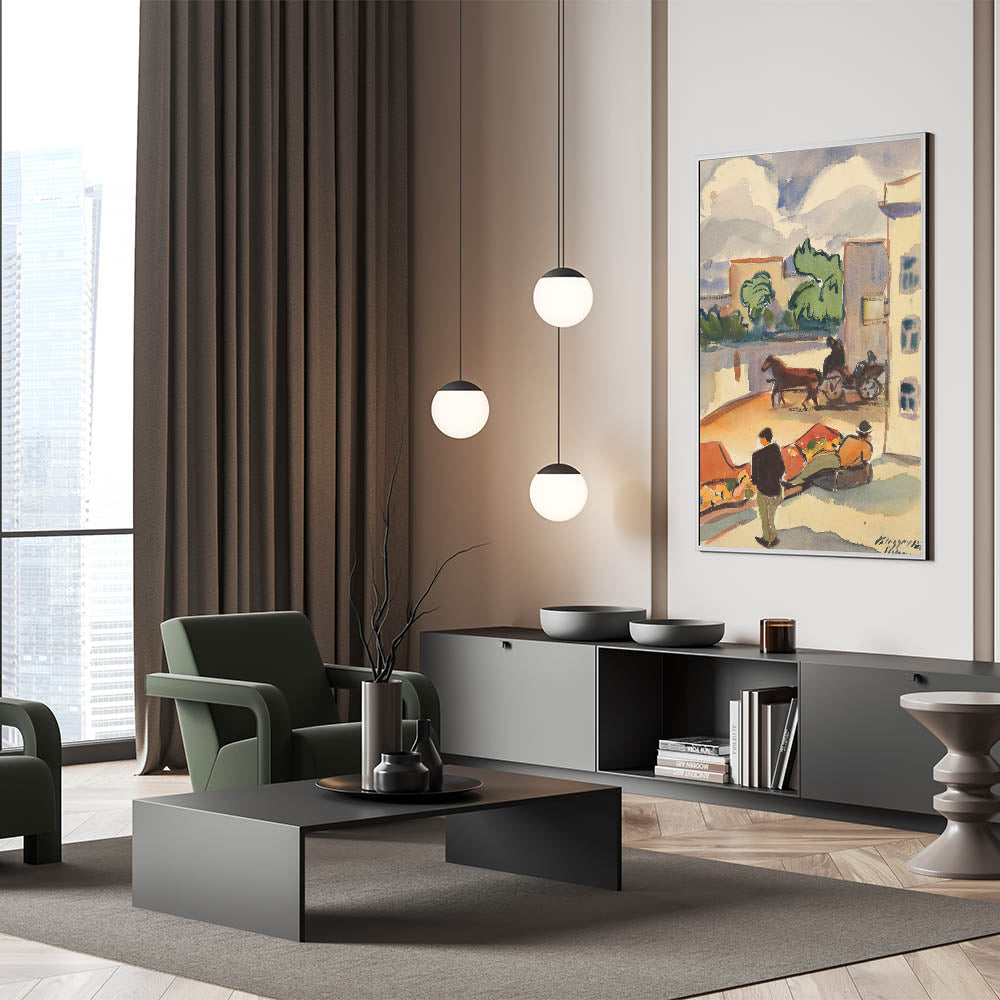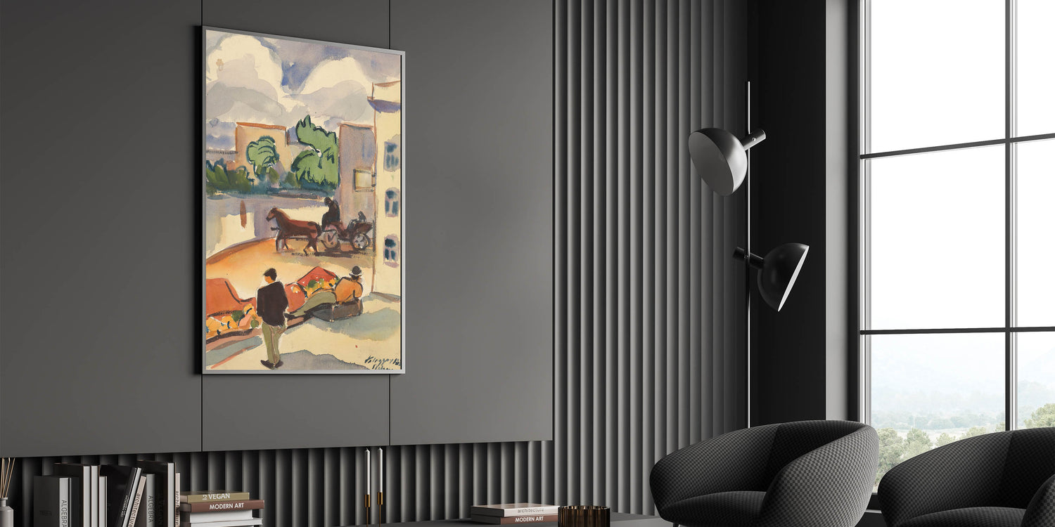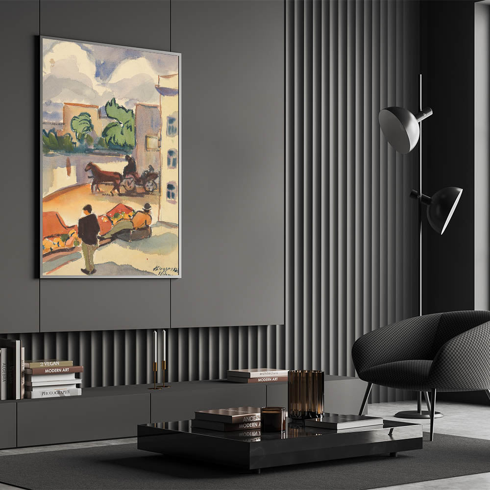 This vibrant modern wall art piece captures the charm of a provincial street scene with lively colors and expressive brushstrokes. Featuring figures, a horse-drawn cart, and lush green trees, this artwork brings a touch of nostalgic charm with a modern twist. Ideal for fans of unique modern art, this colorful print adds warmth and personality to any decor, making it perfect for living rooms, dining areas, or offices. The artwork's playful palette and engaging scene add both a stylish and artistic focal point to your trendy home decor.