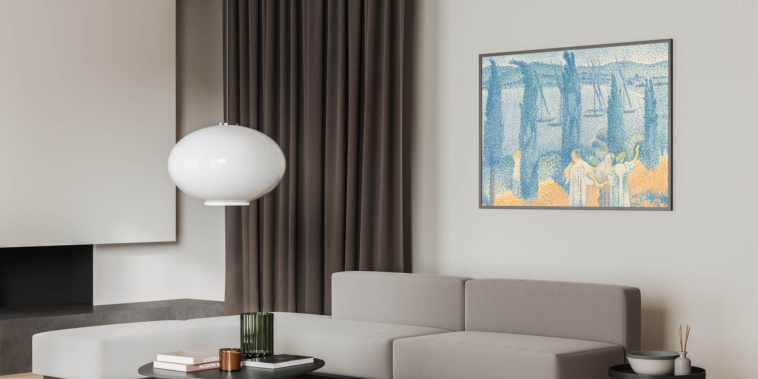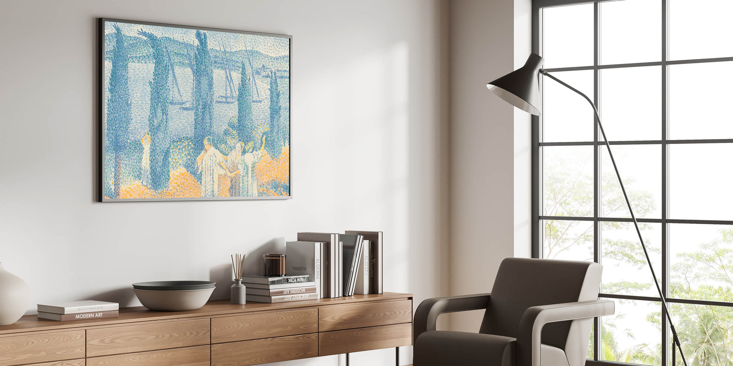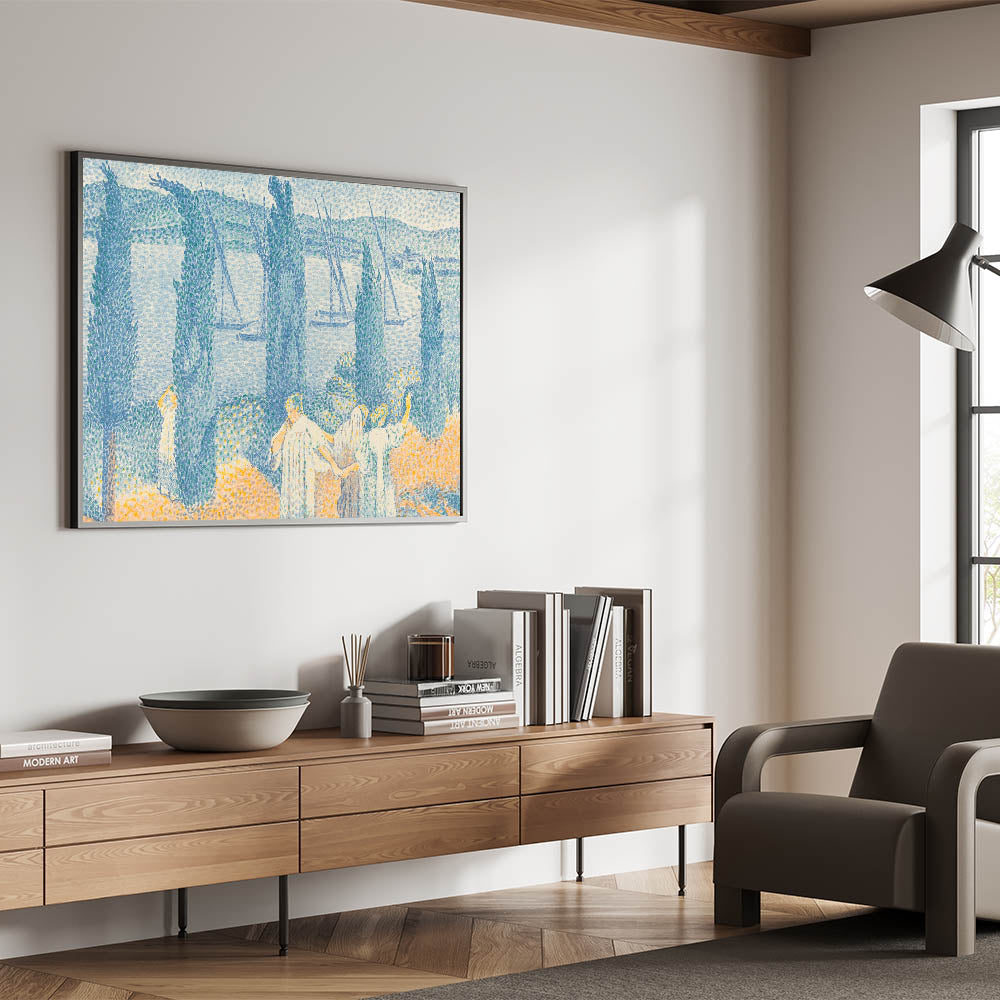 Immerse yourself in the calm of a lakeside promenade with this modern wall art piece, inspired by the pointillist style. Featuring delicate blue and green tones with hints of yellow, this artwork depicts a peaceful scene by the water, with towering trees and distant sailboats adding to the sense of tranquility. This unique modern art piece is perfect for trendy home decor, bringing an air of calm elegance and sophistication to any space.