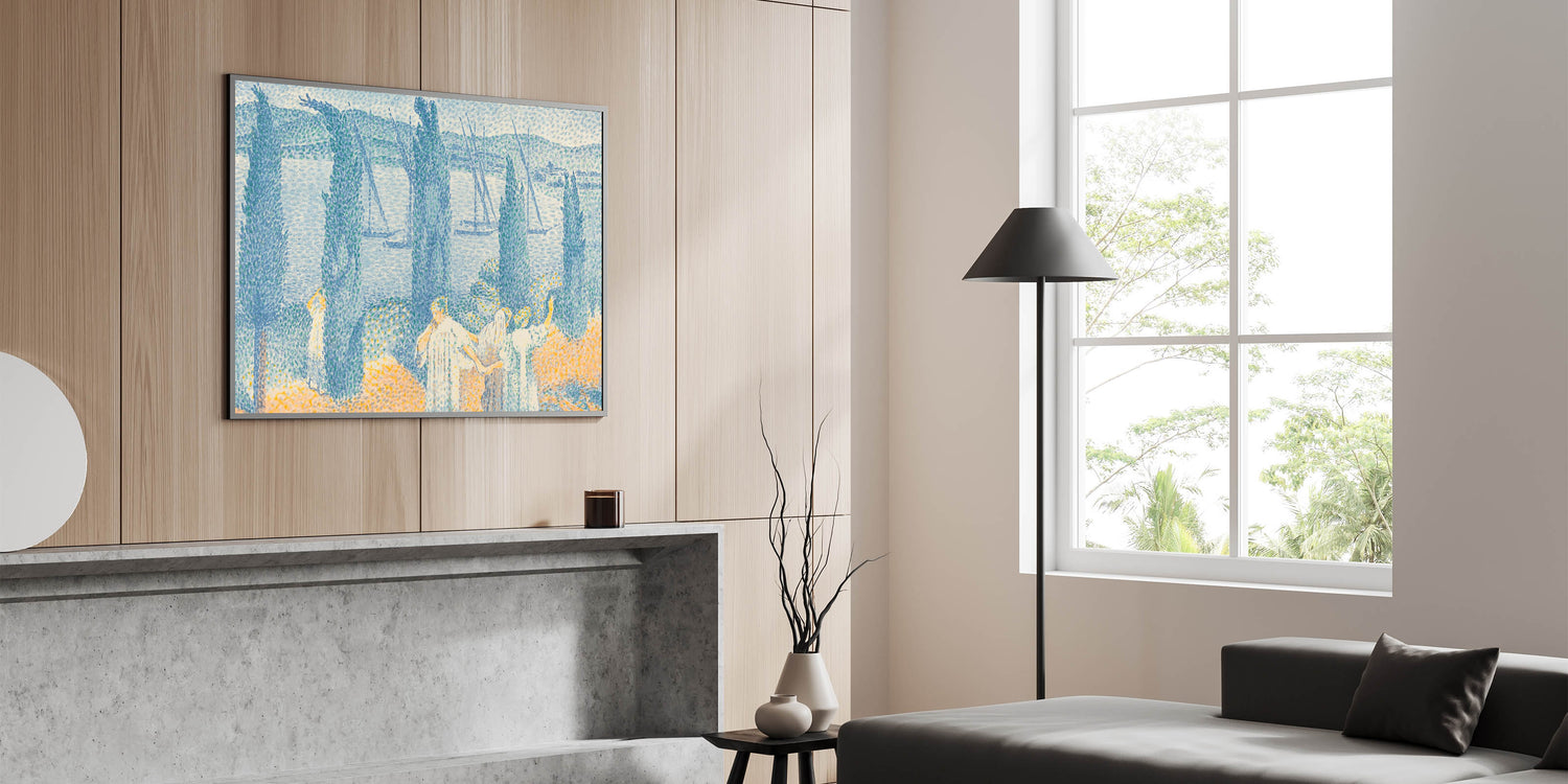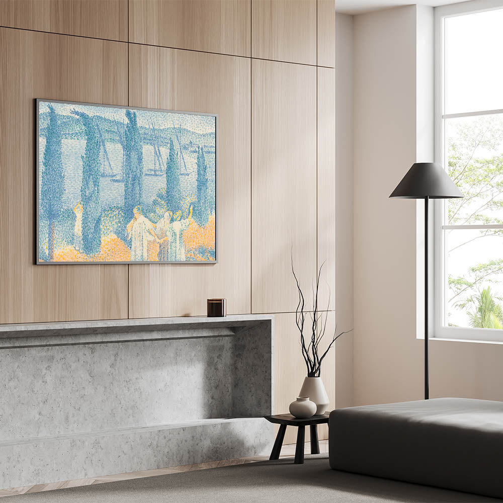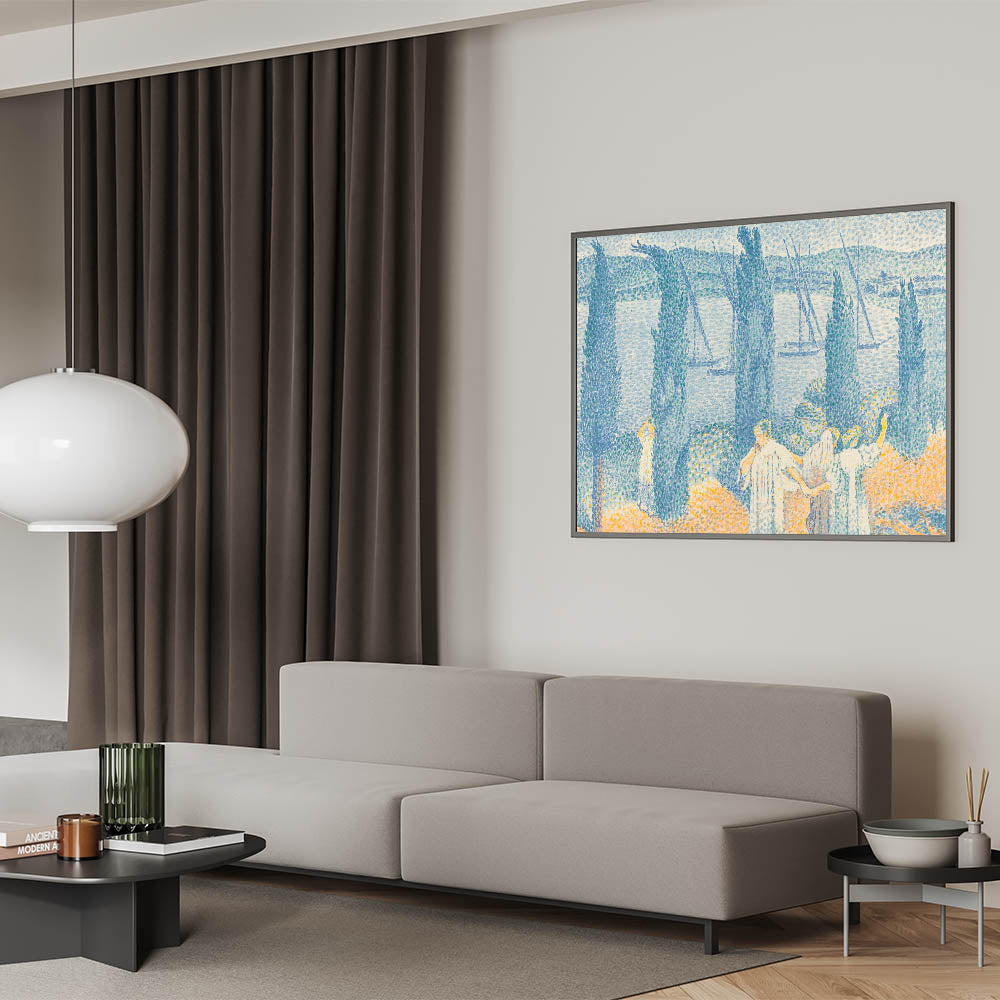 Immerse yourself in the calm of a lakeside promenade with this modern wall art piece, inspired by the pointillist style. Featuring delicate blue and green tones with hints of yellow, this artwork depicts a peaceful scene by the water, with towering trees and distant sailboats adding to the sense of tranquility. This unique modern art piece is perfect for trendy home decor, bringing an air of calm elegance and sophistication to any space.