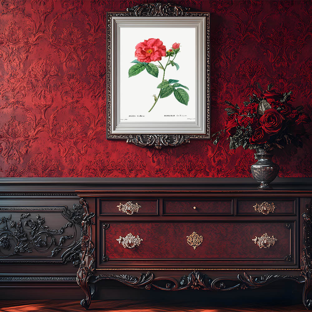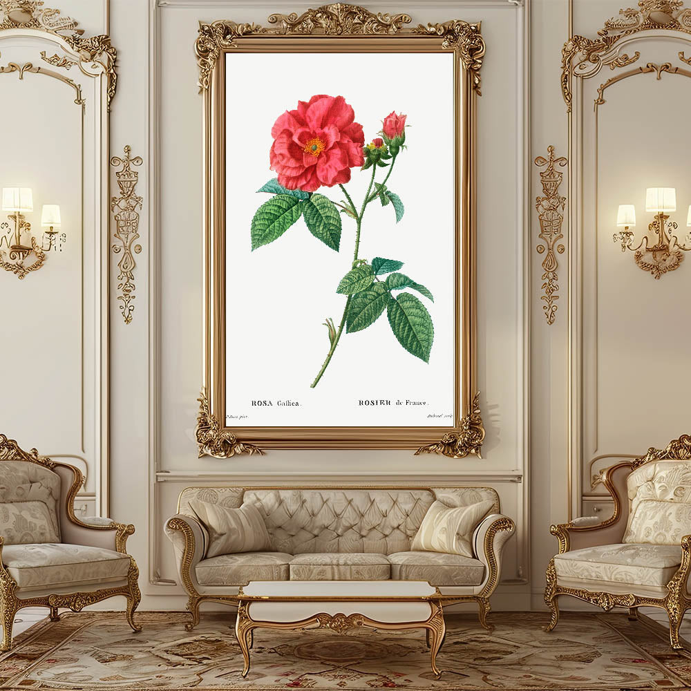 Enrich your space with the timeless beauty of French Rose (Rosa gallica) by Pierre-Joseph Redouté. Known for his precise and delicate botanical illustrations, Redouté’s work beautifully captures the vibrant red of the Rosa gallica, commonly known as the French rose. This artwork reflects Neoclassical ideals, emphasizing the balance, simplicity, and harmony found in nature. Each petal and leaf is meticulously detailed, making this piece an elegant homage to classical botanical art.