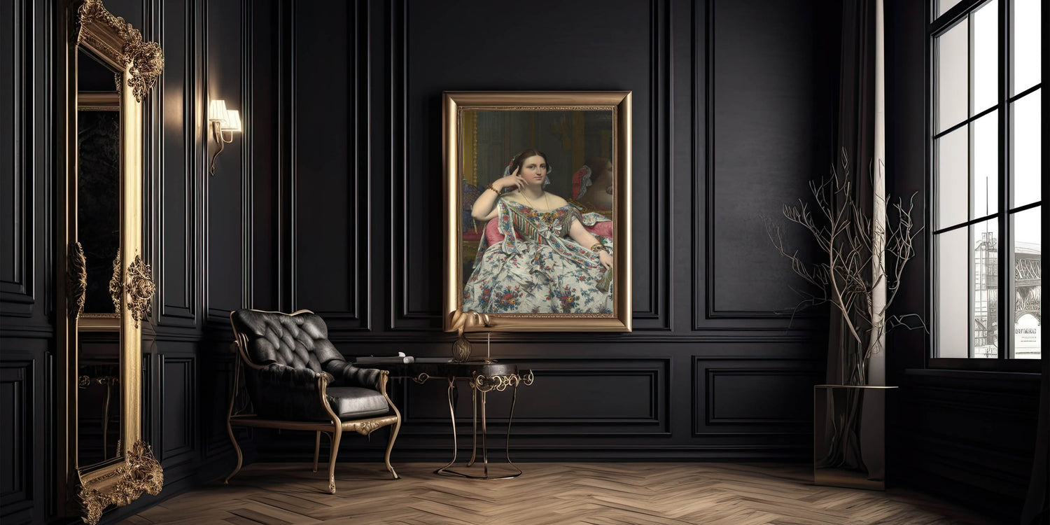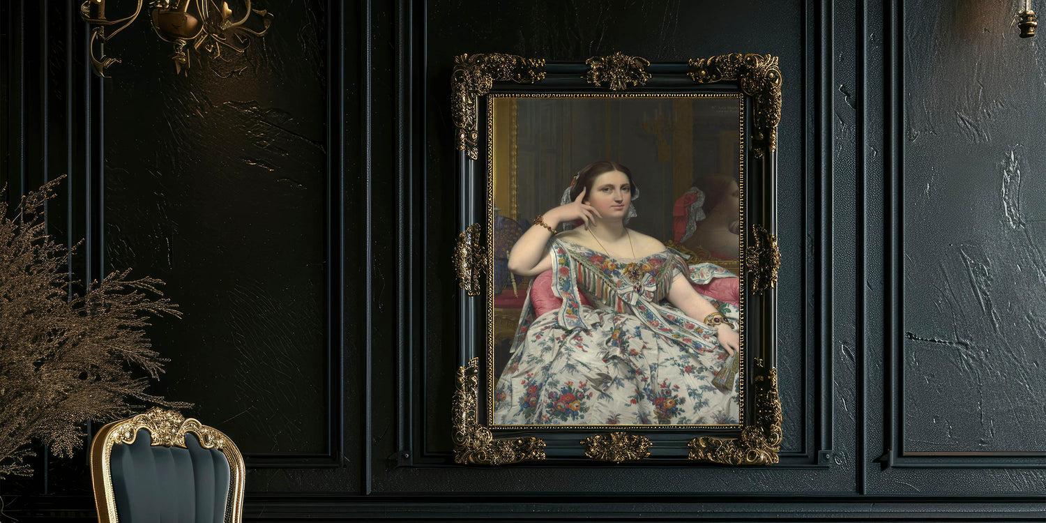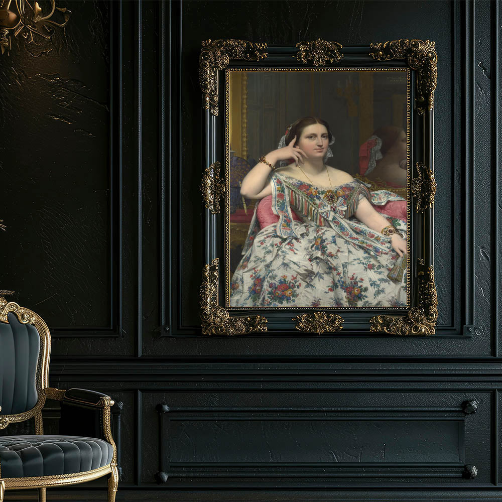 Embrace the sophistication of Neoclassical portraiture with Madame Moitessier by Jean-Auguste-Dominique Ingres. This masterpiece reflects the 19th-century revival of Greco-Roman ideals, focusing on beauty, elegance, and the idealized human form. Ingres’ meticulous attention to detail, from the luxurious textures of the dress to the reflective mirror in the background, captures the essence of Neoclassicism's refined aesthetic. Madame Moitessier’s serene yet powerful gaze and lavish attire embody the grace and poise that define this art movement.