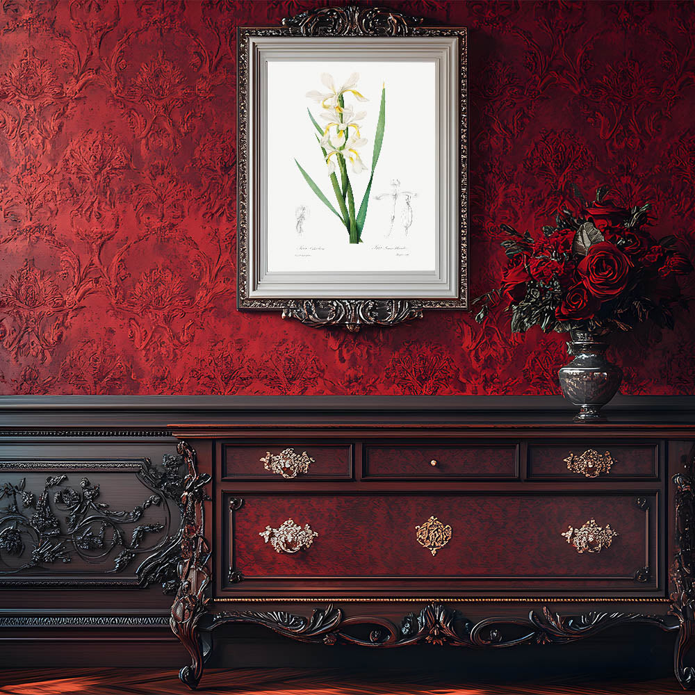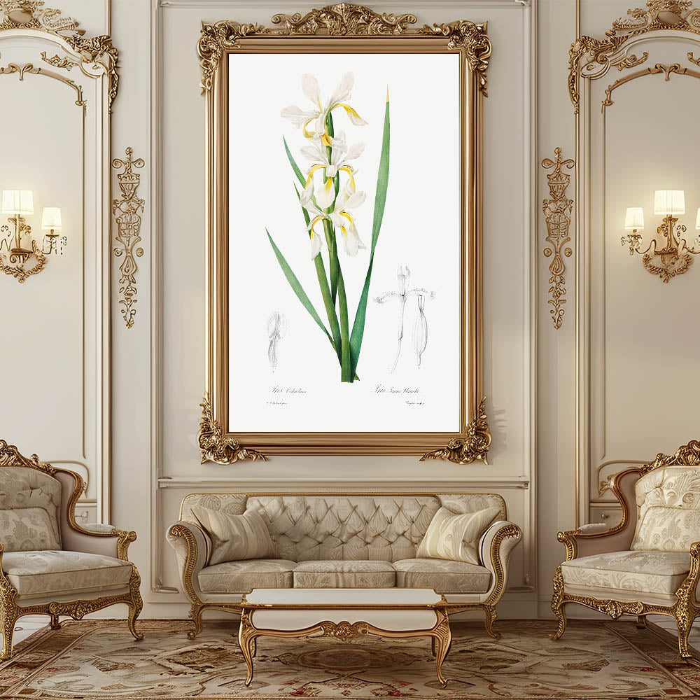 This exquisite neoclassical art print features the Gold-banded Iris, beautifully illustrated by celebrated botanical artists Pierre-Joseph Redouté and Henry-Joseph Redouté. Known for their precise and elegant representations of flora, the Redouté brothers bring the iris flower to life in this piece, with its delicate white petals accented by a soft golden band. This illustration embodies the ideals of simplicity, symmetry, and natural beauty that define the neoclassical aesthetic, inspired by a revival of Greek and Roman art in the 18th and 19th centuries.