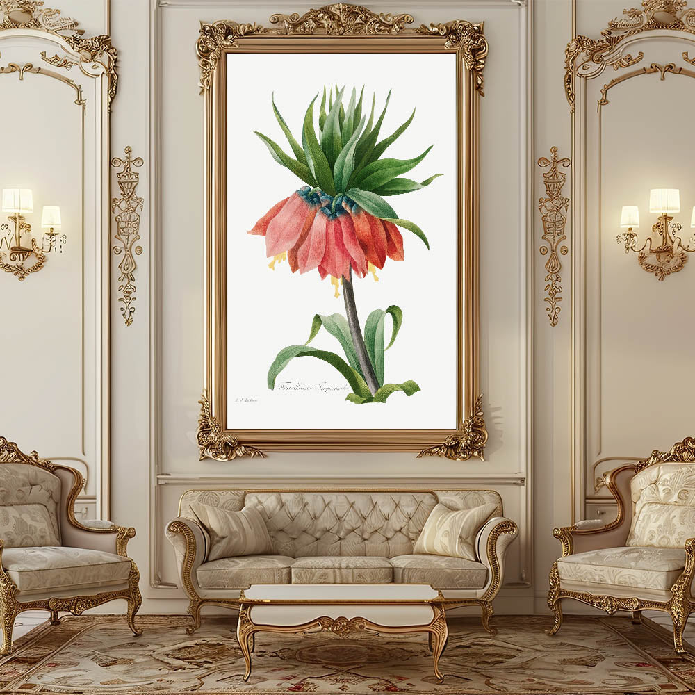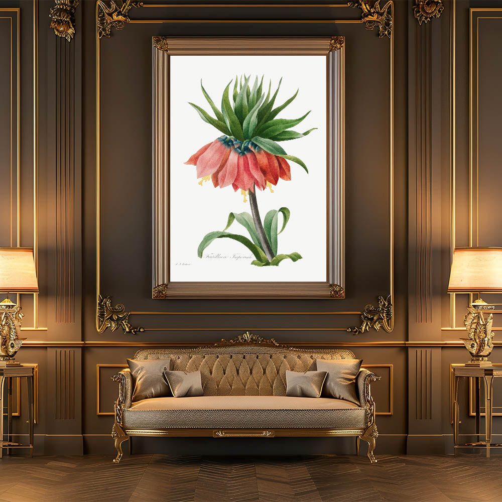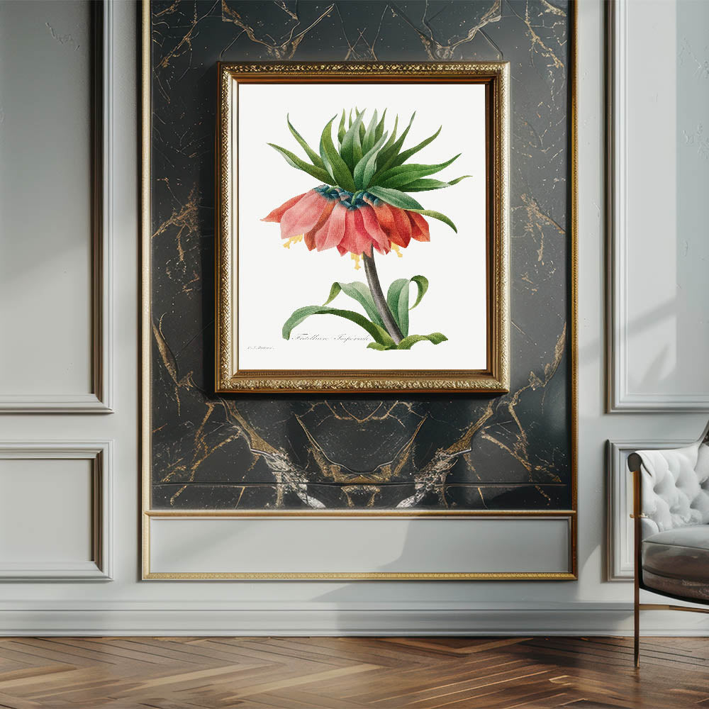 Embrace the vibrant beauty of the Crown Imperial Fritillary with this stunning botanical illustration by Pierre-Joseph Redouté and Henry-Joseph Redouté. Known for his botanical expertise, Redouté captures the exotic allure of this striking flower, with its bright orange-red petals and lush green leaves. This Neoclassical artwork exemplifies the movement’s love for natural beauty and meticulous detail, making it an exquisite addition to any decor inspired by classical antiquity.