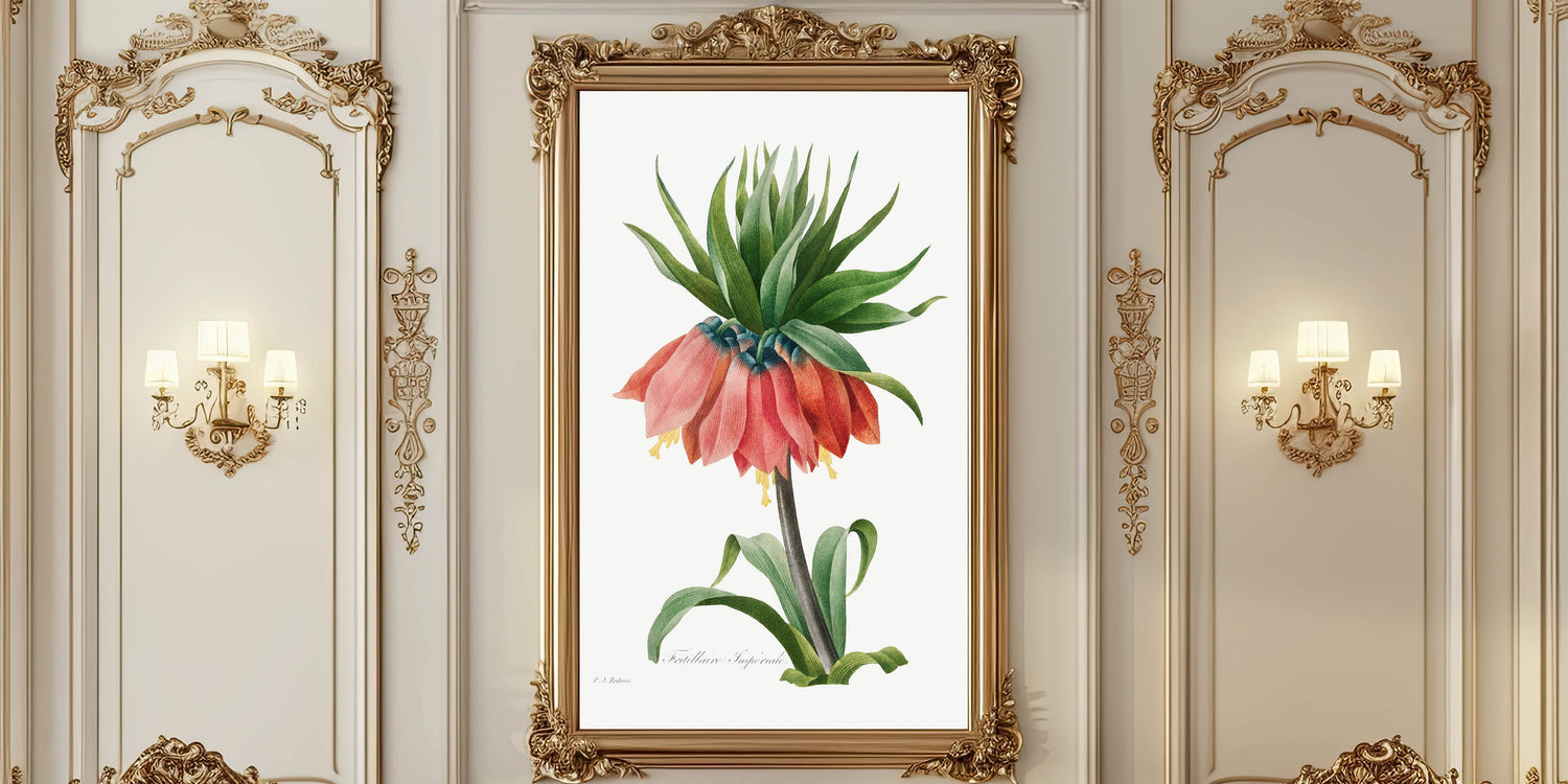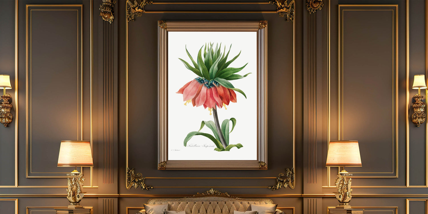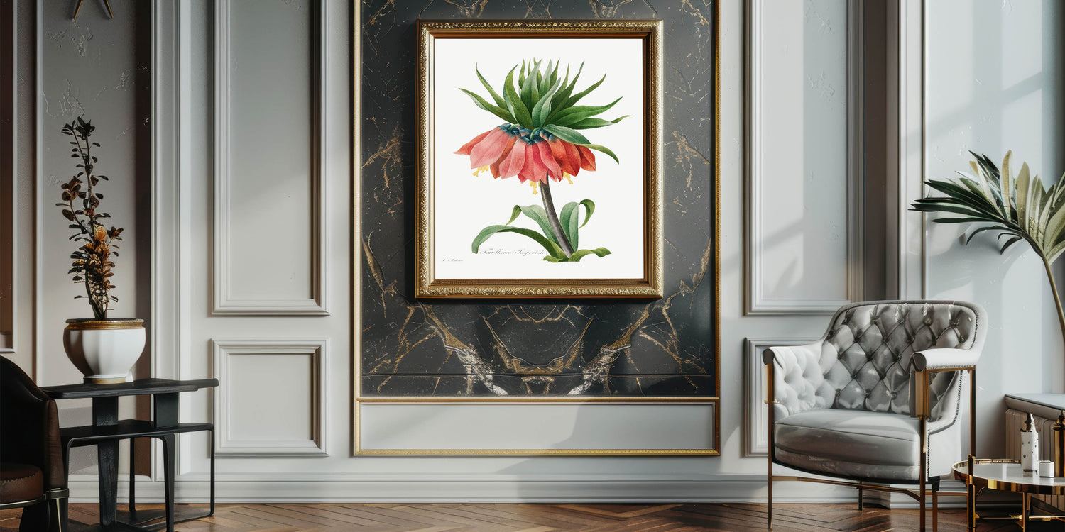 Embrace the vibrant beauty of the Crown Imperial Fritillary with this stunning botanical illustration by Pierre-Joseph Redouté and Henry-Joseph Redouté. Known for his botanical expertise, Redouté captures the exotic allure of this striking flower, with its bright orange-red petals and lush green leaves. This Neoclassical artwork exemplifies the movement’s love for natural beauty and meticulous detail, making it an exquisite addition to any decor inspired by classical antiquity.