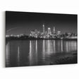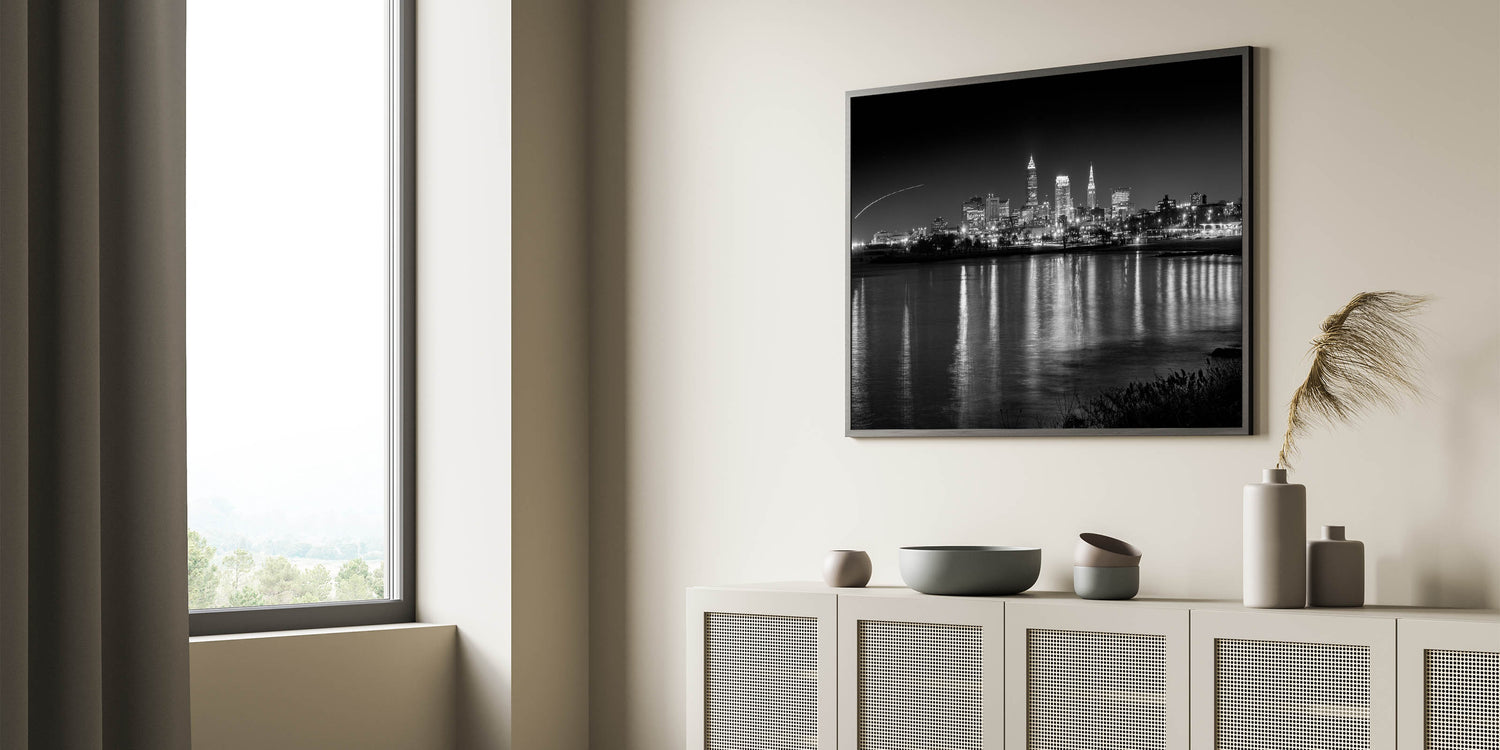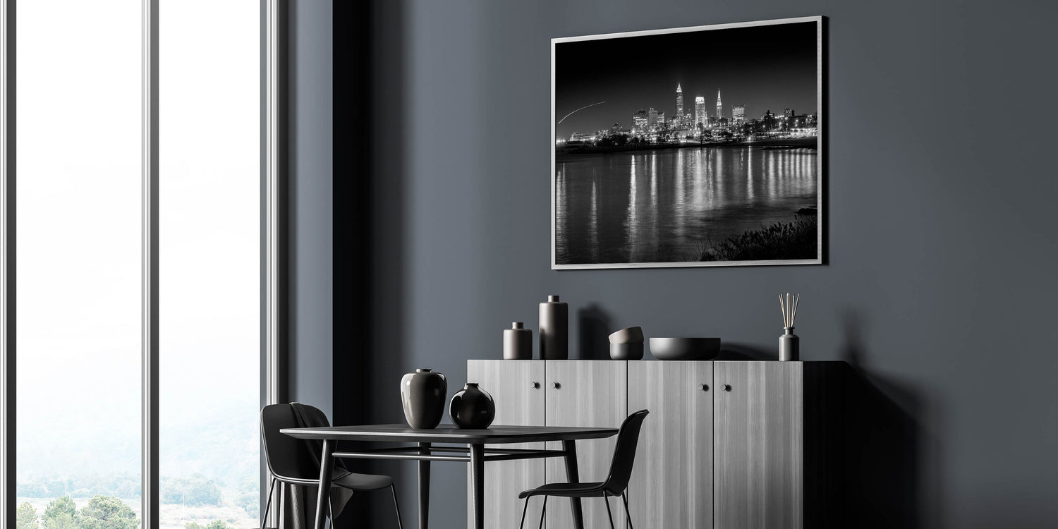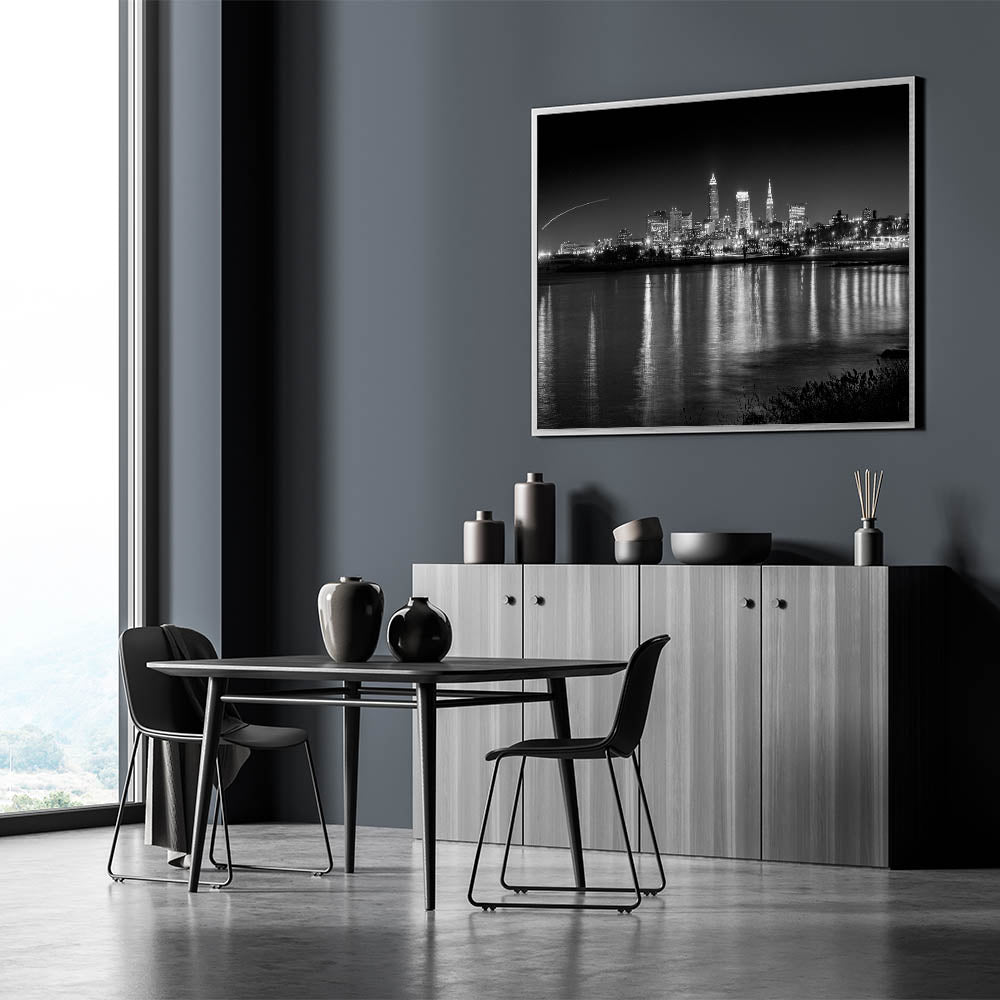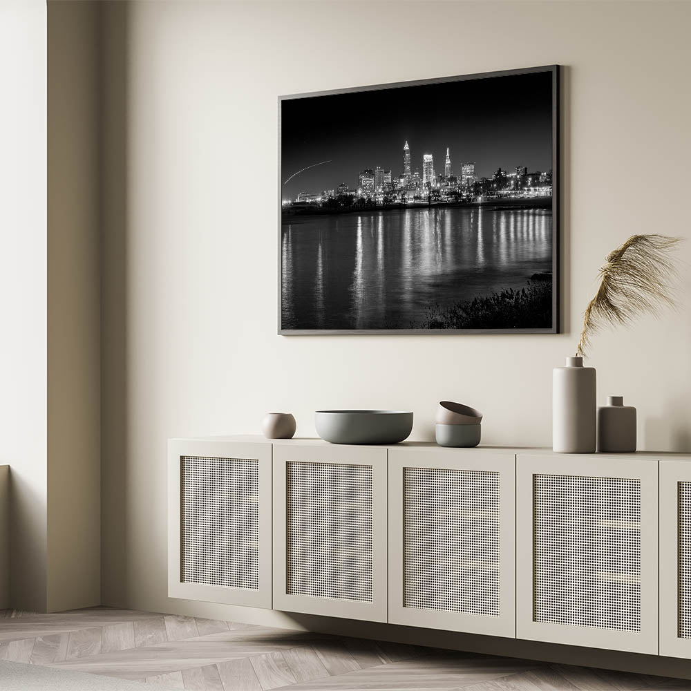Add a touch of nocturnal elegance to your decor with this captivating Cleveland night skyline art. This black-and-white photograph captures the city of Cleveland under the night sky, with its iconic skyline reflecting beautifully off the calm waters of Lake Erie. The contrast between the dark night and the illuminated city lights creates a striking visual, perfect for modern and contemporary interiors.