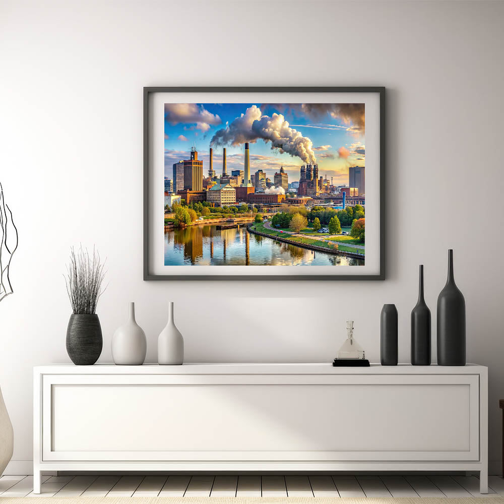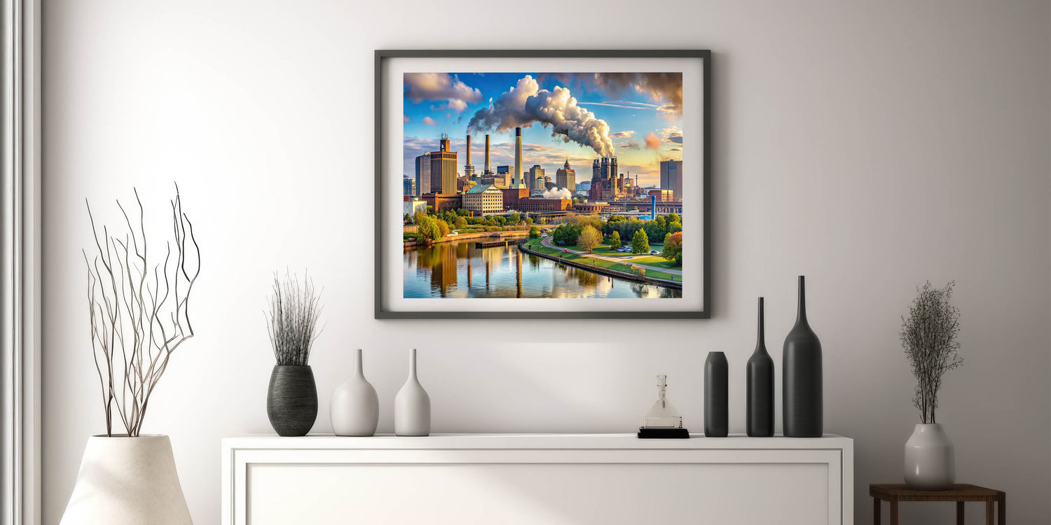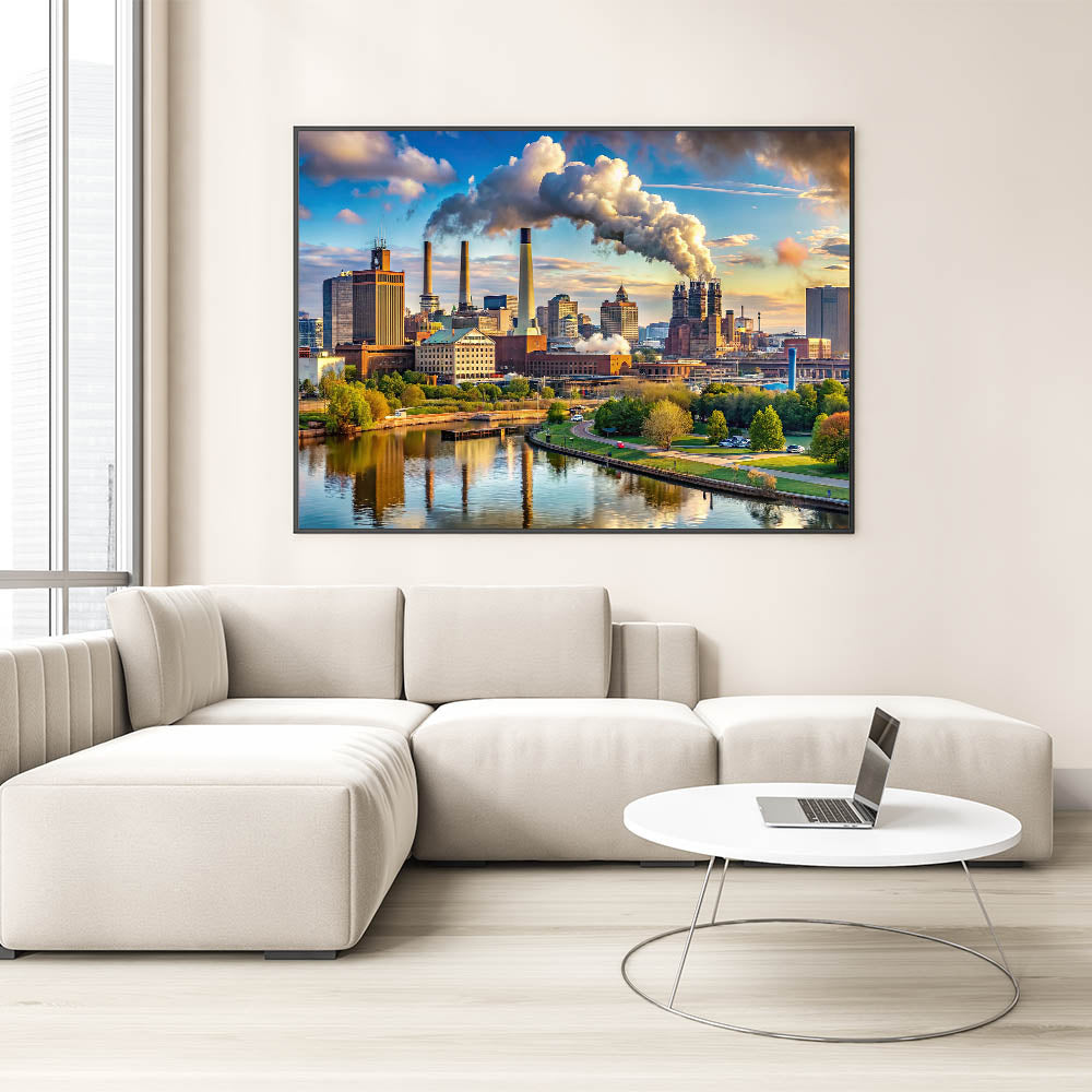 Transform your space with this vibrant Cleveland skyline wall art that captures the industrial heart of the city. This stunning piece showcases Cleveland’s iconic industrial architecture, with smoke rising from the towering chimneys against a backdrop of a colorful sky. The vibrant hues of the sunset contrast beautifully with the rugged urban landscape, creating a dynamic visual experience.