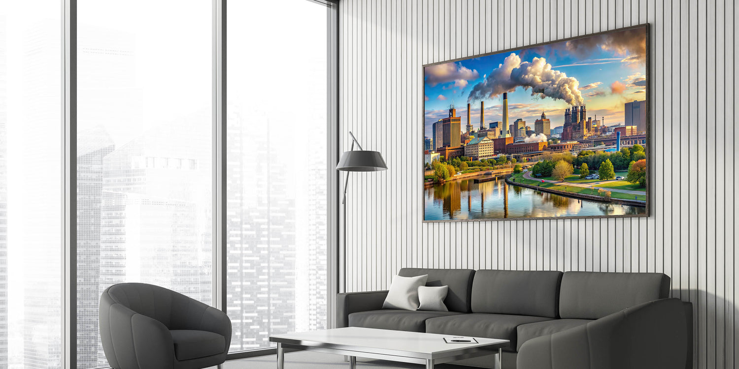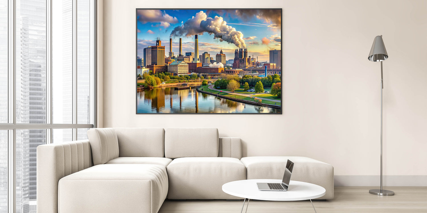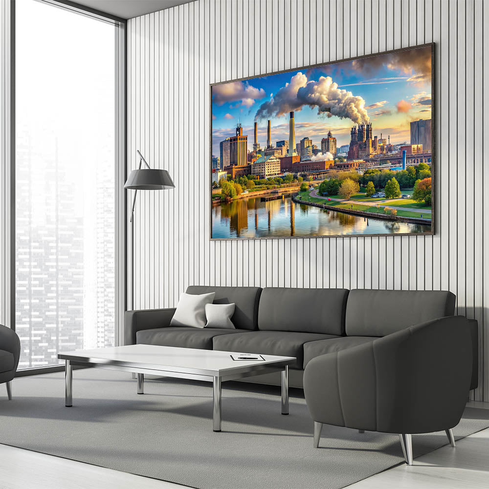Transform your space with this vibrant Cleveland skyline wall art that captures the industrial heart of the city. This stunning piece showcases Cleveland’s iconic industrial architecture, with smoke rising from the towering chimneys against a backdrop of a colorful sky. The vibrant hues of the sunset contrast beautifully with the rugged urban landscape, creating a dynamic visual experience.