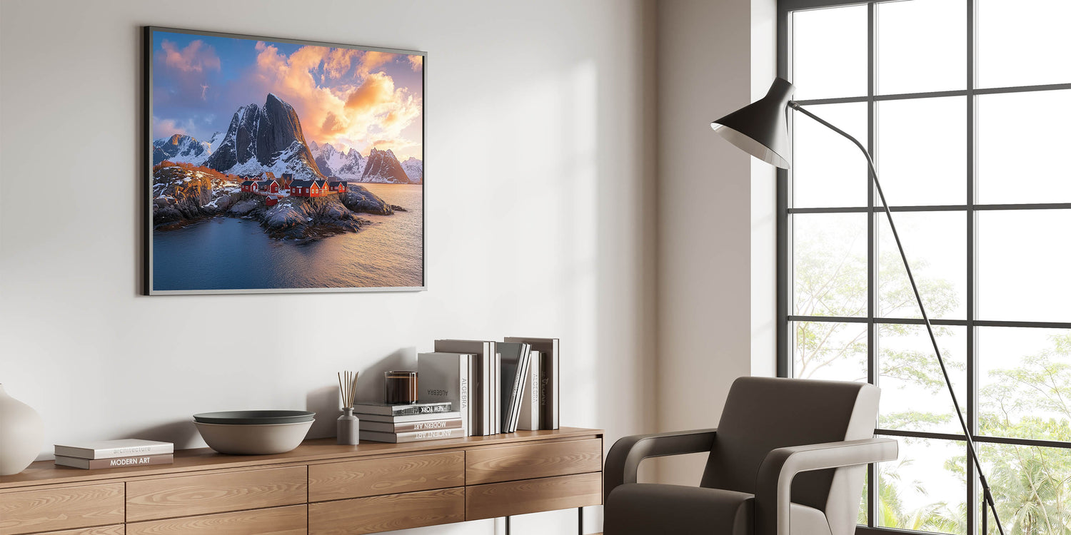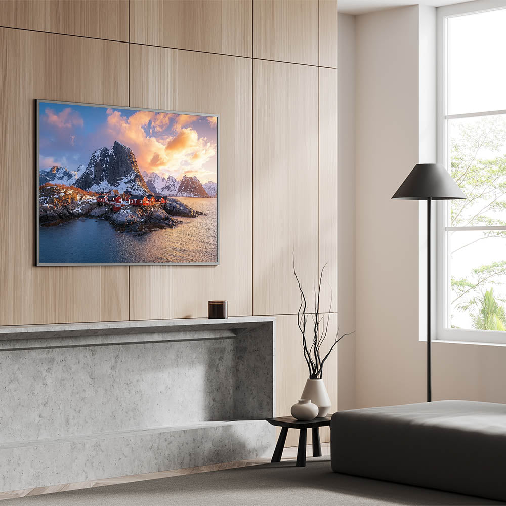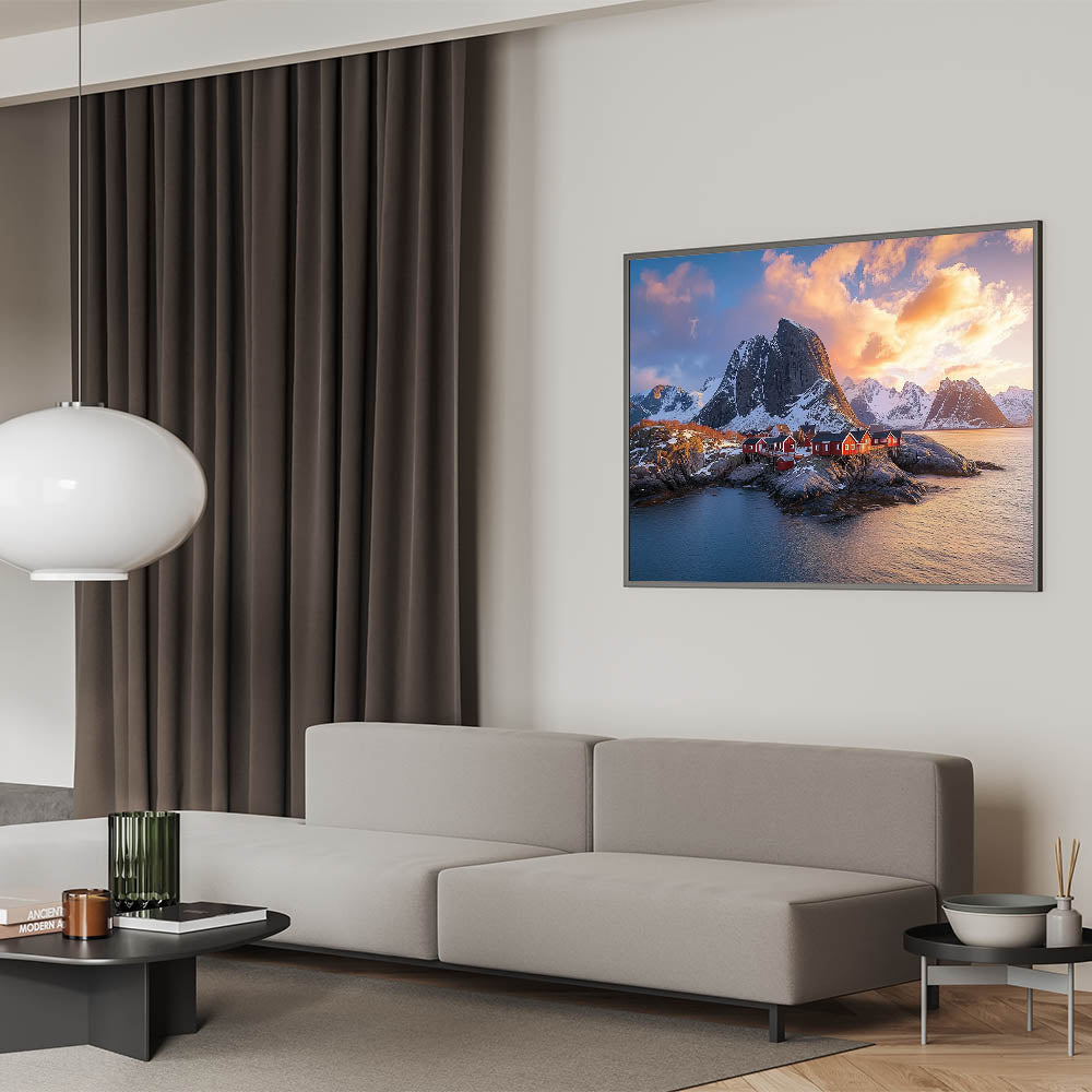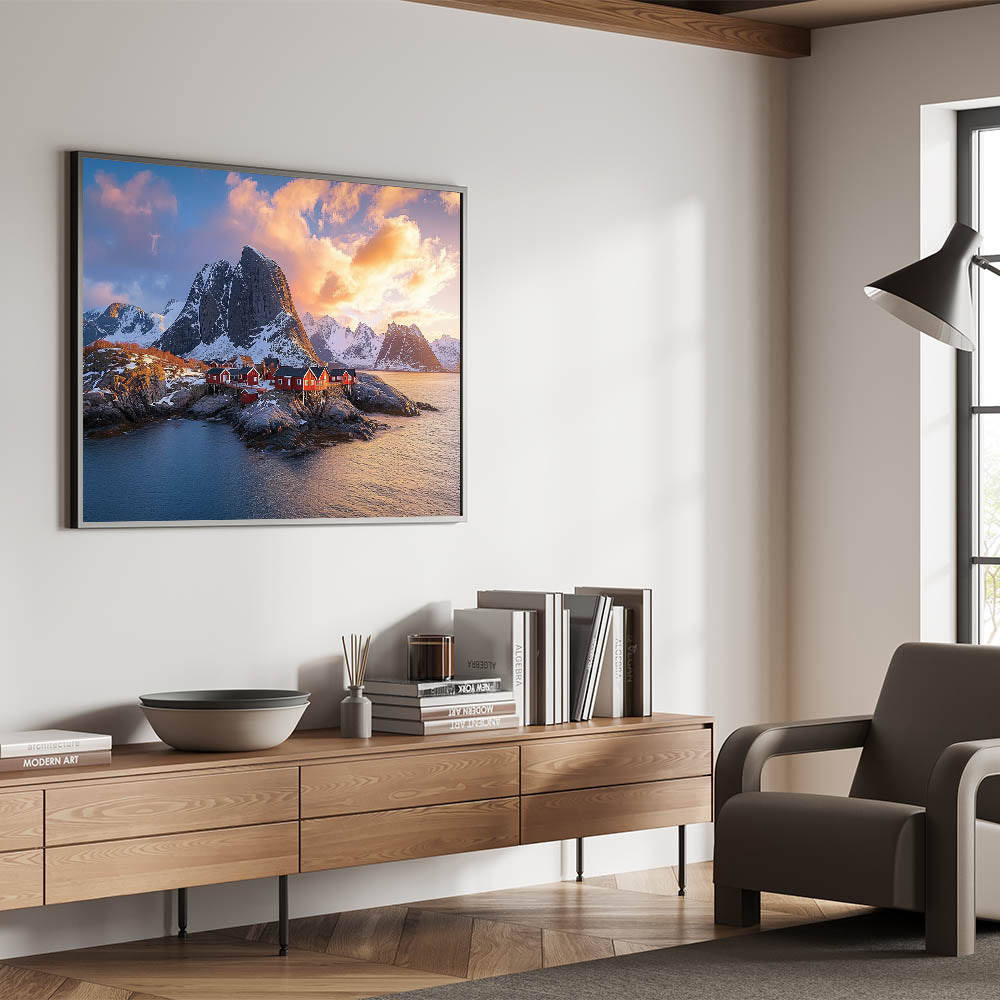 Enhance your home decor with this enchanting Arctic Cliffs Framed Print, featuring a quaint Nordic village framed by dramatic cliffs and illuminated by a mesmerizing sunset. The warm glow of the sky contrasts beautifully with the icy blue waters and snowy peaks, creating a harmonious balance of warmth and coolness.