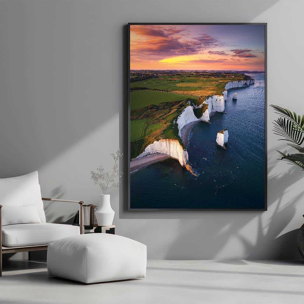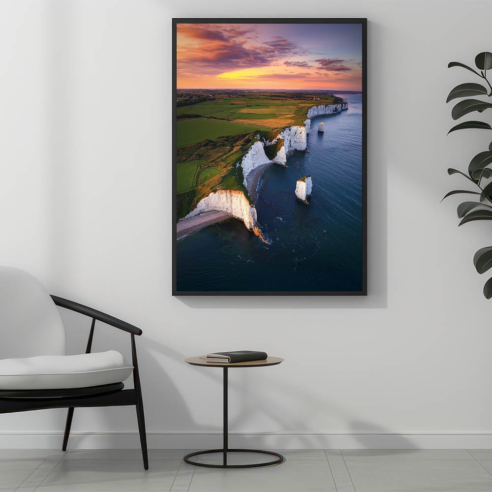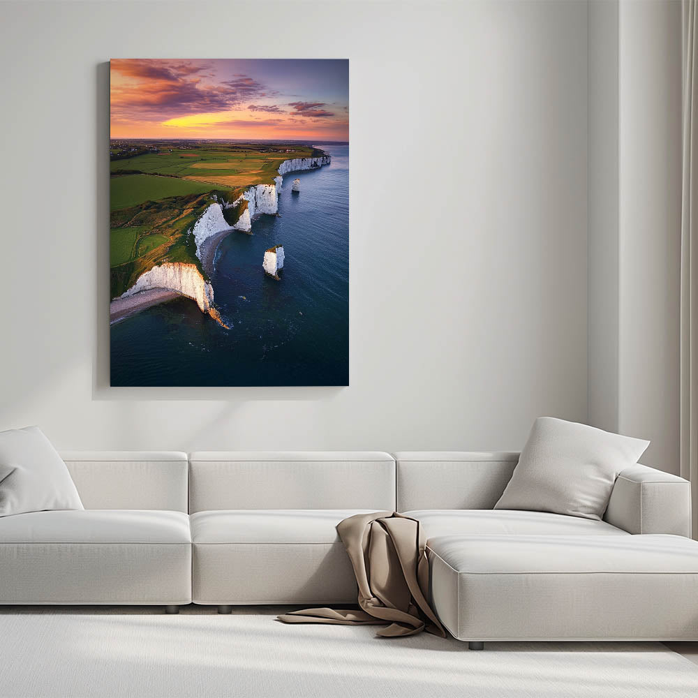 Bring the breathtaking beauty of nature to your home with this Cliffs Canvas Art, showcasing a dramatic sunset over iconic white cliffs. The vivid hues of the setting sun blend seamlessly with the deep blue waters and lush green fields, creating a serene yet captivating coastal scene. This artwork is perfect for adding warmth, color, and sophistication to any room while celebrating the beauty of nature.