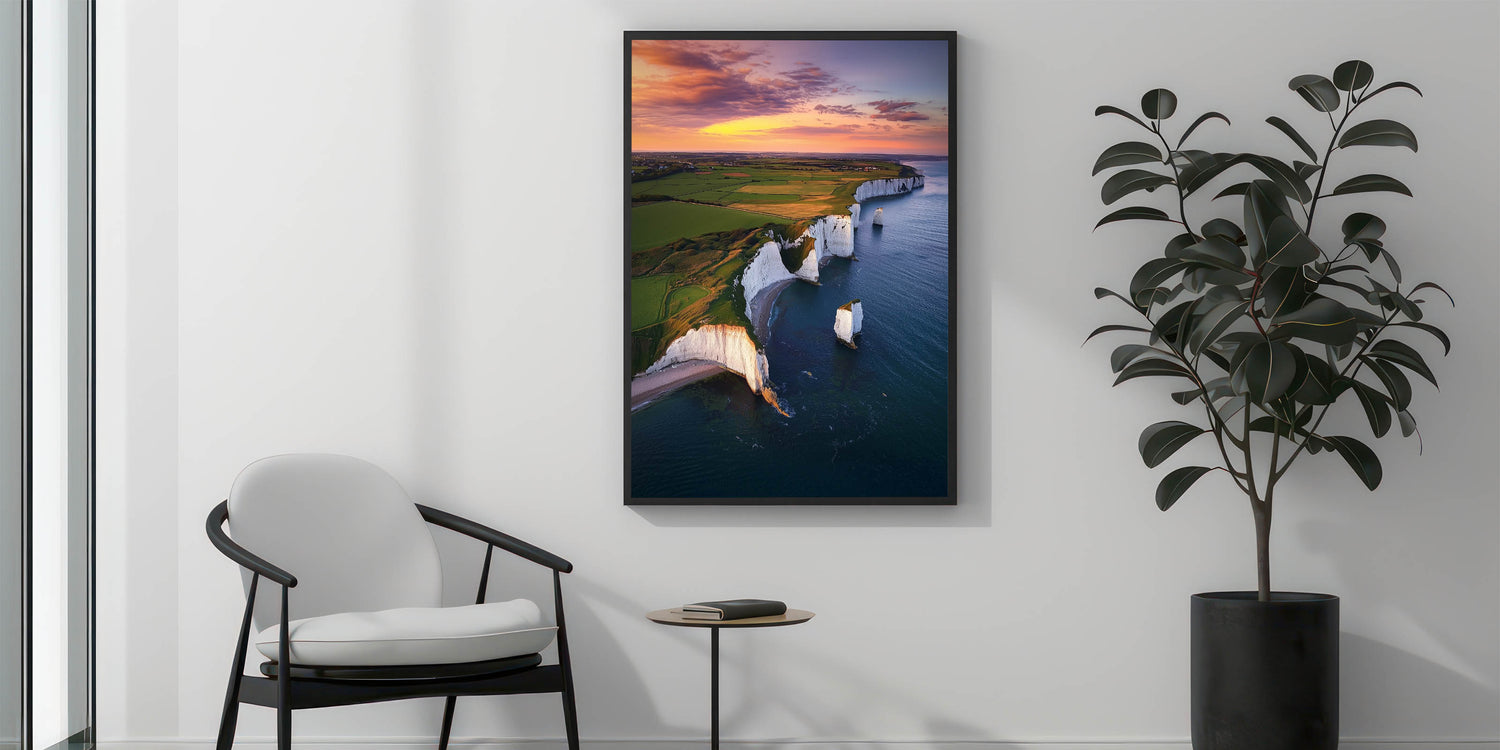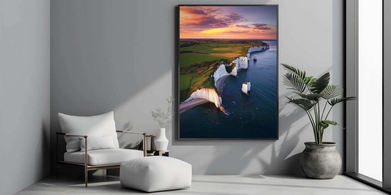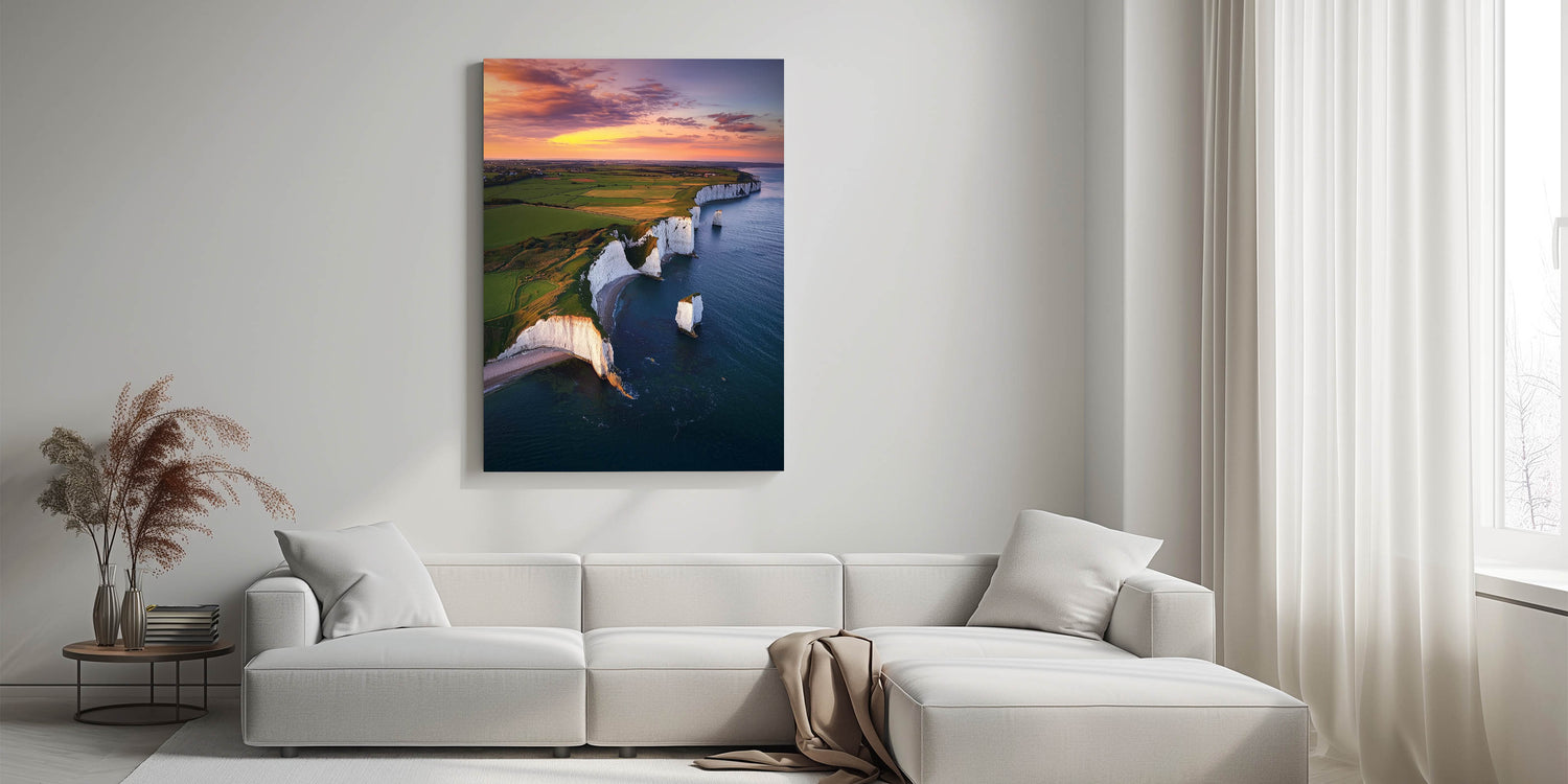 Bring the breathtaking beauty of nature to your home with this Cliffs Canvas Art, showcasing a dramatic sunset over iconic white cliffs. The vivid hues of the setting sun blend seamlessly with the deep blue waters and lush green fields, creating a serene yet captivating coastal scene. This artwork is perfect for adding warmth, color, and sophistication to any room while celebrating the beauty of nature.
