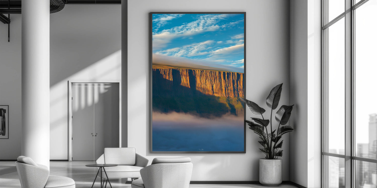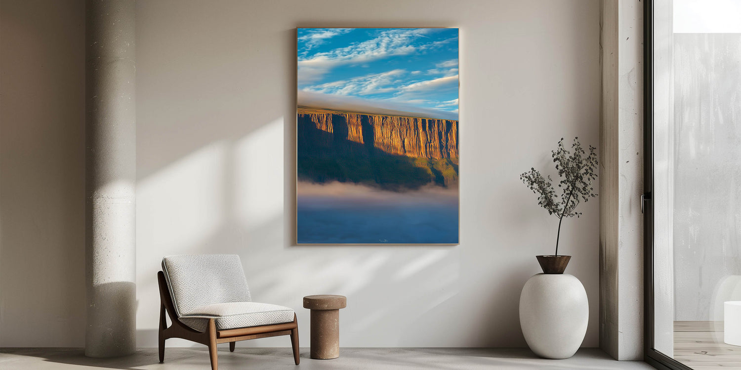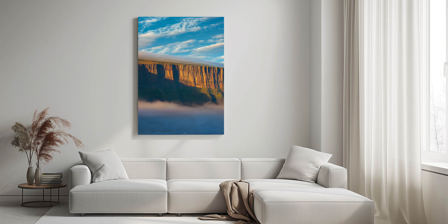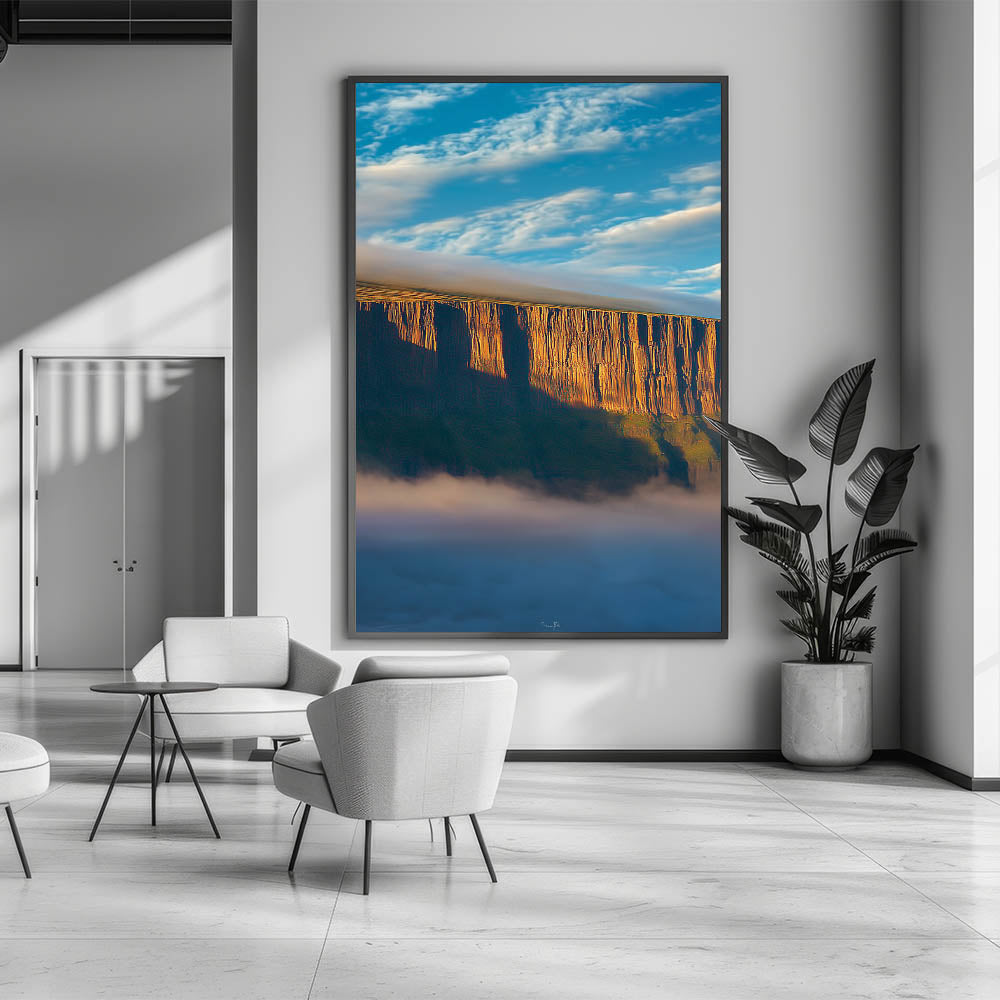 Elevate your space with the serene beauty of this Cliffs Canvas Art, showcasing a breathtaking plateau rising above a sea of mist. This stunning artwork captures the soft hues of the early morning light casting shadows across the majestic cliff face, blending seamlessly with the vibrant blue sky above. Ideal for nature enthusiasts and modern decor lovers, this piece brings a sense of calm and wonder to any interior.