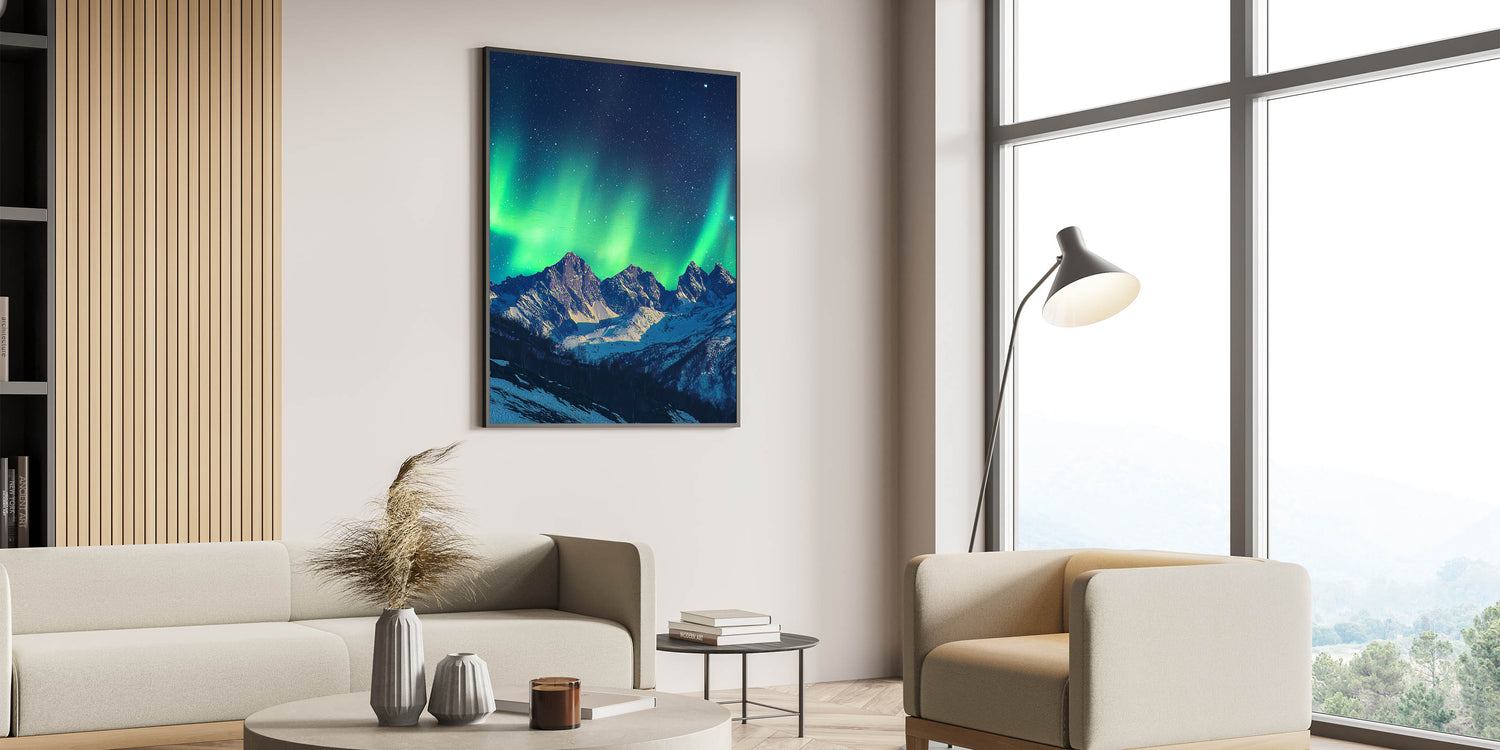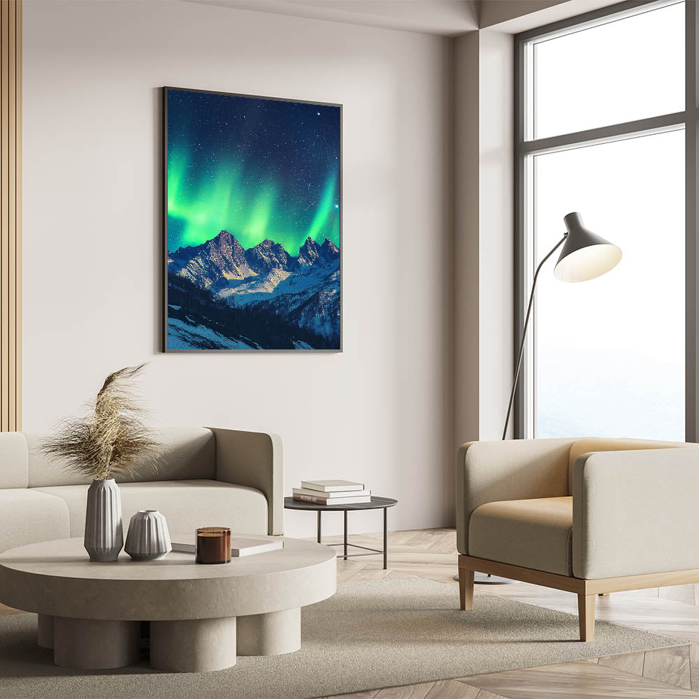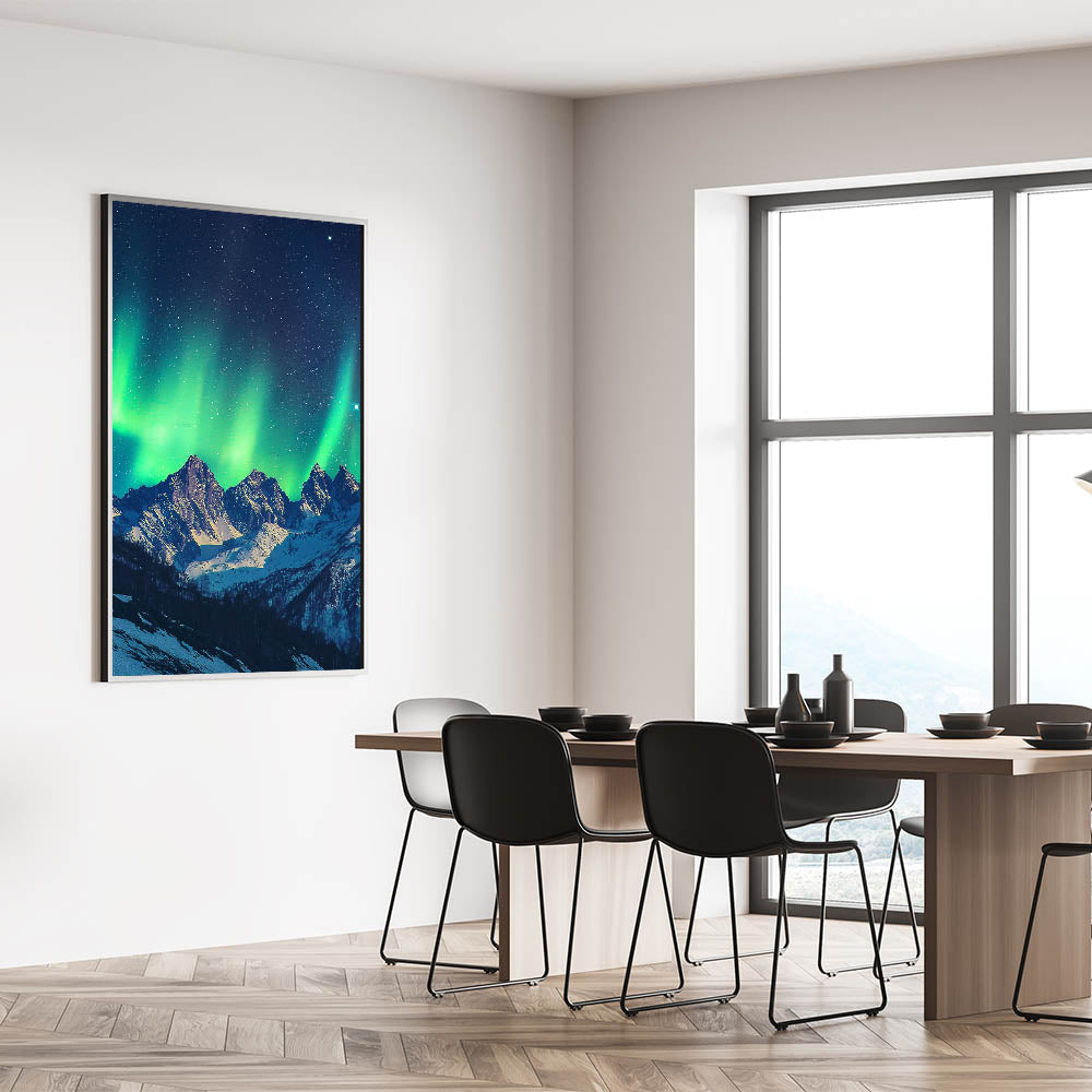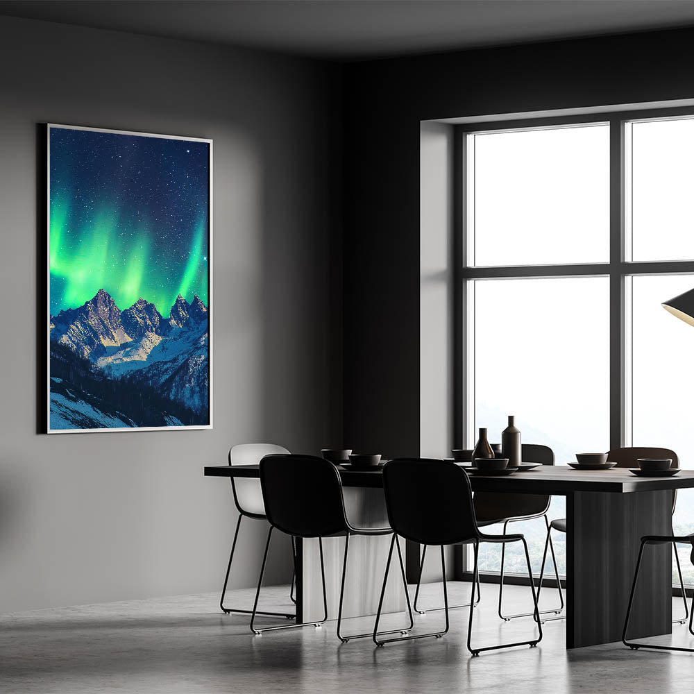 Capture the magic of the night sky with this cliffs canvas art showcasing the Northern Lights dancing over majestic snow-capped cliffs. The ethereal green hues of the aurora borealis, contrasted against the dark starry sky and snowy peaks, create a mesmerizing and tranquil scene.