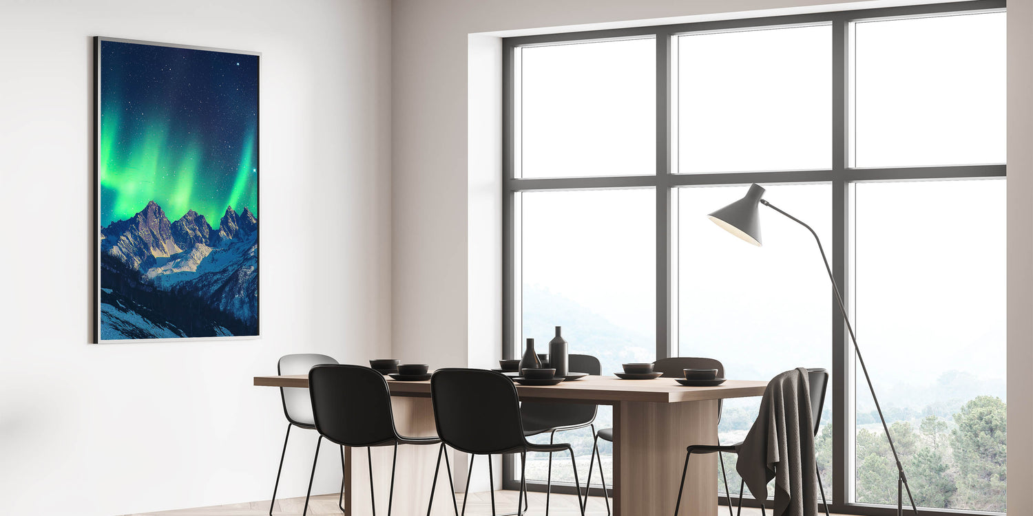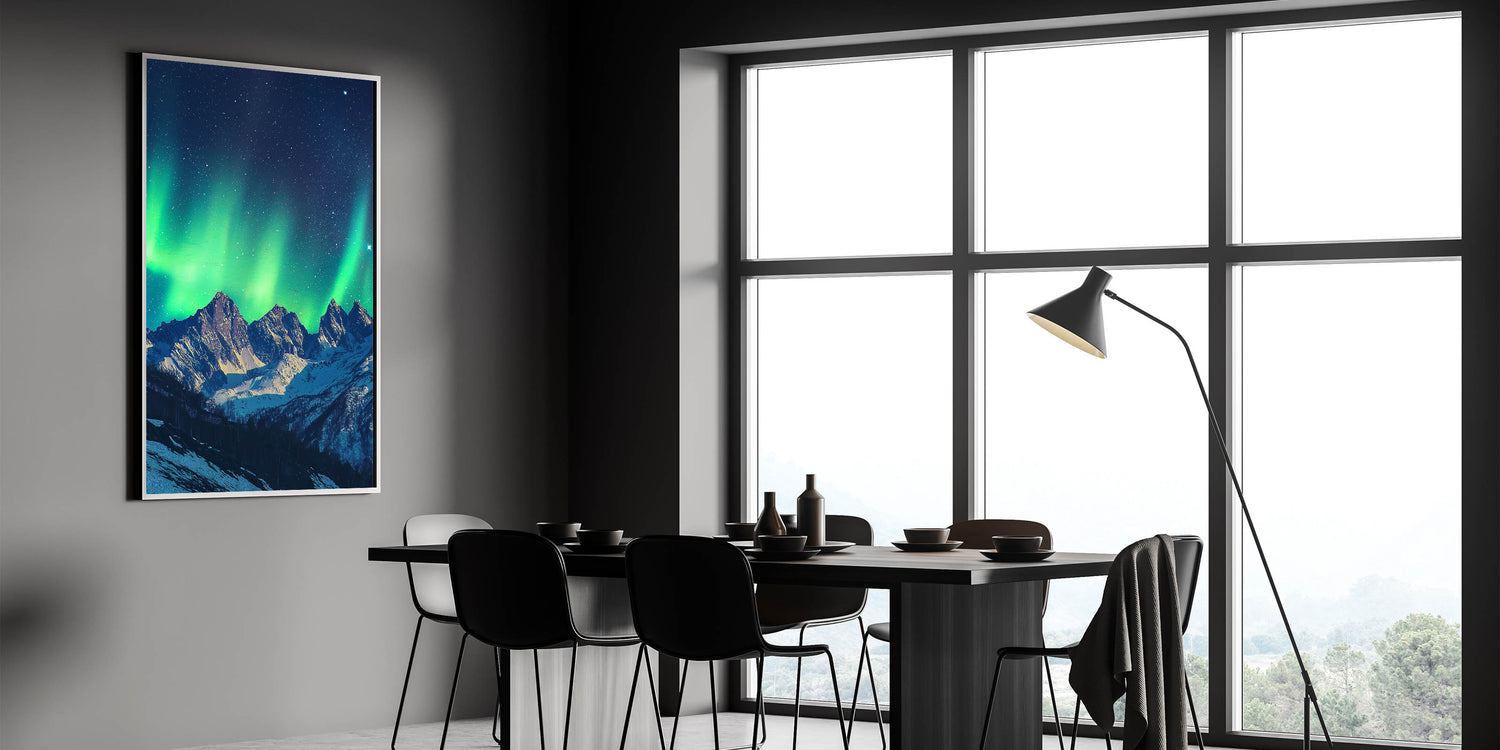 This decorative cliffs print is ideal for anyone inspired by the wonders of nature. The breathtaking scene of the aurora borealis and rugged cliffs makes it a stunning centerpiece for any space. Add this scenic cliffs artwork to your collection and let its serene beauty transform your decor.
