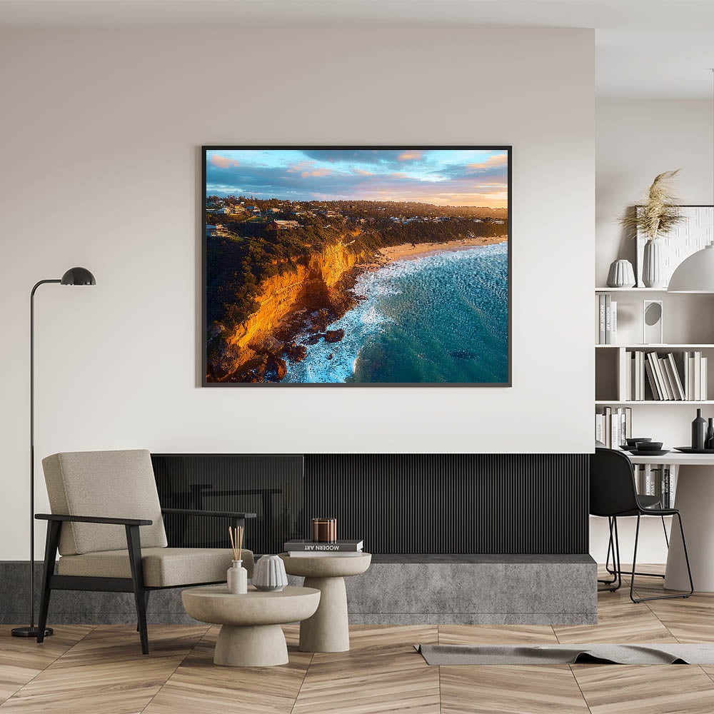Bring the warmth of a stunning sunset into your home with this Cliffs Canvas Art, featuring glowing coastal cliffs and the serene ocean. The golden hues of sunlight on the rugged cliffs blend harmoniously with the deep blue waves, creating a breathtaking composition. This artwork captures the natural beauty of coastal landscapes, perfect for enhancing living rooms, bedrooms, or offices with a sense of calm and sophistication.