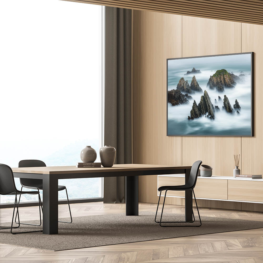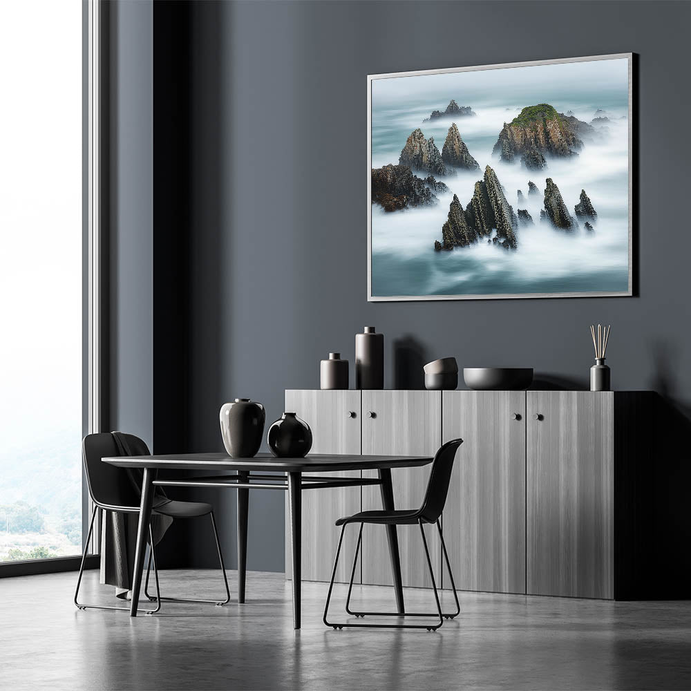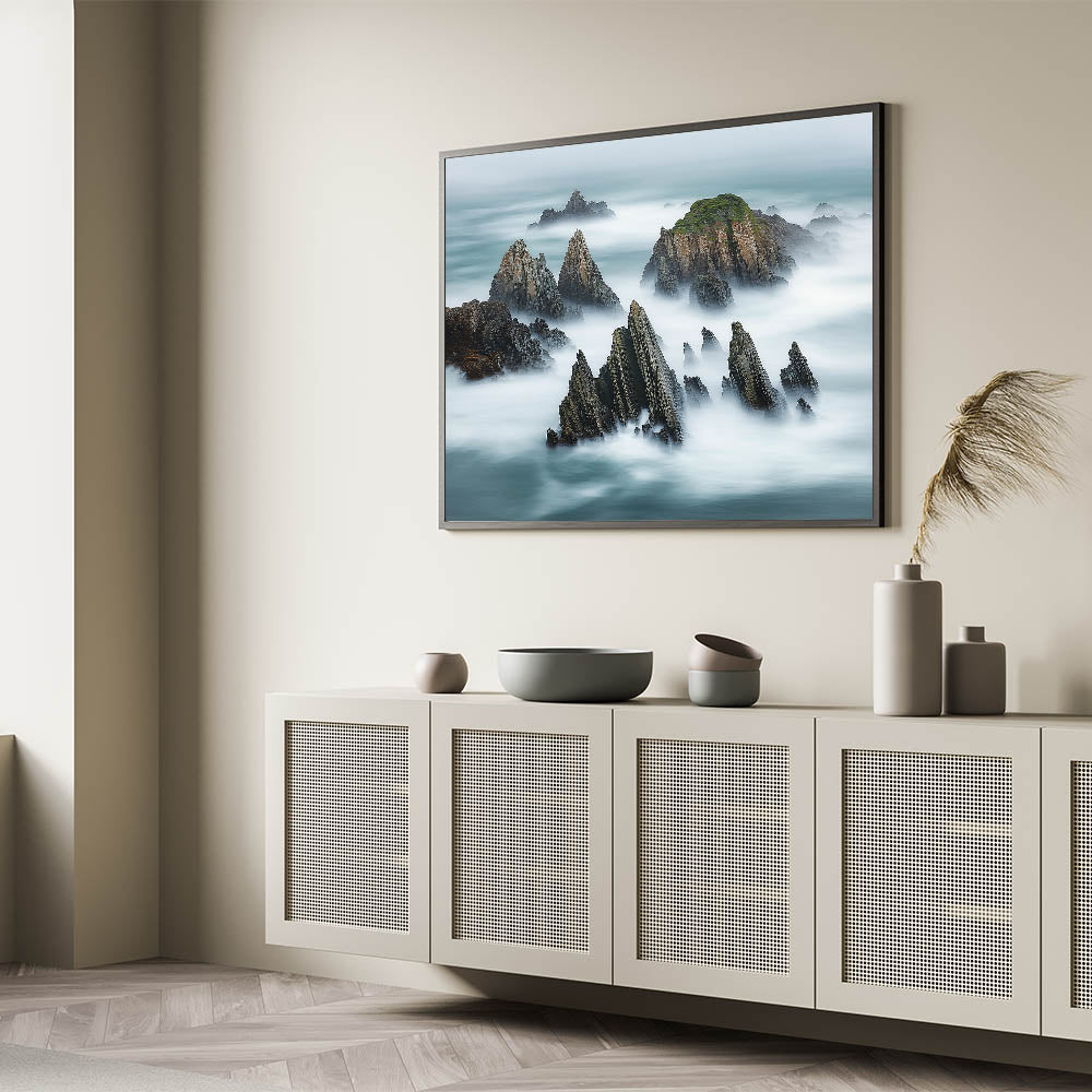 Immerse yourself in the tranquil beauty of this Cliffs Framed Print, featuring jagged coastal cliffs surrounded by misty ocean waves. This mesmerizing artwork captures the interplay of rugged rock formations and soft, flowing waters, evoking a sense of calm and wonder. Perfect for those who love coastal landscapes or dream of serene seascapes.