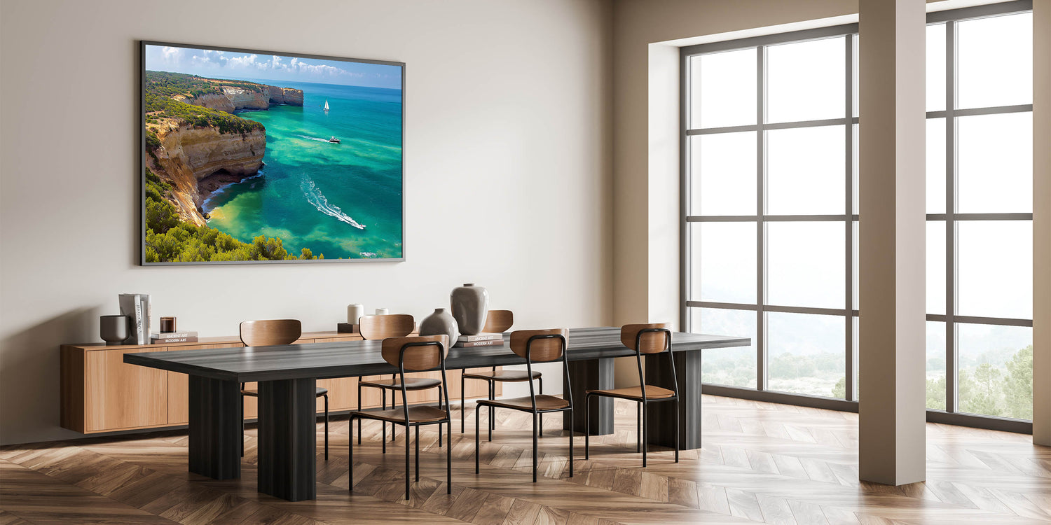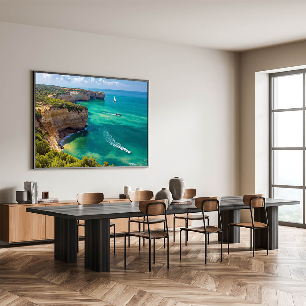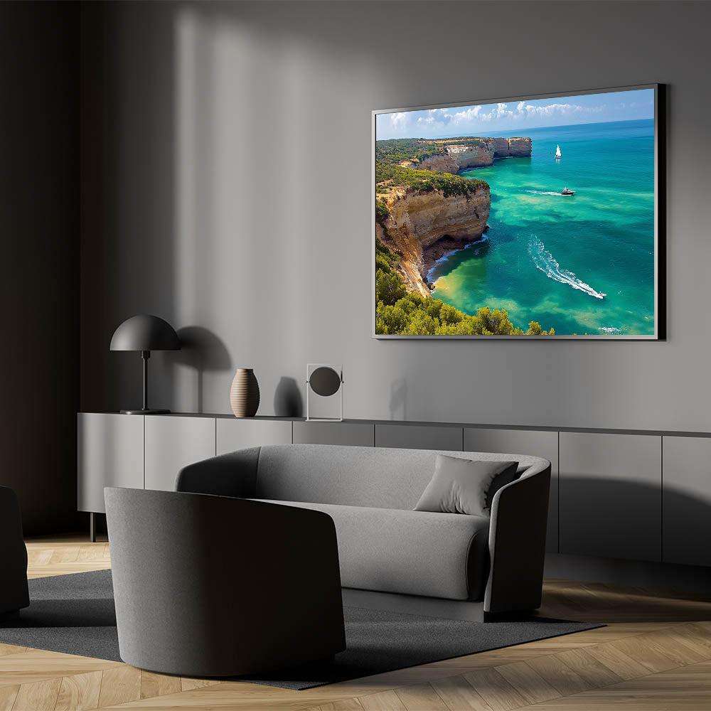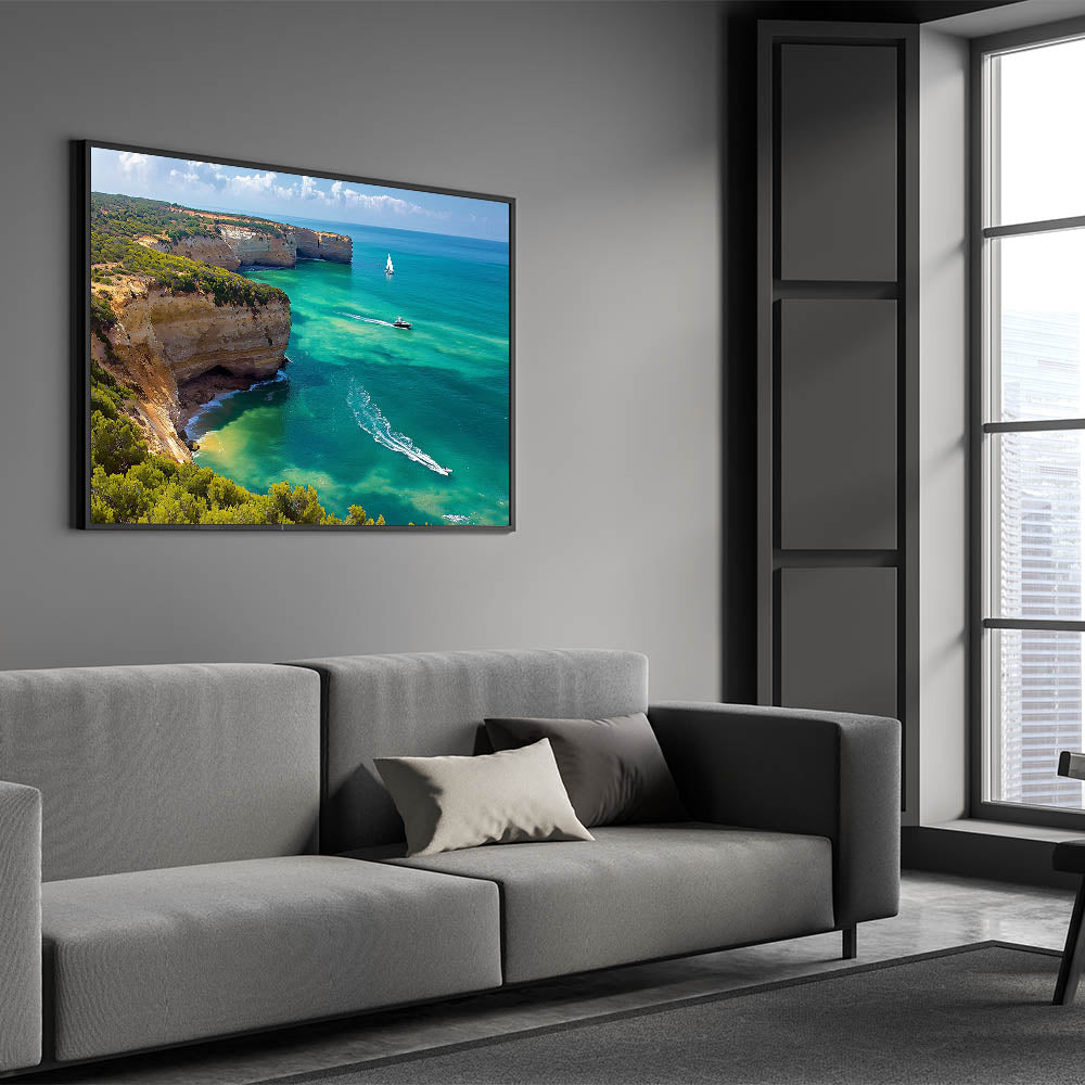 Transform your walls with the captivating beauty of this Cliffs Framed Print. Featuring a vibrant coastal cove with dramatic cliffs and crystal-clear turquoise waters, this artwork brings the refreshing essence of the ocean into your home. The lush greenery along the cliffs adds a touch of natural vibrancy, while the gentle waves and sailing boats create a serene, dynamic composition.