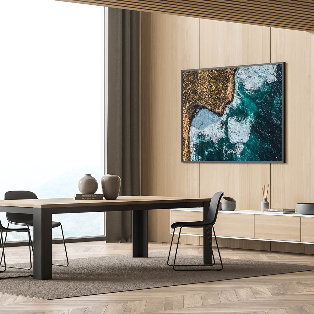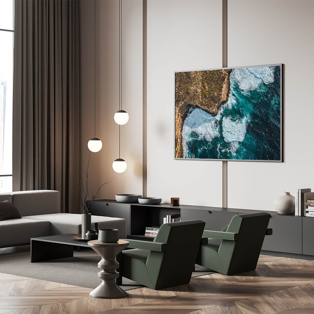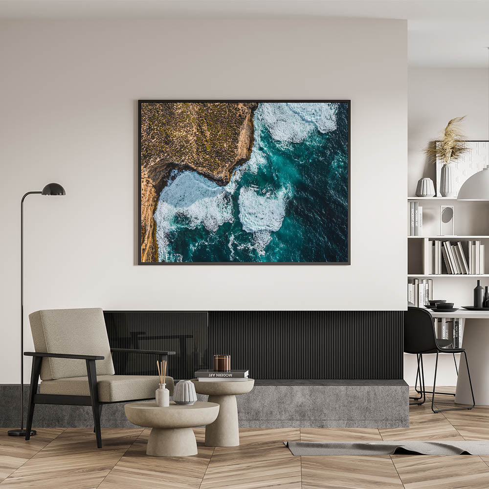 Add a touch of dramatic elegance to your home with this Cliffs Wall Art, featuring an aerial view of rugged coastal cliffs surrounded by powerful waves. The striking contrast between the textured rocky terrain and the vibrant blue ocean captures the untamed beauty of nature. Perfect for adding energy and sophistication to living spaces, this piece resonates with both adventure and tranquility.